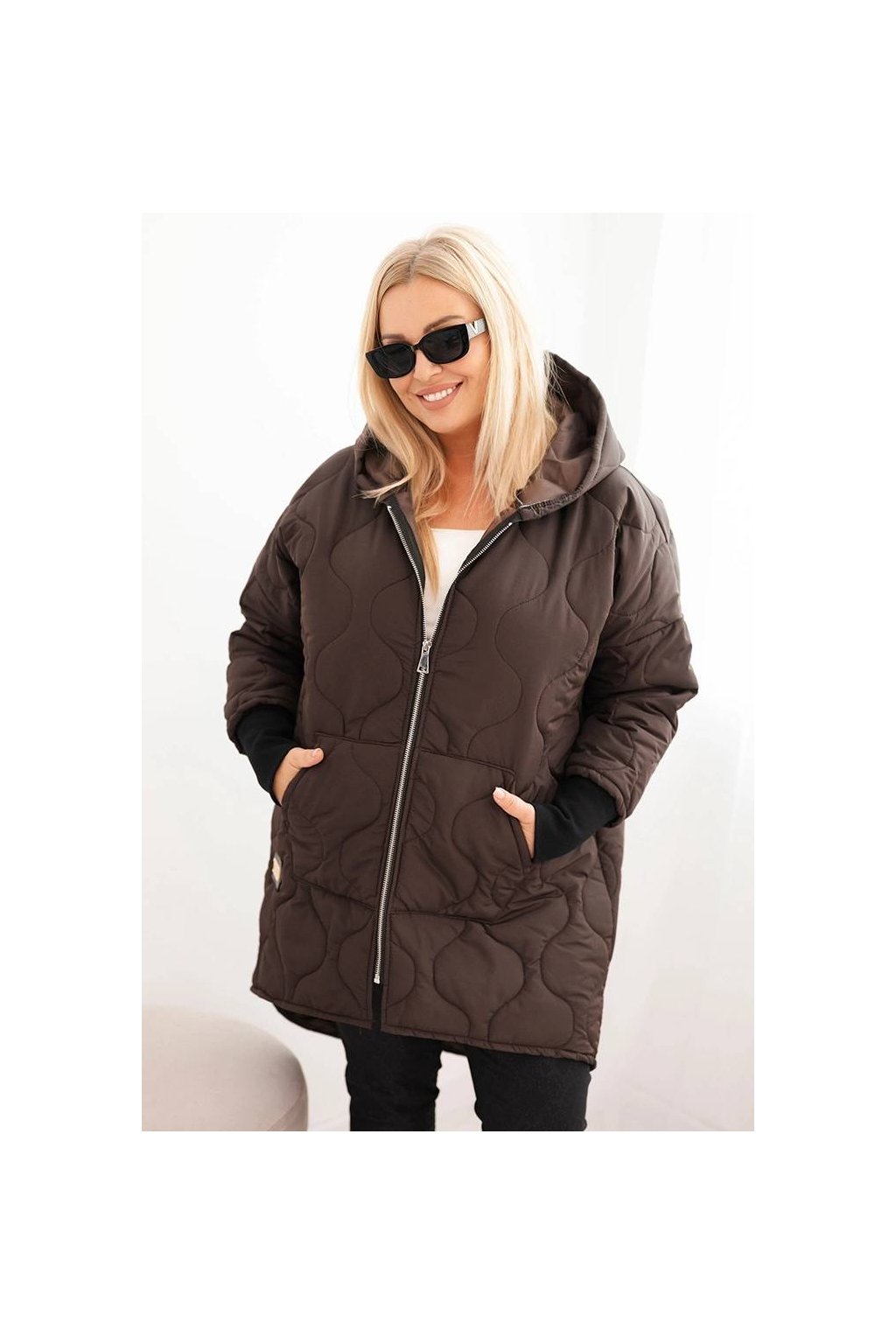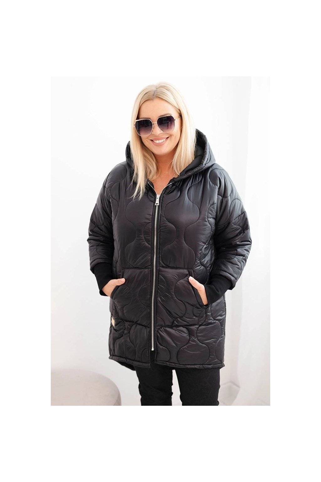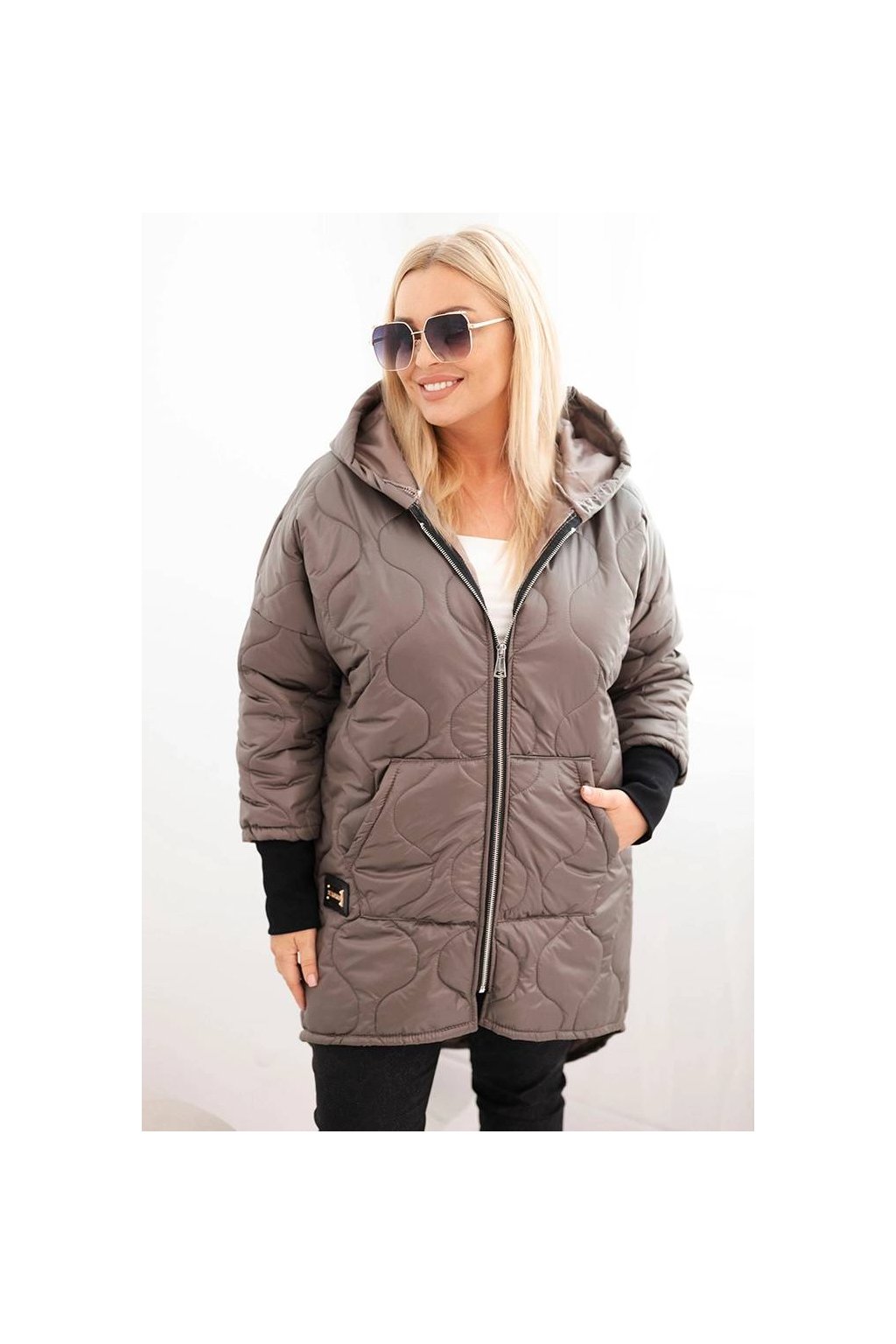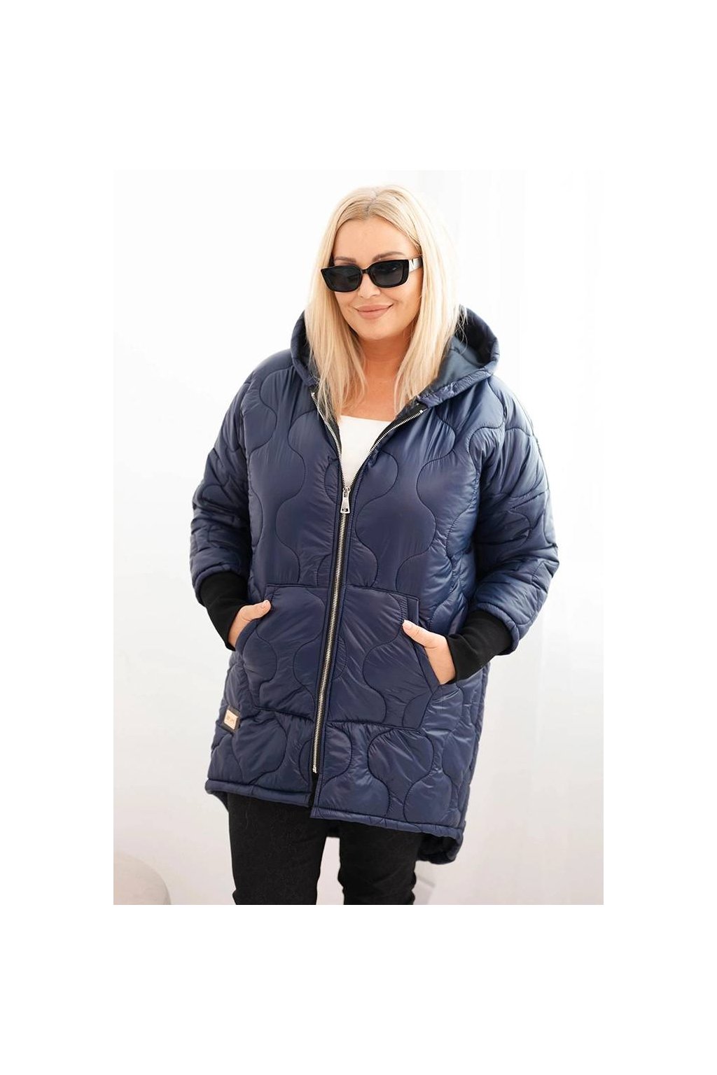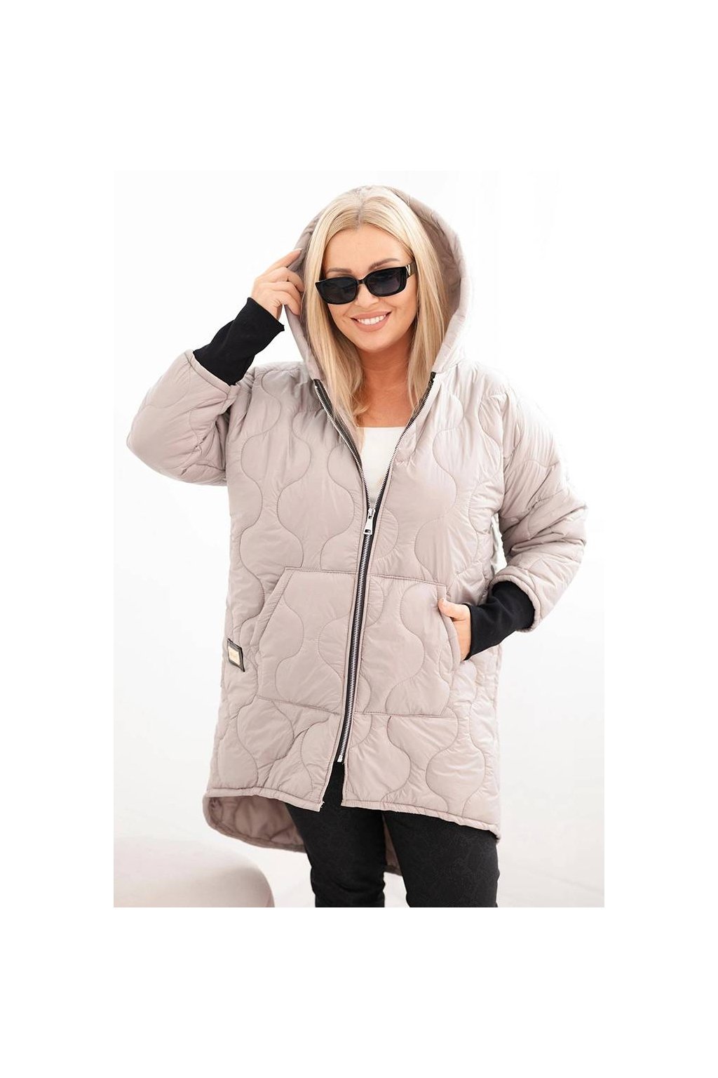 Teplá a stylová dámská bunda Plus Size s moderním, asymetrickým střihem a prodlouženým zadním dílem. Model vyrobený z prošívaného materiálu, ideální na chladnější dny. Má praktickou kapuci, zapínání na zip a pohodlné stahování na rukávech. Skvěle se hodí do každodenních stylizací – jak k kalhotám, tak k legínám.