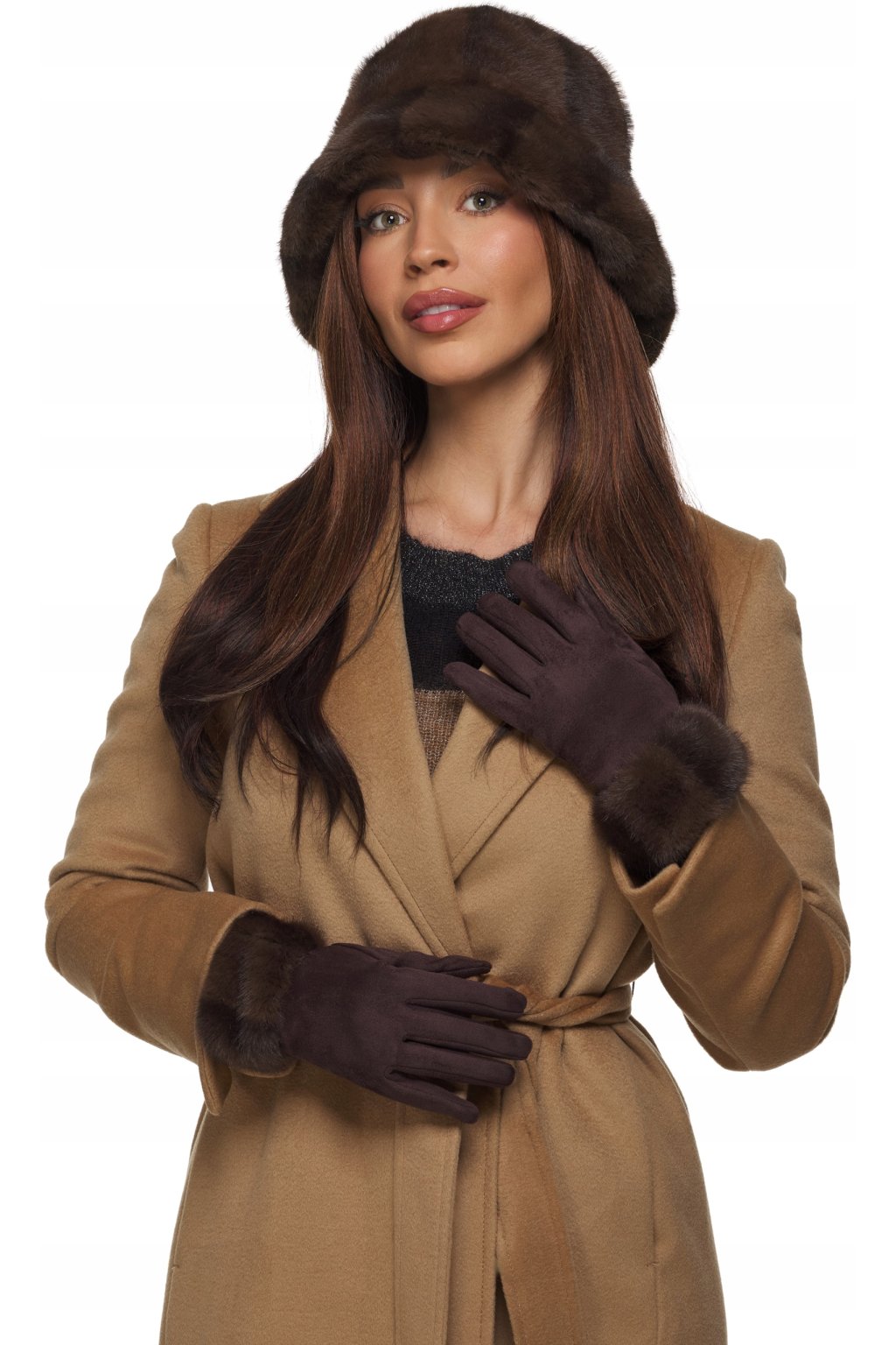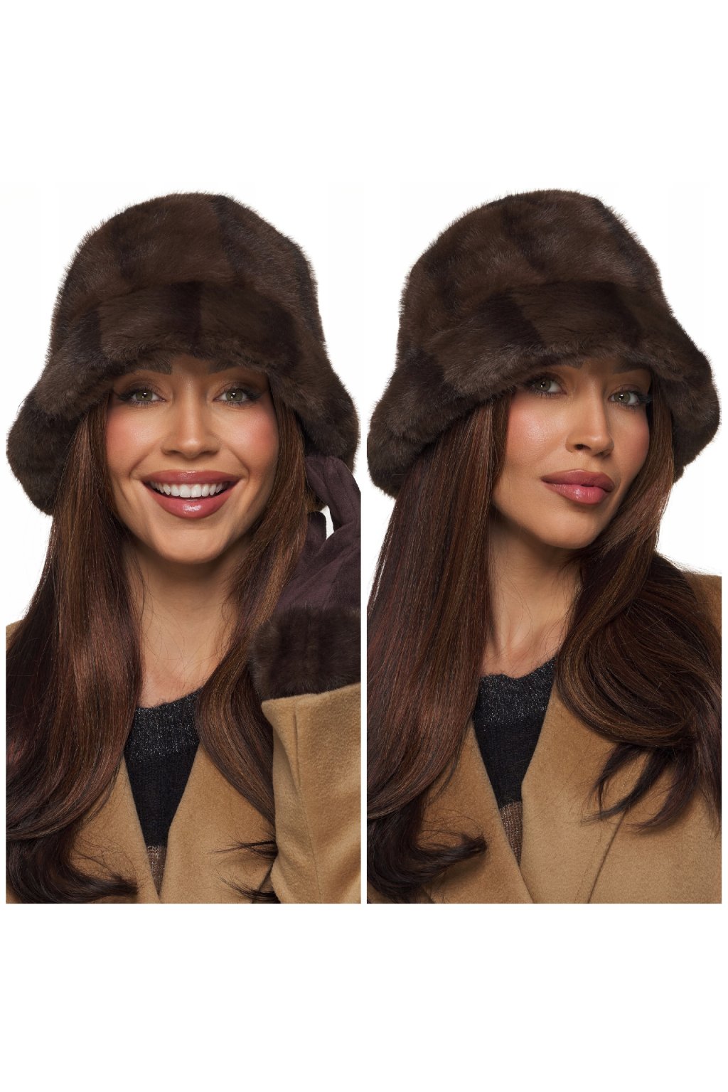 Dámský klobouk typu bucket hat vyrobený z hebkého, hustého umělého kožíšku ve dvou odstínech hnědé.