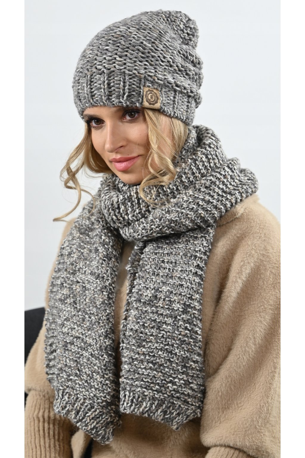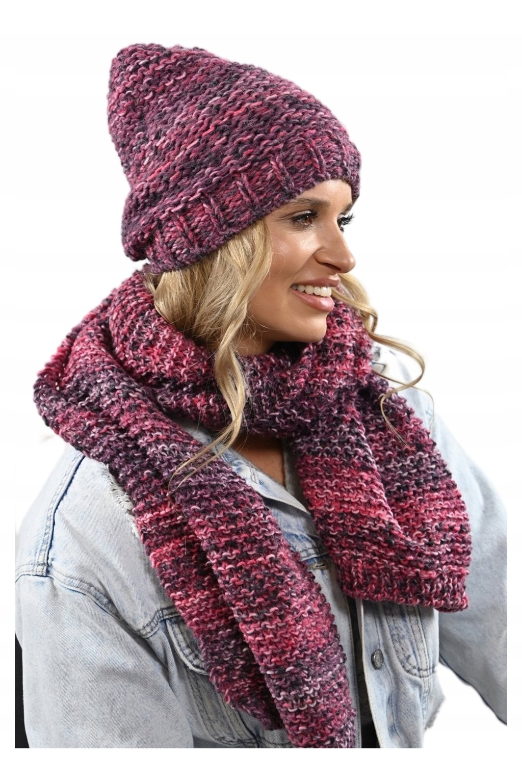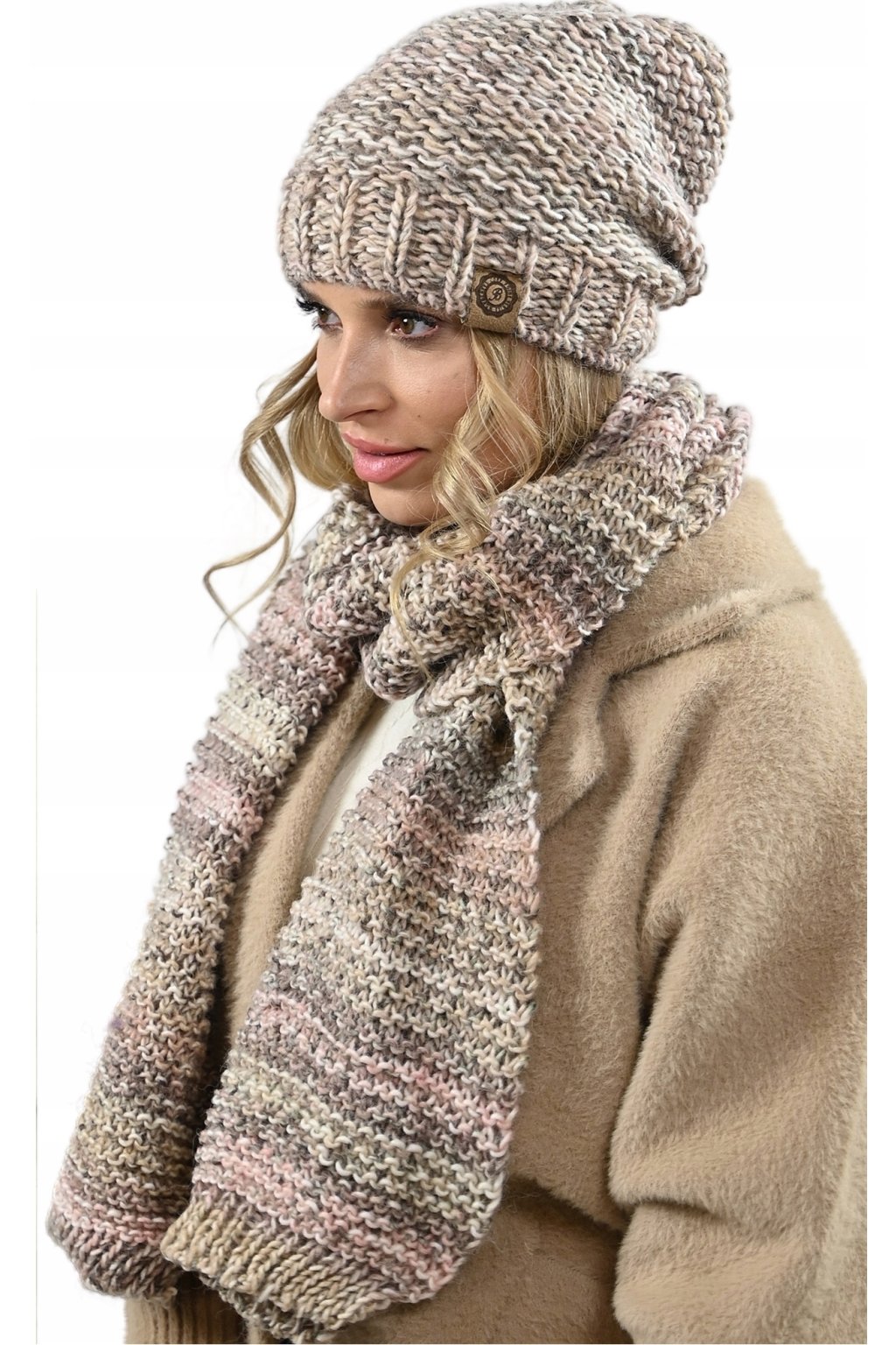Dámský komplet čepice a šály s hrubou vazbou. Čepice a šála jsou vyrobeny z jemné a hřejivé alpakové vlny, která je známá svou trvanlivostí a odolností. Čepice má klasický tvar a je zdobena neobvyklou vícebarevnou kombinací, která z ní činí skutečné umělecké dílo. Šála je dlouhá a široká, takže se dá nosit různými způsoby.