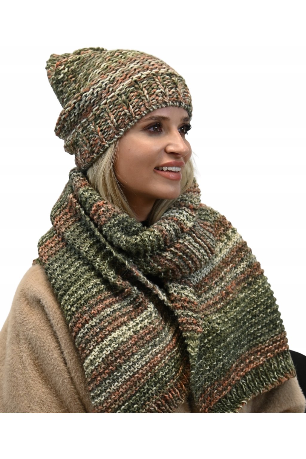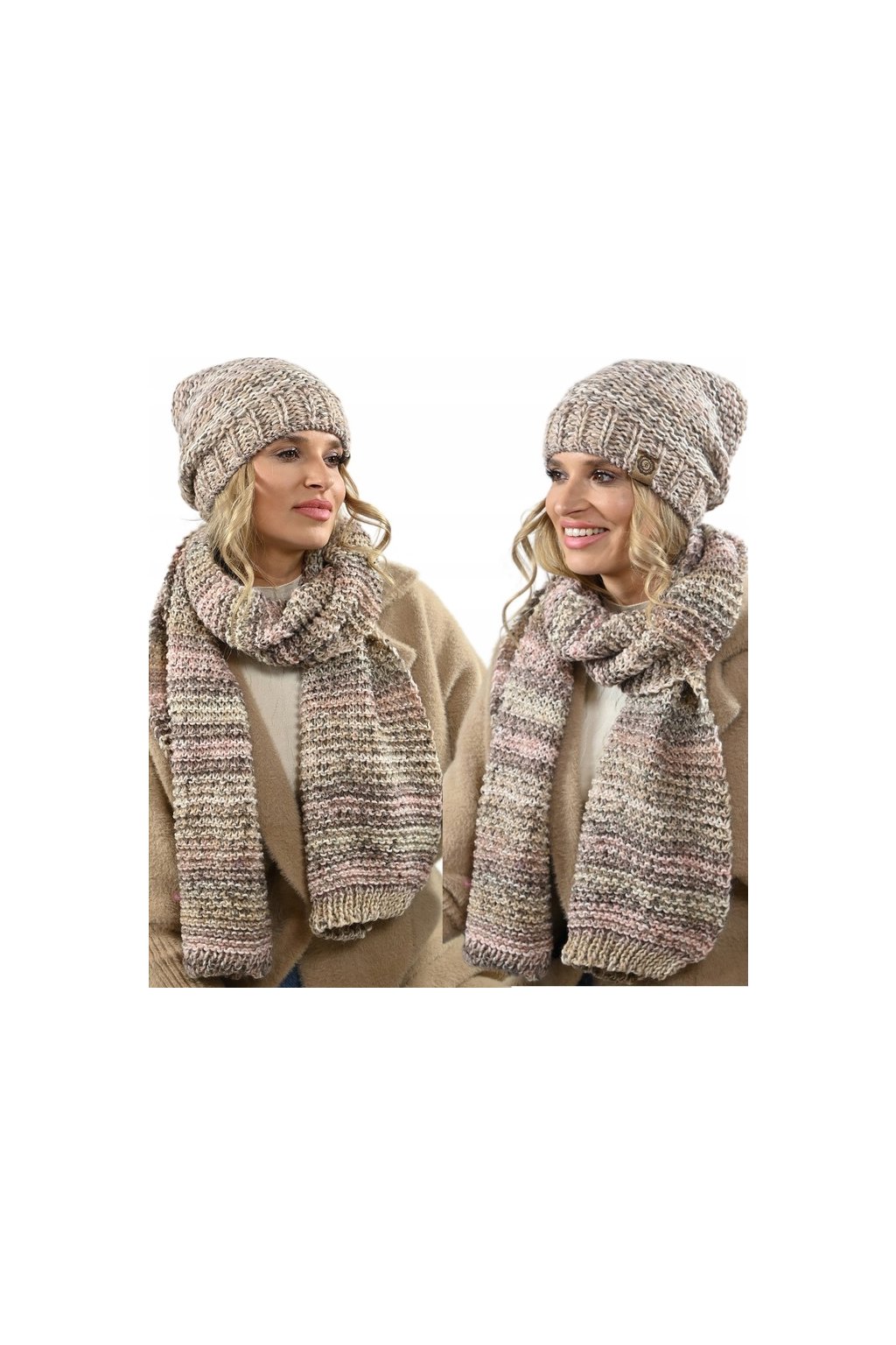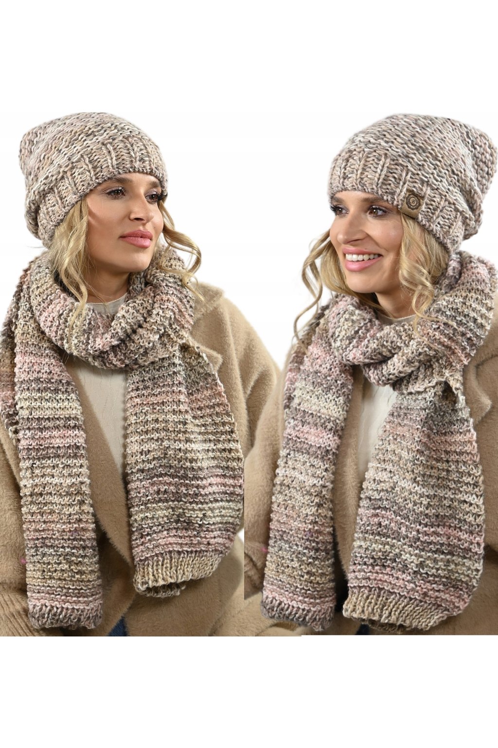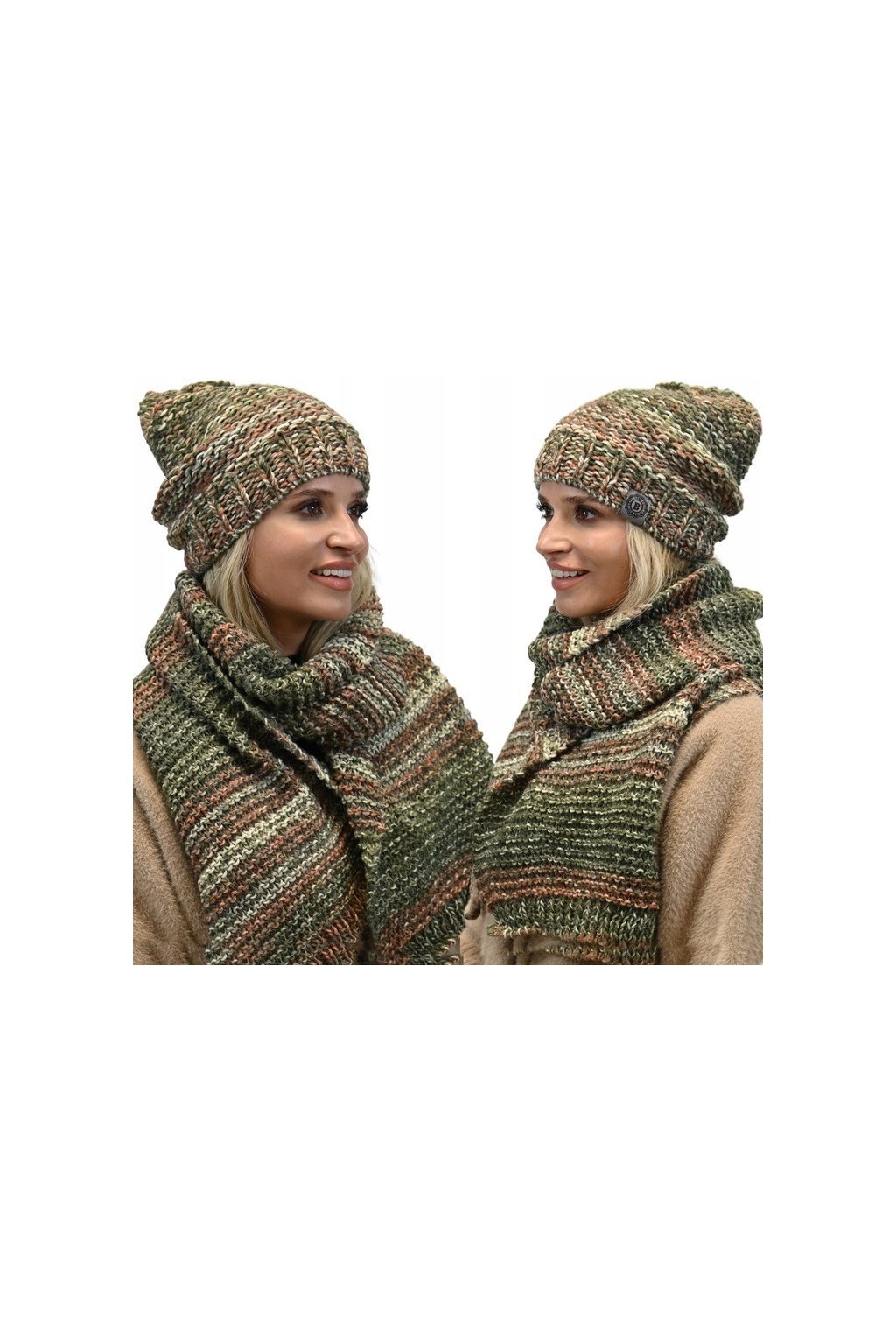 Dámský komplet čepice a šály s hrubou vazbou. Čepice a šála jsou vyrobeny z jemné a hřejivé alpakové vlny, která je známá svou trvanlivostí a odolností. Čepice má klasický tvar a je zdobena neobvyklou vícebarevnou kombinací, která z ní činí skutečné umělecké dílo. Šála je dlouhá a široká, takže se dá nosit různými způsoby.