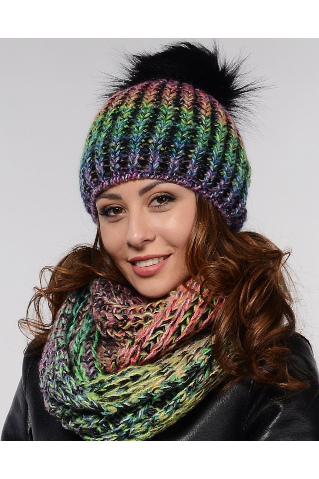Stylový zimní dámský komplet – pletená čepice s bambulí + teplý kruhový nákrčník v krásné vícebarevné přízi.