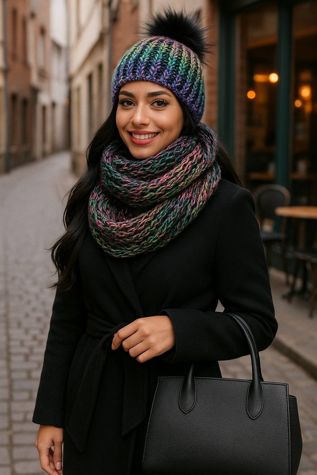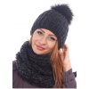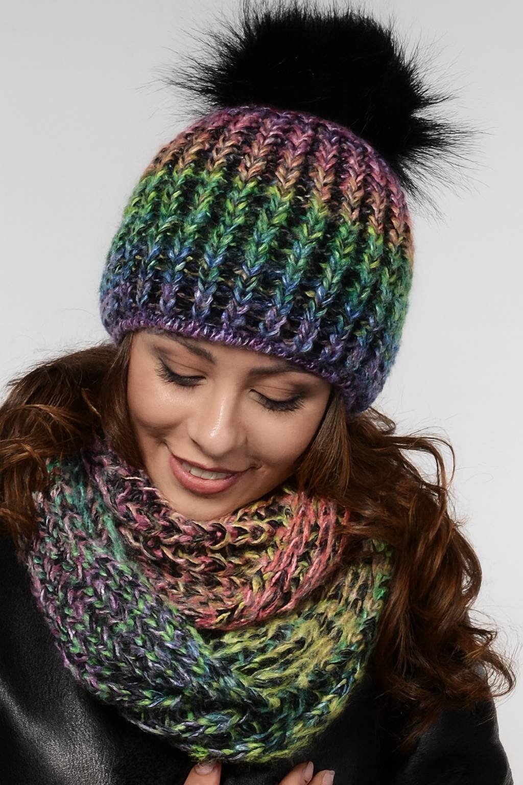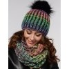 Stylový zimní dámský komplet – pletená čepice s bambulí + teplý kruhový nákrčník v krásné vícebarevné přízi.