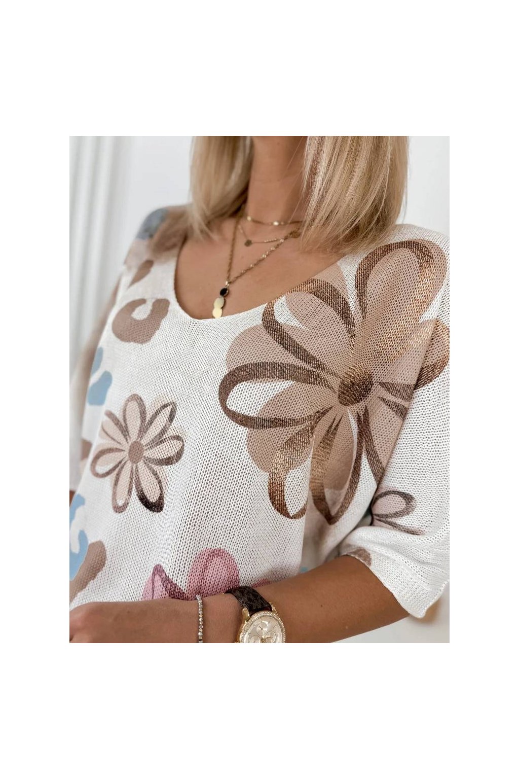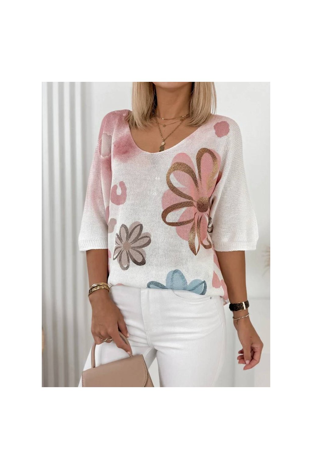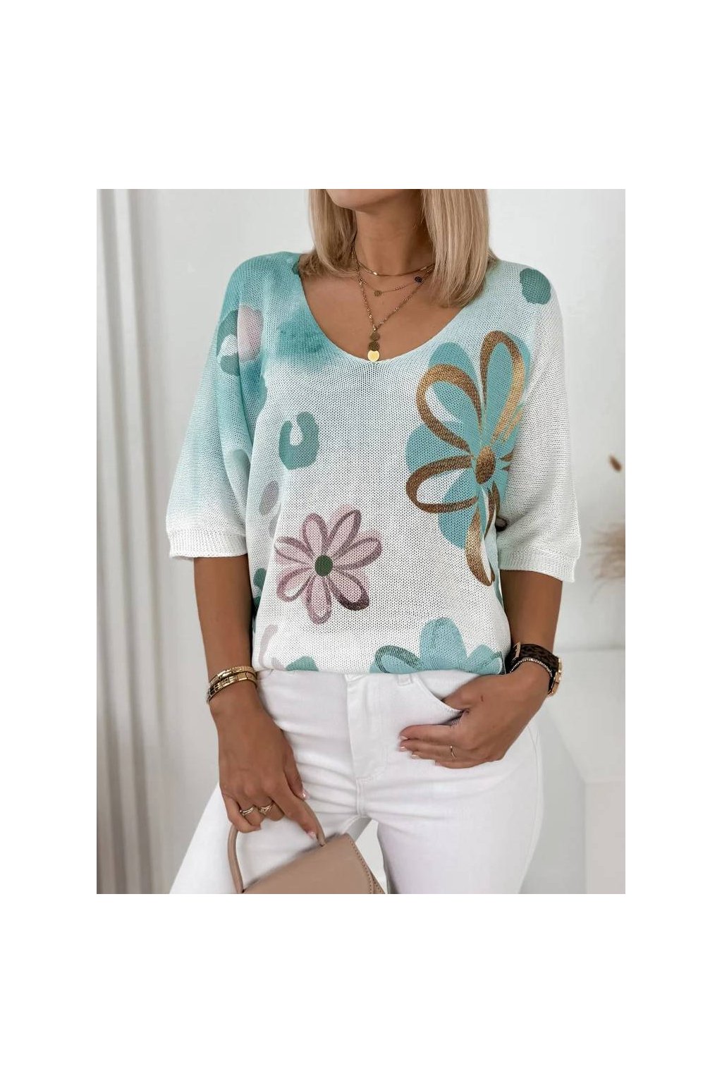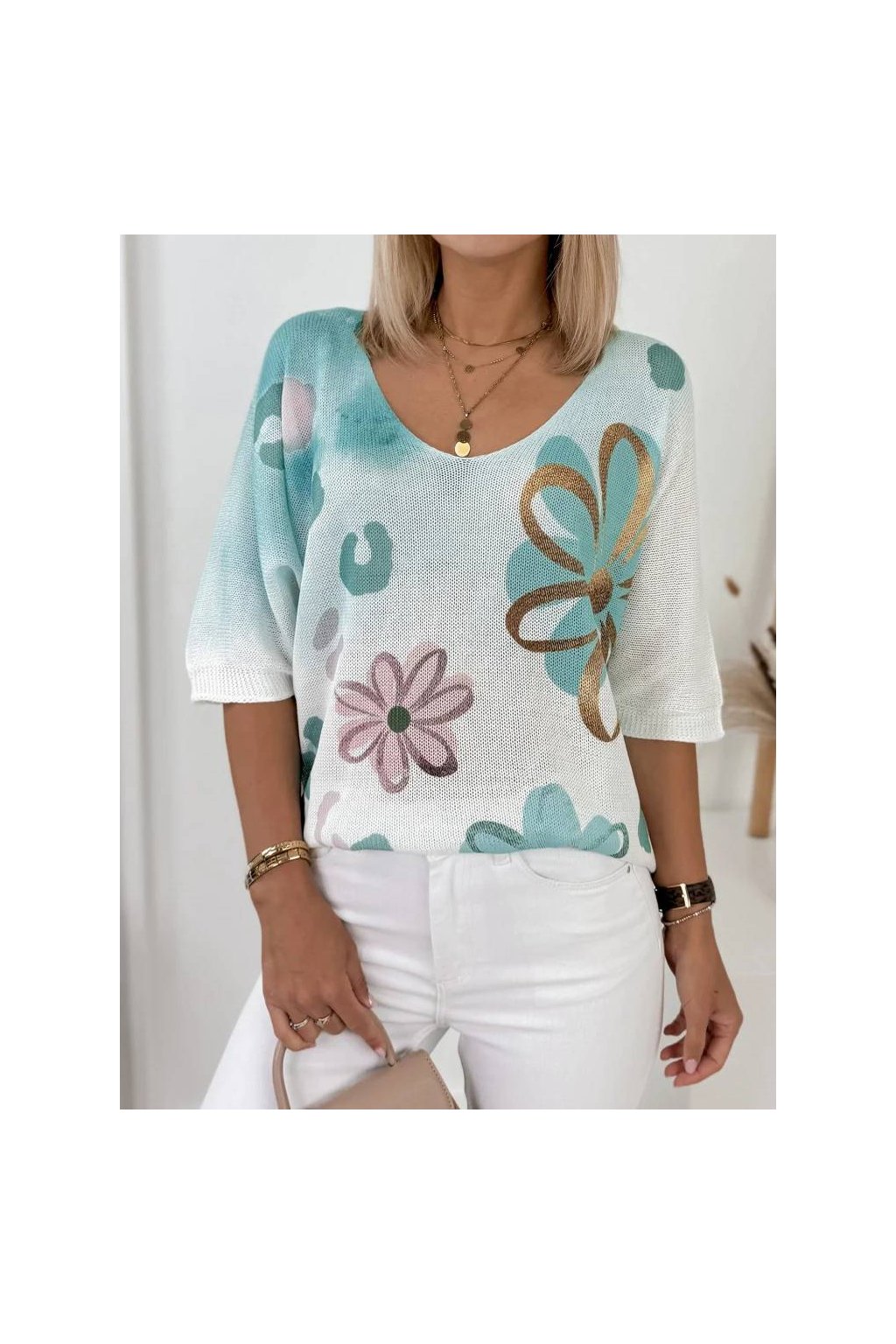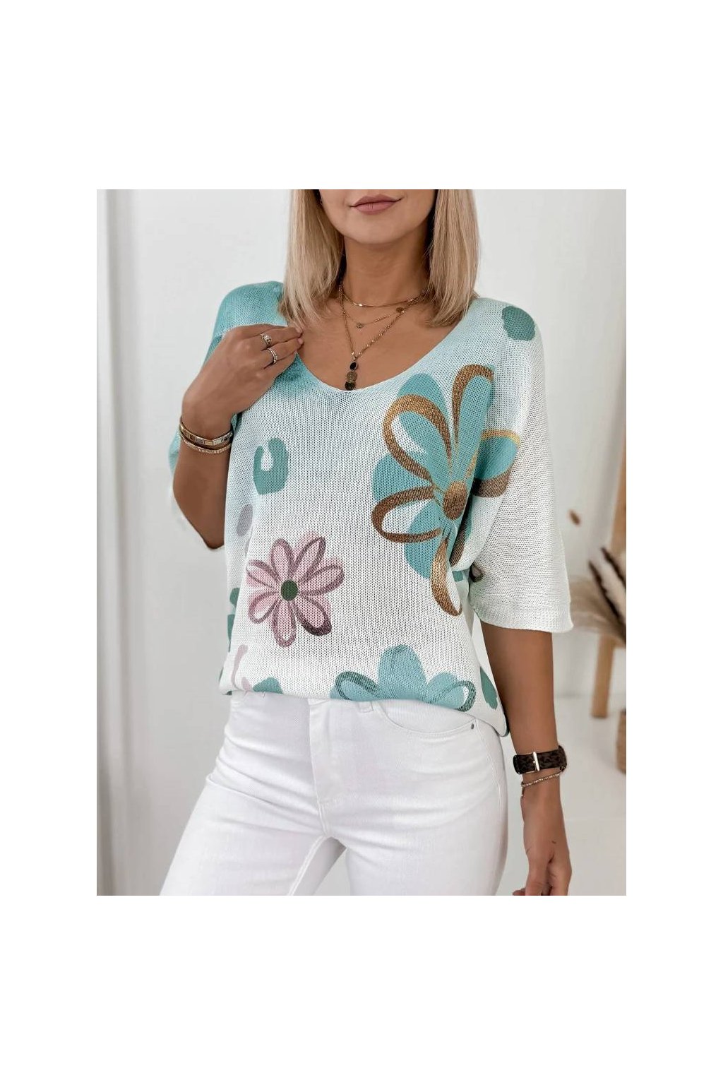 Rukáv 3/4 a výstřih do V krásně zvýrazňují ženskou siluetu.