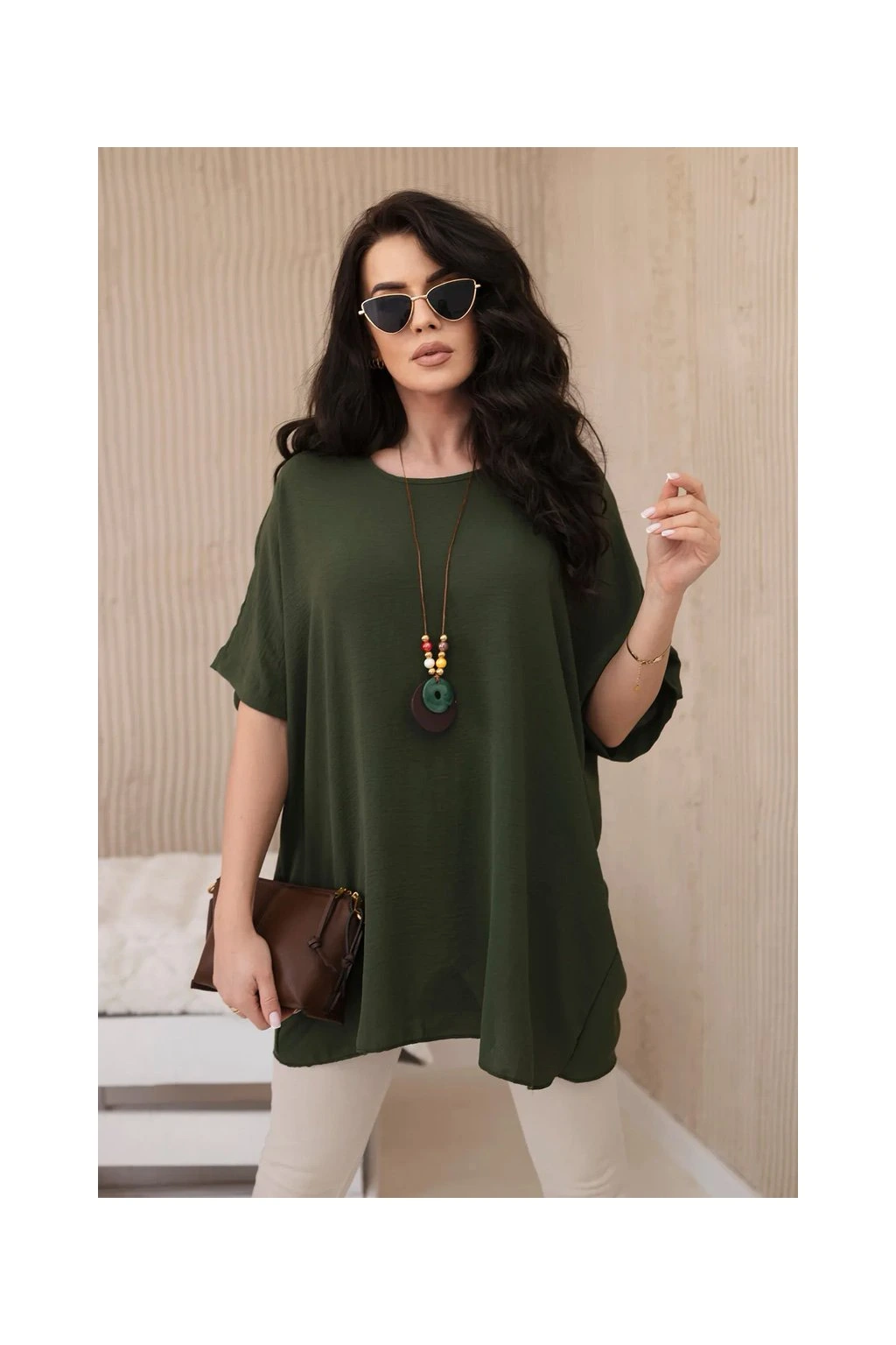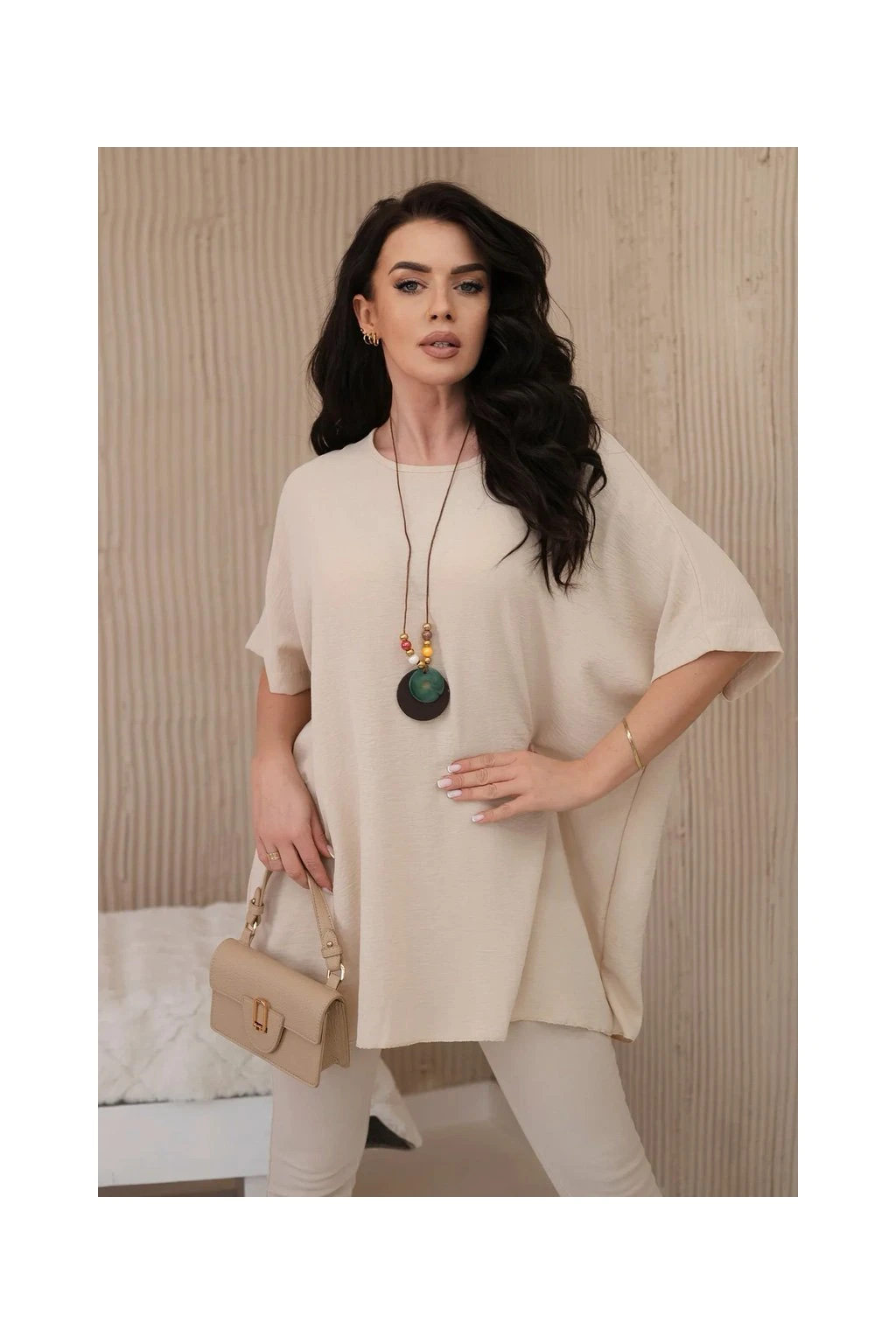 Fantastická Italská oversize halenka s přívěskem je spojením ležérnosti a jemné elegance. Tato halenka je vyrobena z příjemného a měkkého materiálu a poskytuje výjimečné pohodlí při nošení. Halenka nevyžaduje žehlení.