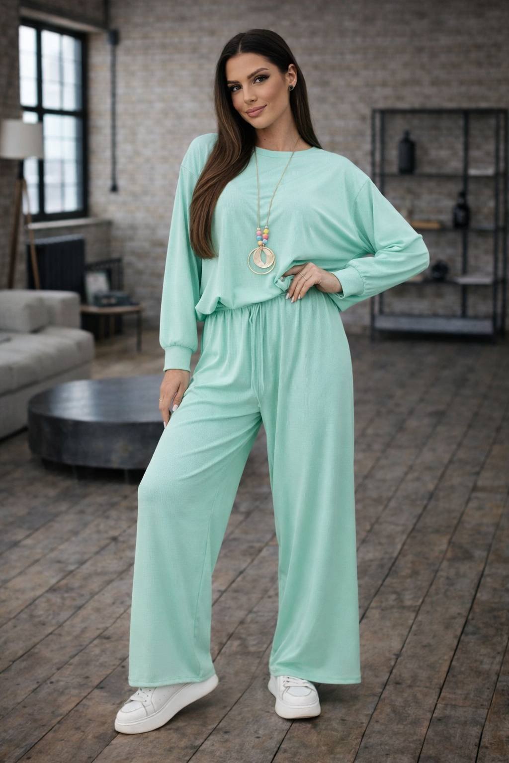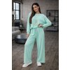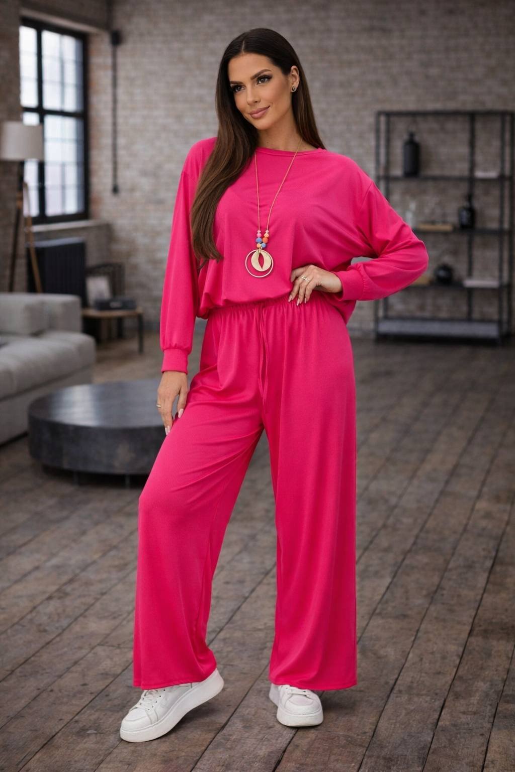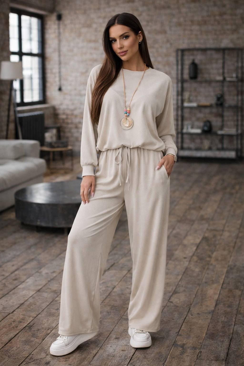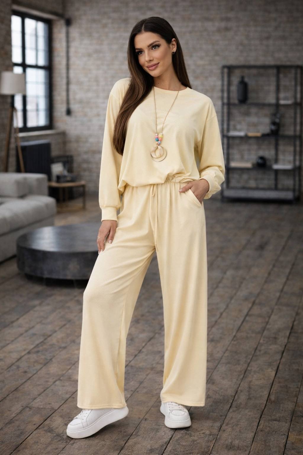 Stylová dámská souprava z měkké viskózy, která spojuje pohodlí a moderní vzhled. Volná mikina se spodním stahováním a široké kalhoty s elastickým pasem vytvářejí ležérní, ale upravený outfit vhodný pro každý den.