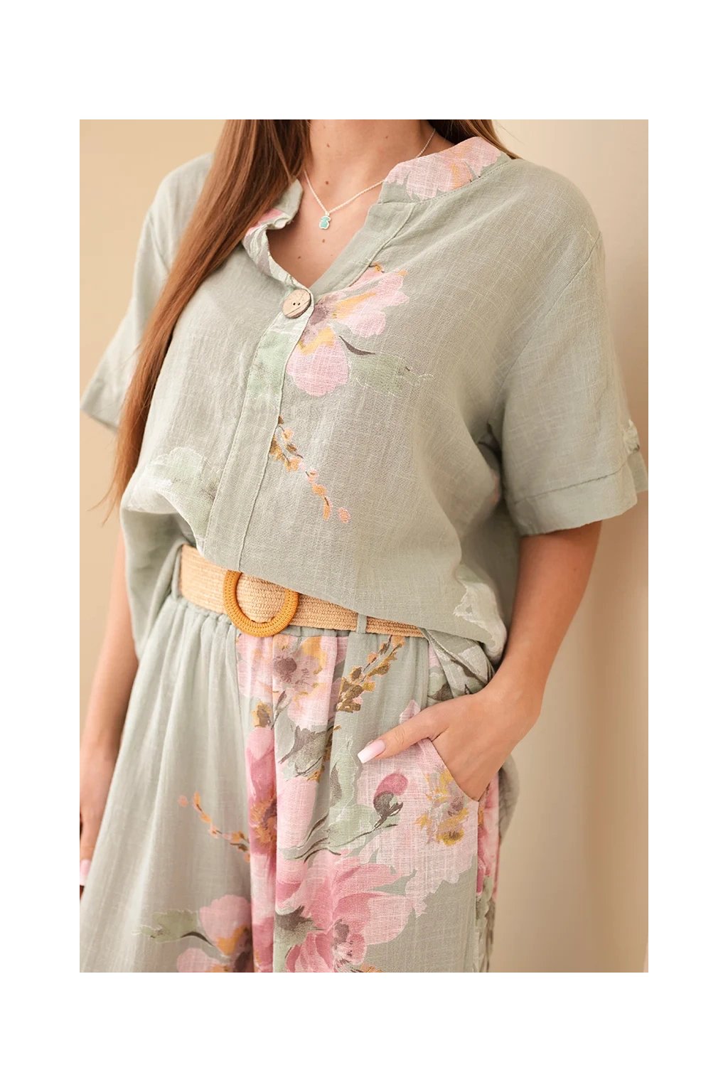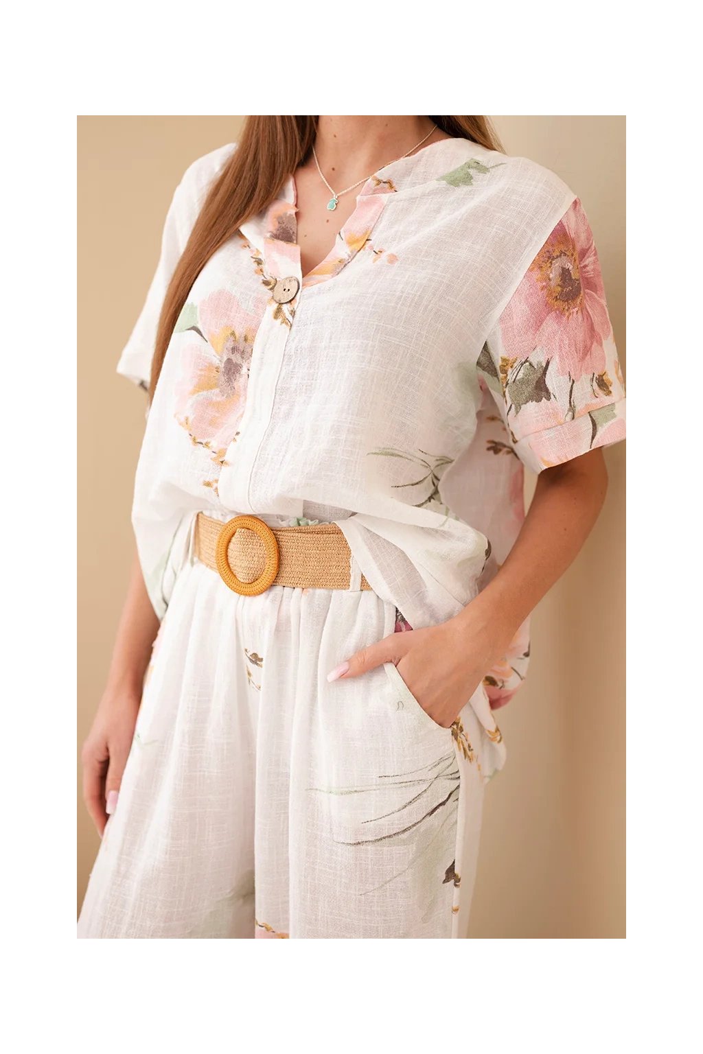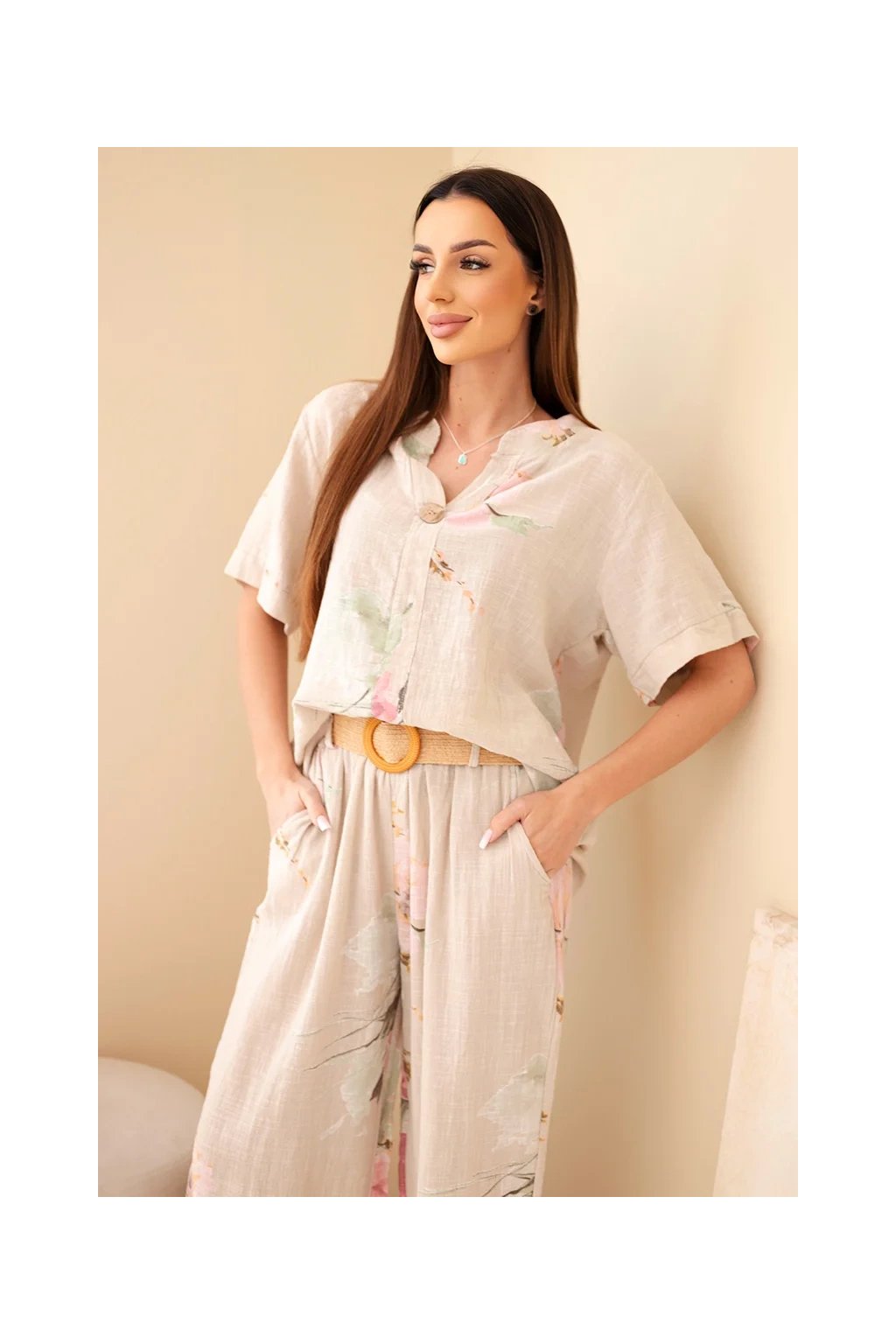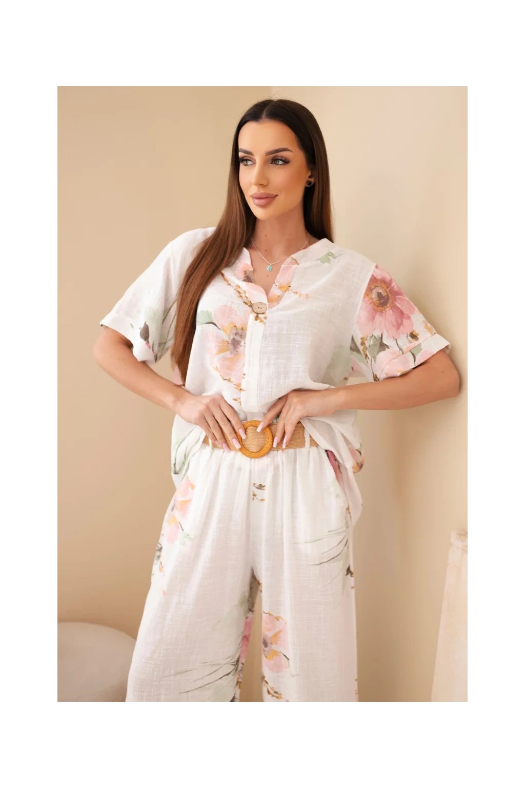 Přírodní materiál zajišťuje prodyšnost a maximální komfort i během horkých dnů. Halenka má volnější střih a elegantní zapínání na knoflík u výstřihu. Kalhoty jsou vybaveny elastickým pasem, díky kterému se perfektně přizpůsobí postavě.