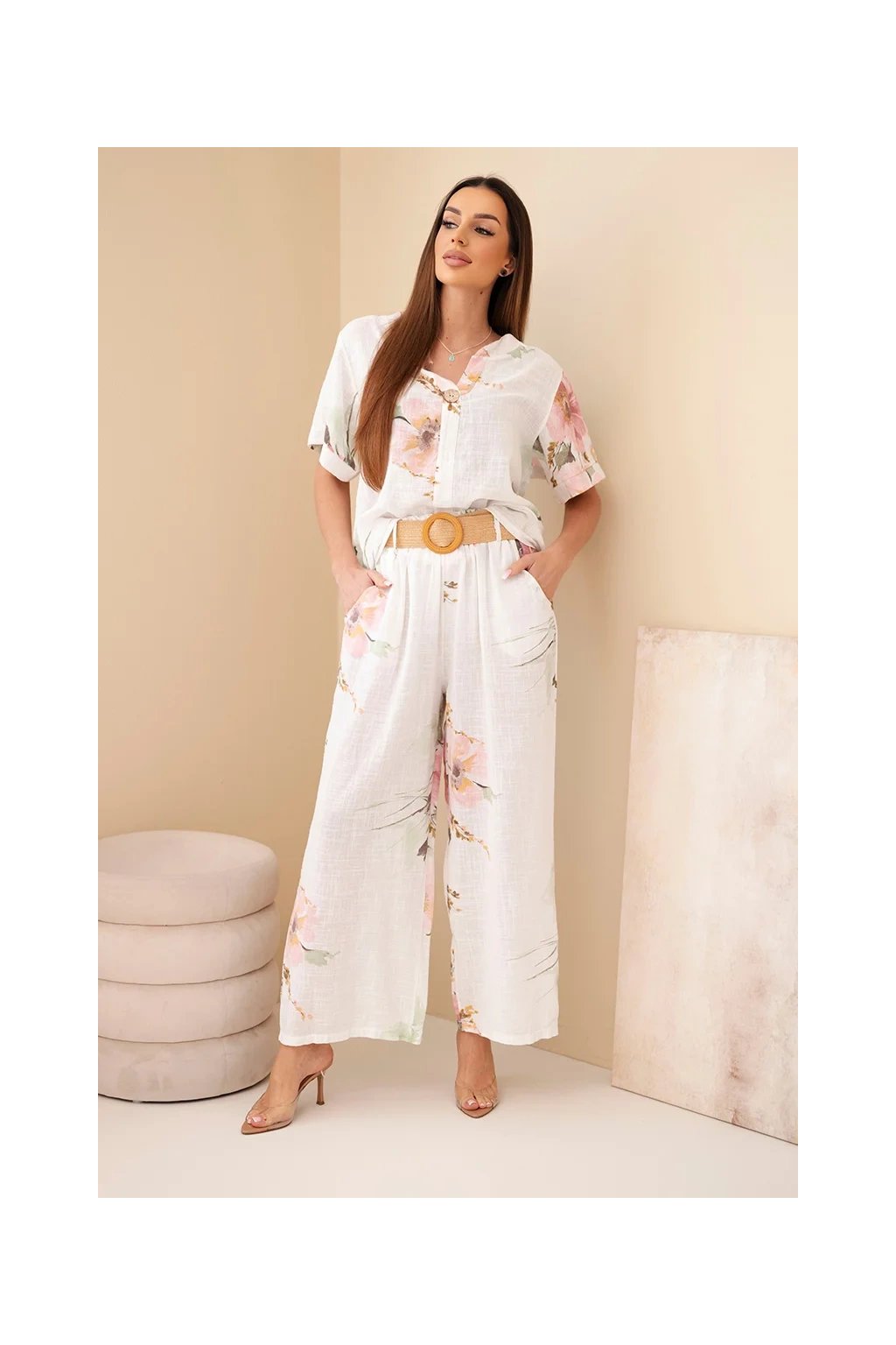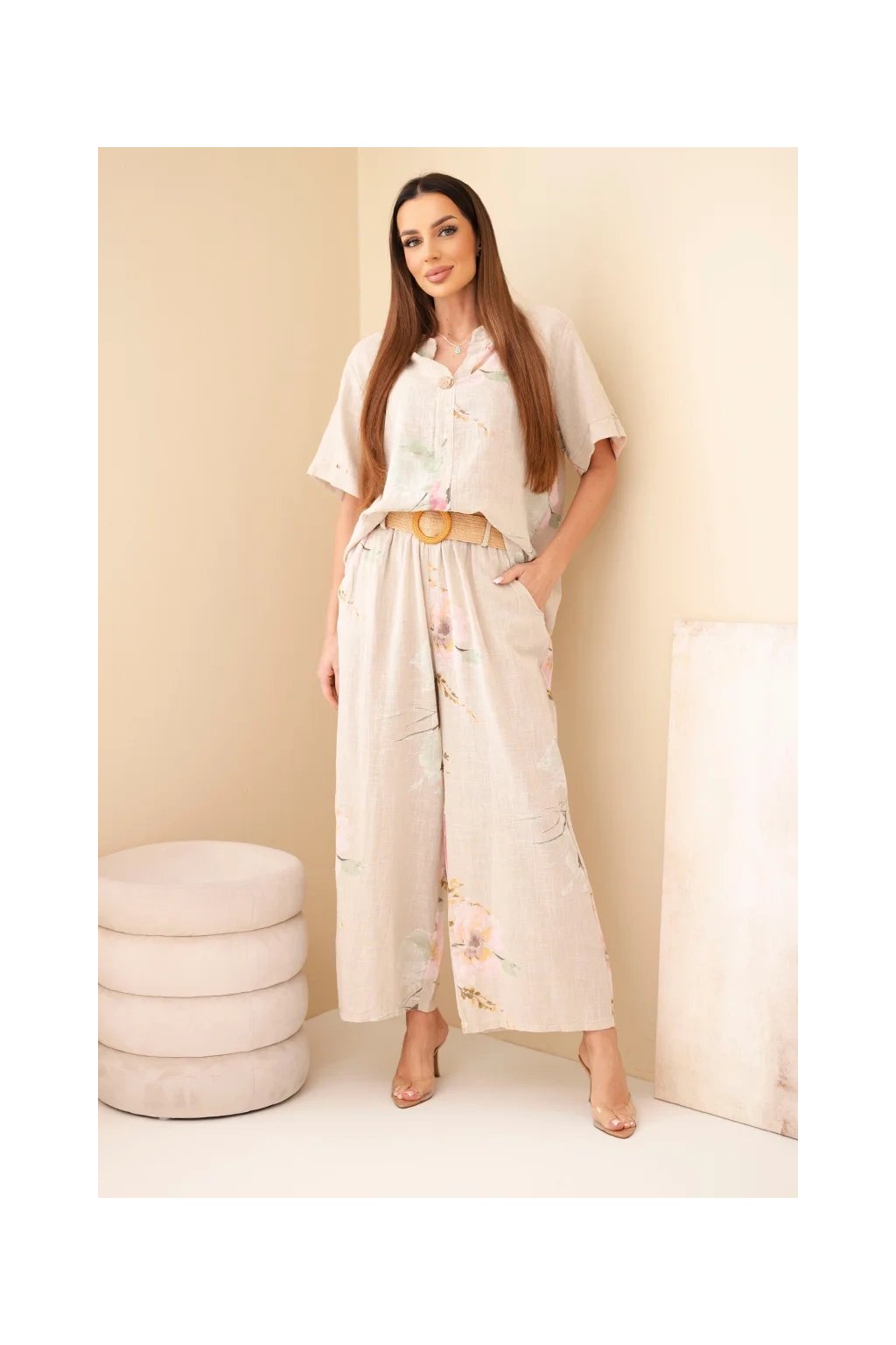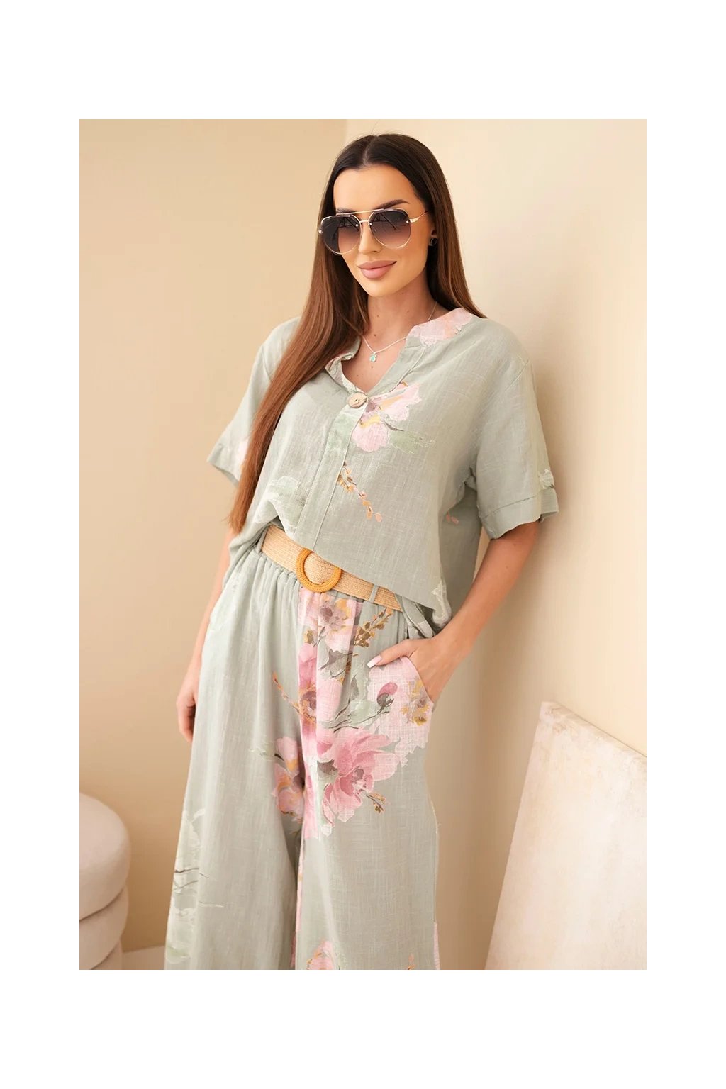 Přírodní materiál zajišťuje prodyšnost a maximální komfort i během horkých dnů. Halenka má volnější střih a elegantní zapínání na knoflík u výstřihu. Kalhoty jsou vybaveny elastickým pasem, díky kterému se perfektně přizpůsobí postavě.