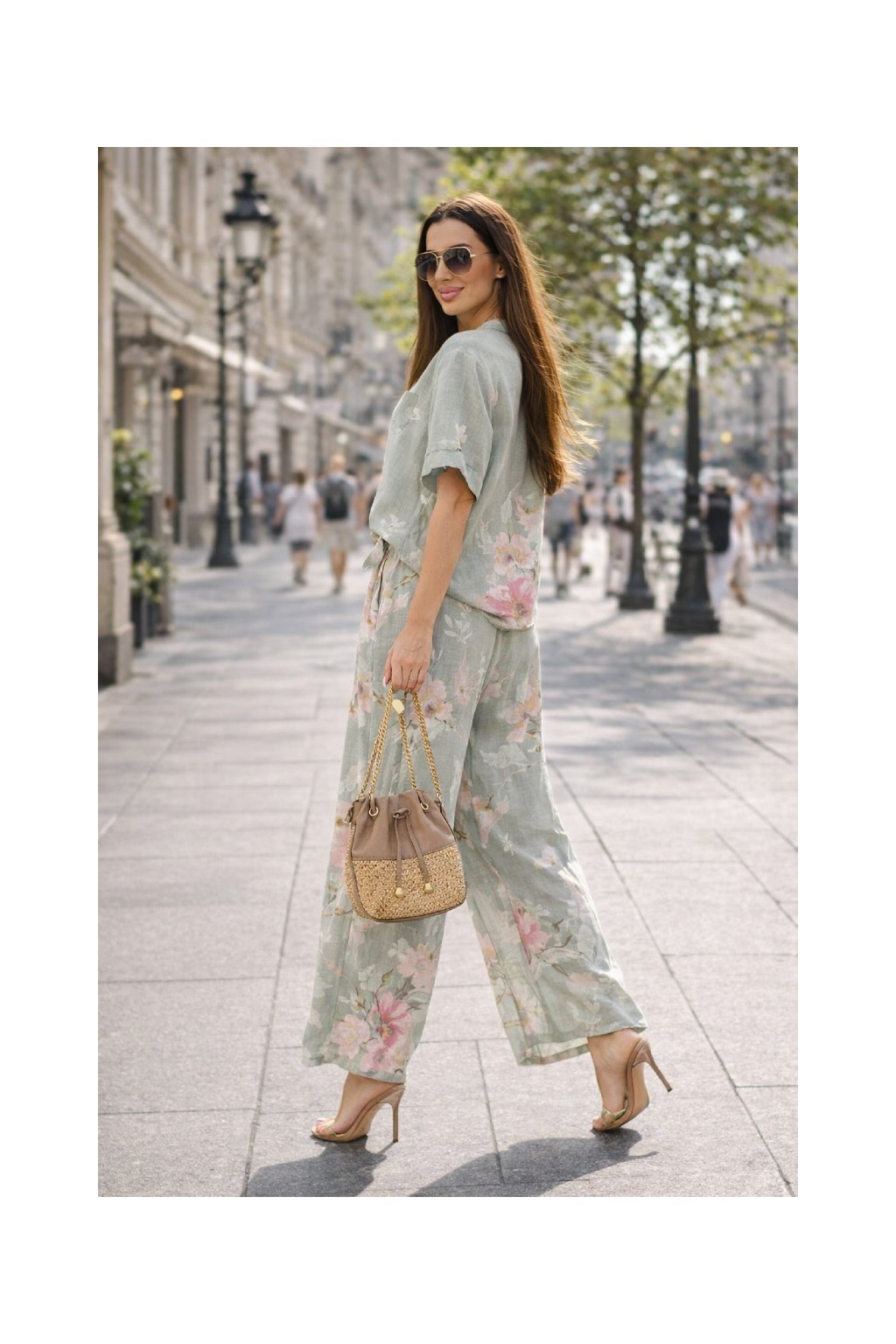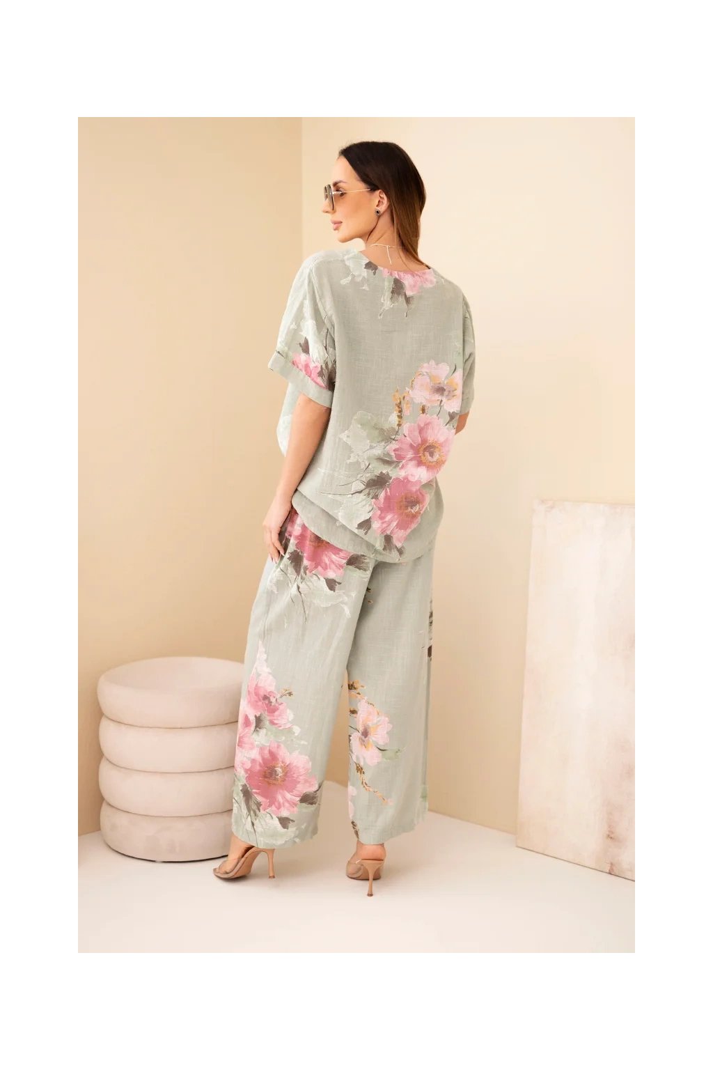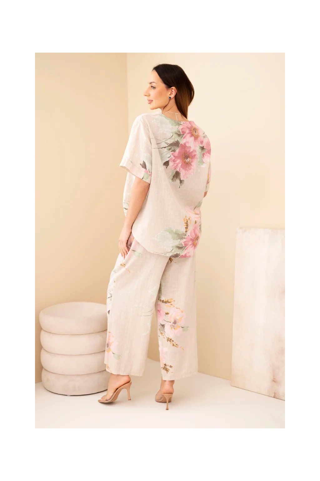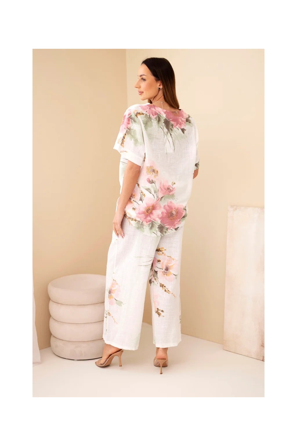 Přírodní materiál zajišťuje prodyšnost a maximální komfort i během horkých dnů. Halenka má volnější střih a elegantní zapínání na knoflík u výstřihu. Kalhoty jsou vybaveny elastickým pasem, díky kterému se perfektně přizpůsobí postavě.