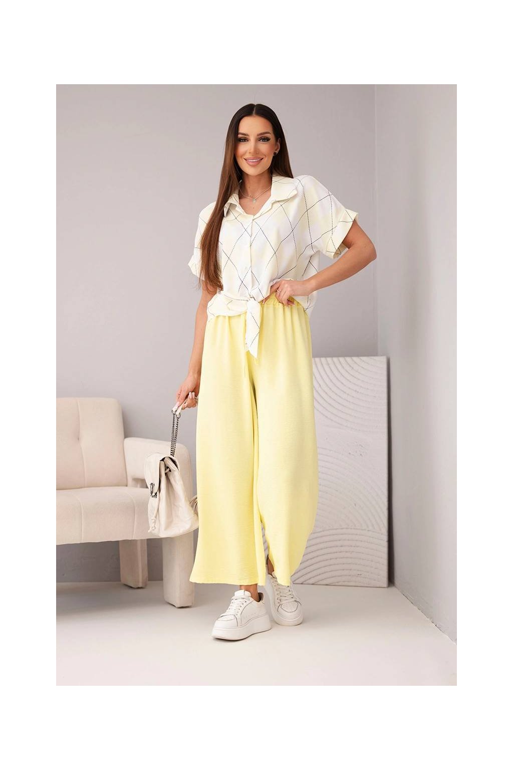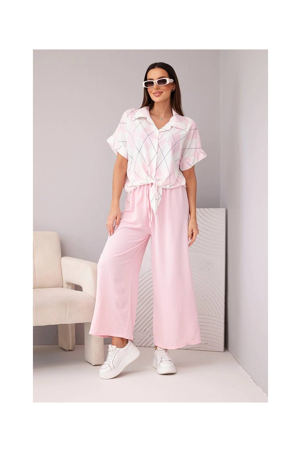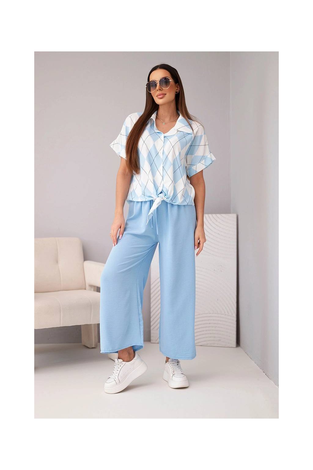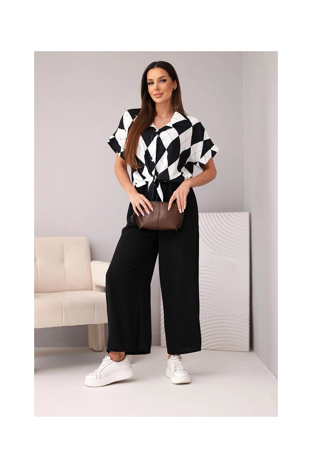 Fason: krátká košile se zavazováním a límečkem + široké kalhoty