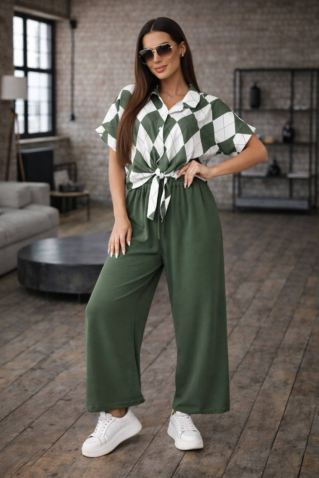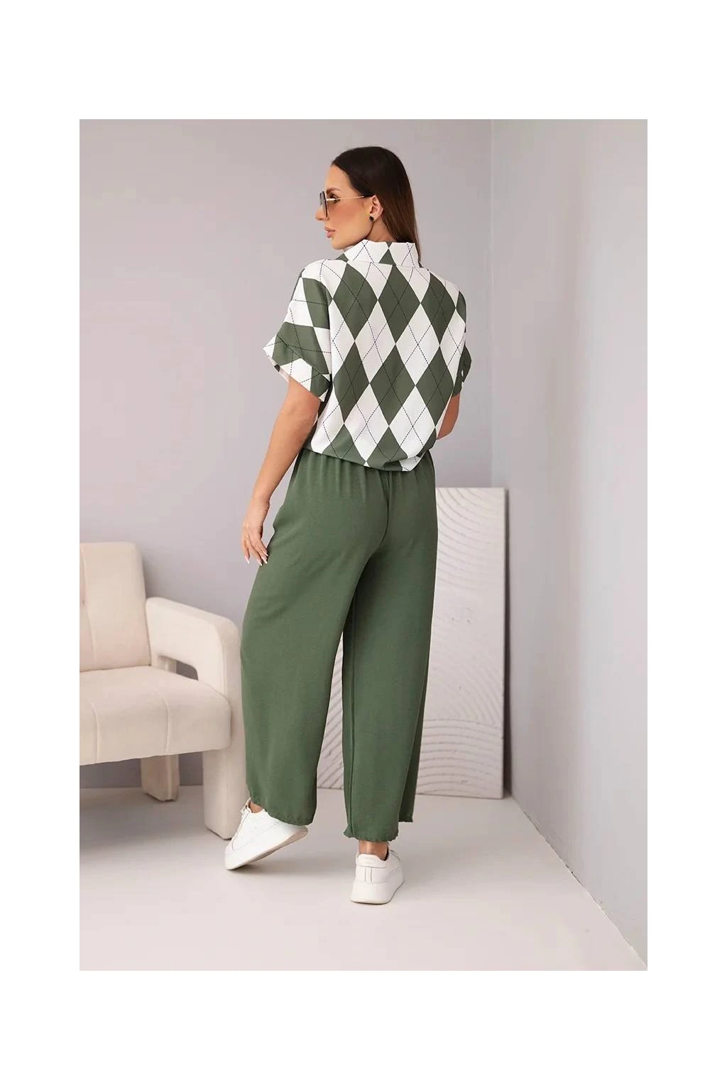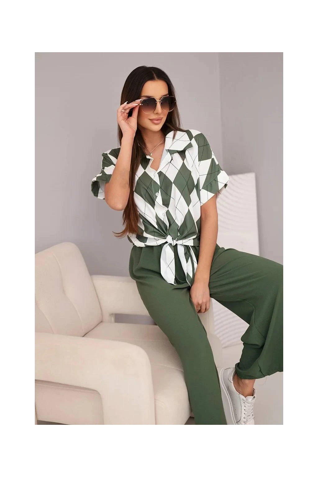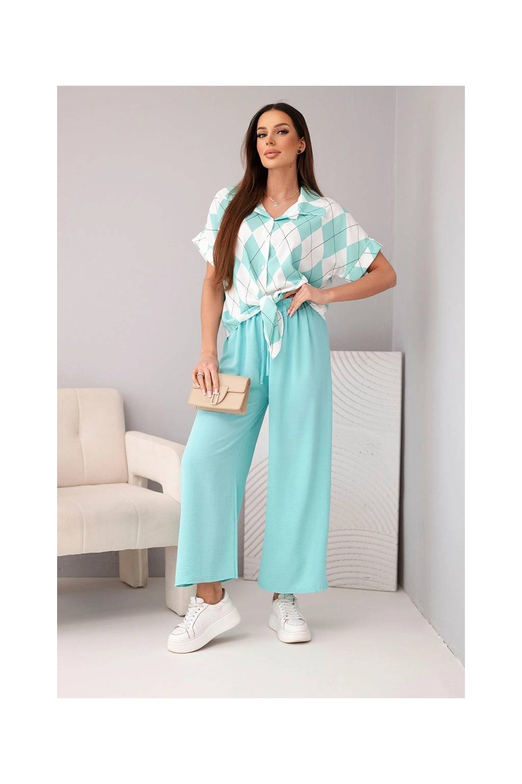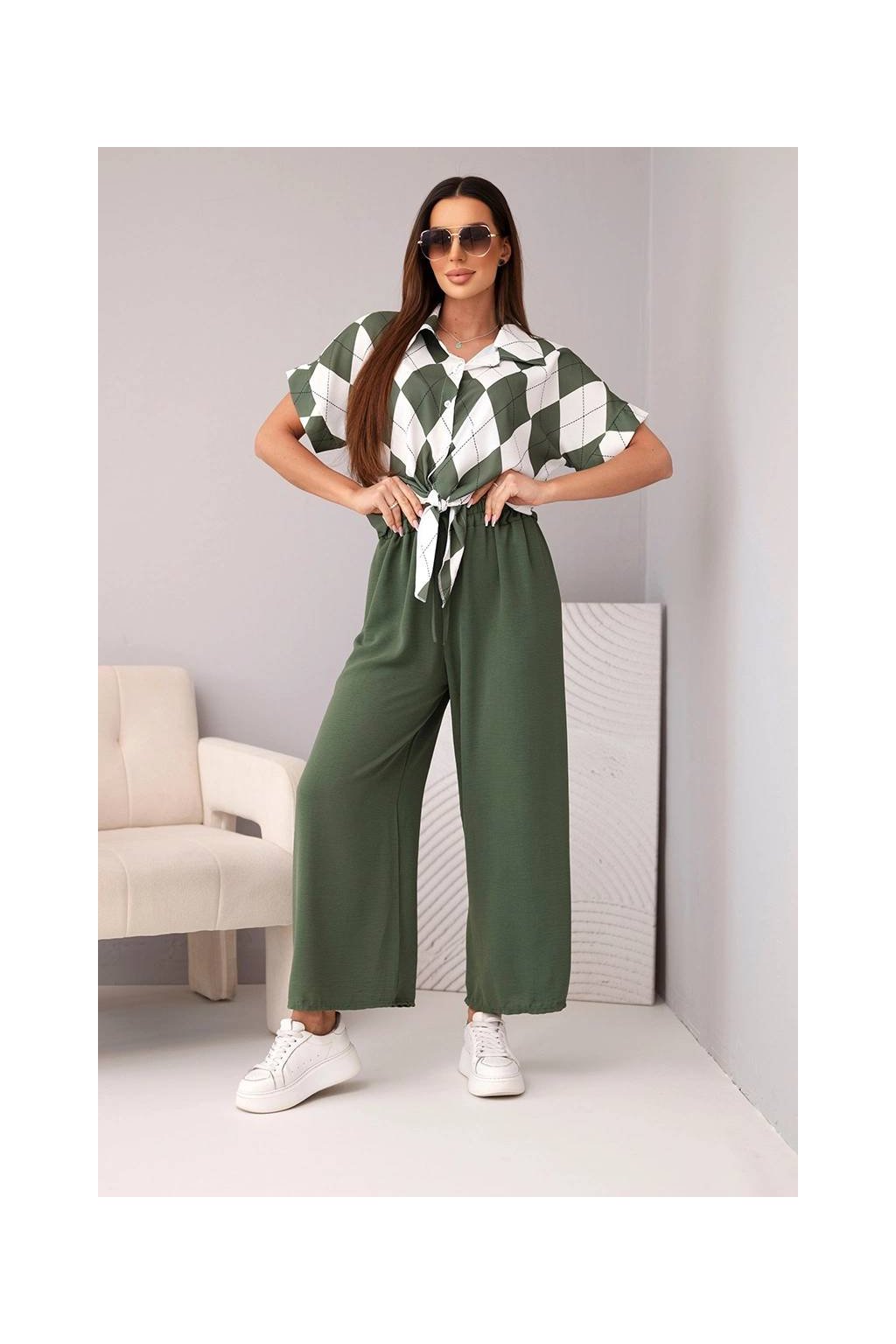 Fason: krátká košile se zavazováním a límečkem + široké kalhoty