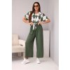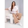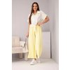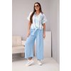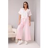 Elegantní a zároveň pohodlný dámský viskózový komplet, který se skládá z krátké košile s límečkem a zavazováním v pase a širokých kalhot s elastickým pasem. Lehká a prodyšná tkanina s příměsí elastanu je ideální volbou na jaro a léto.