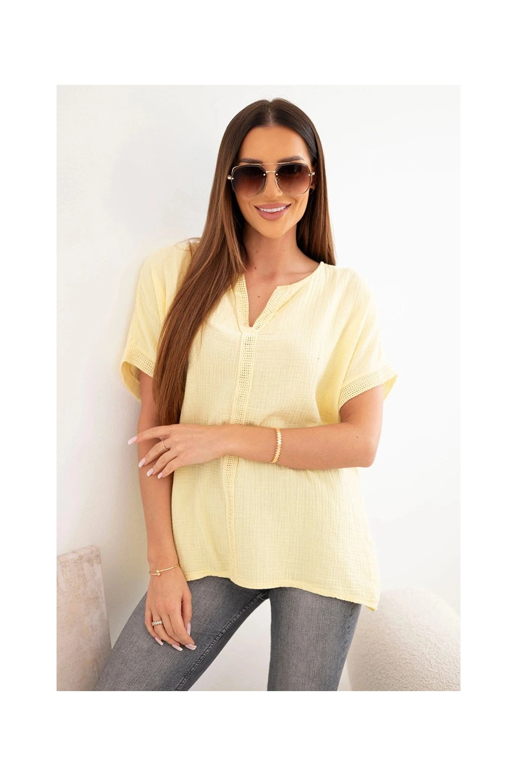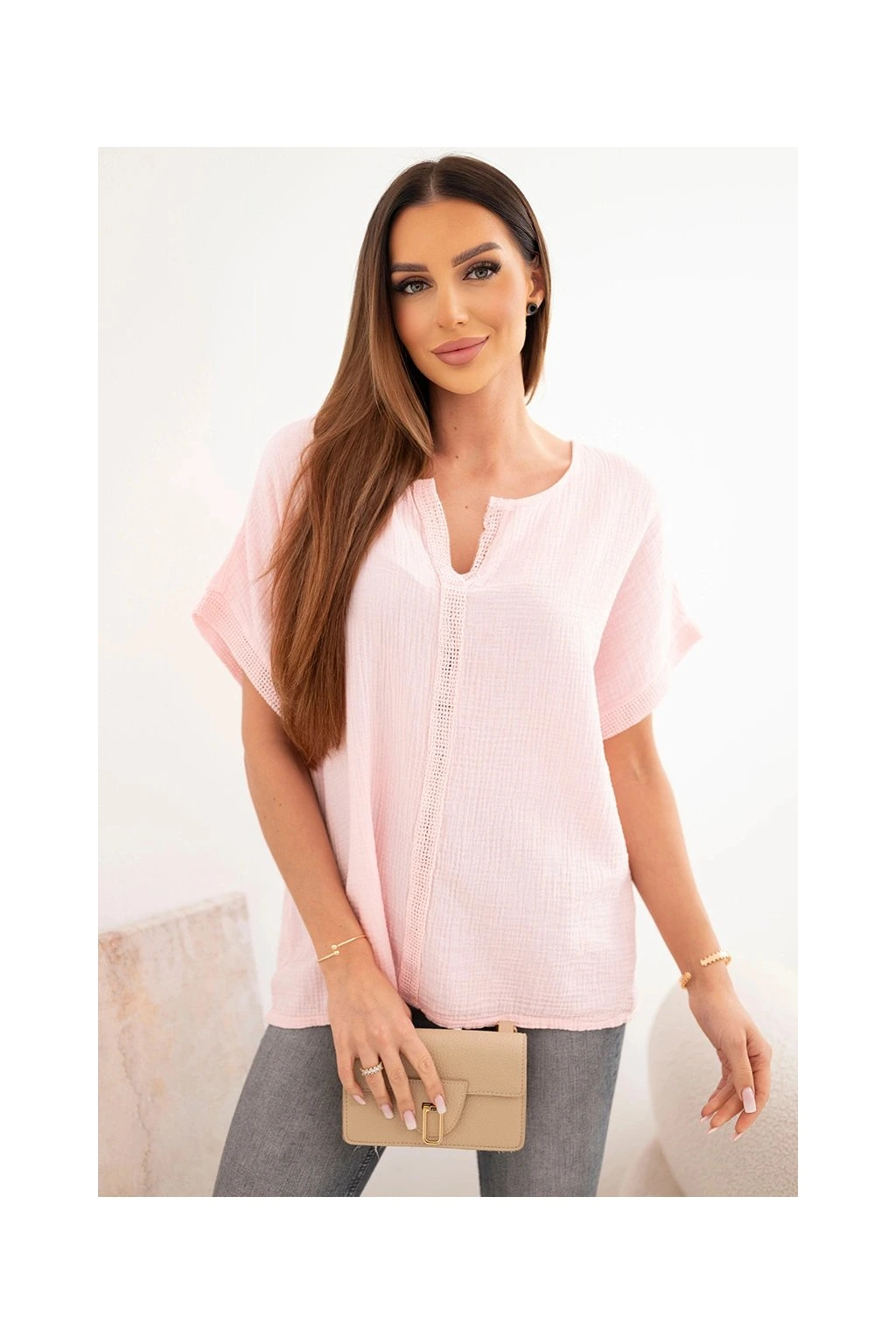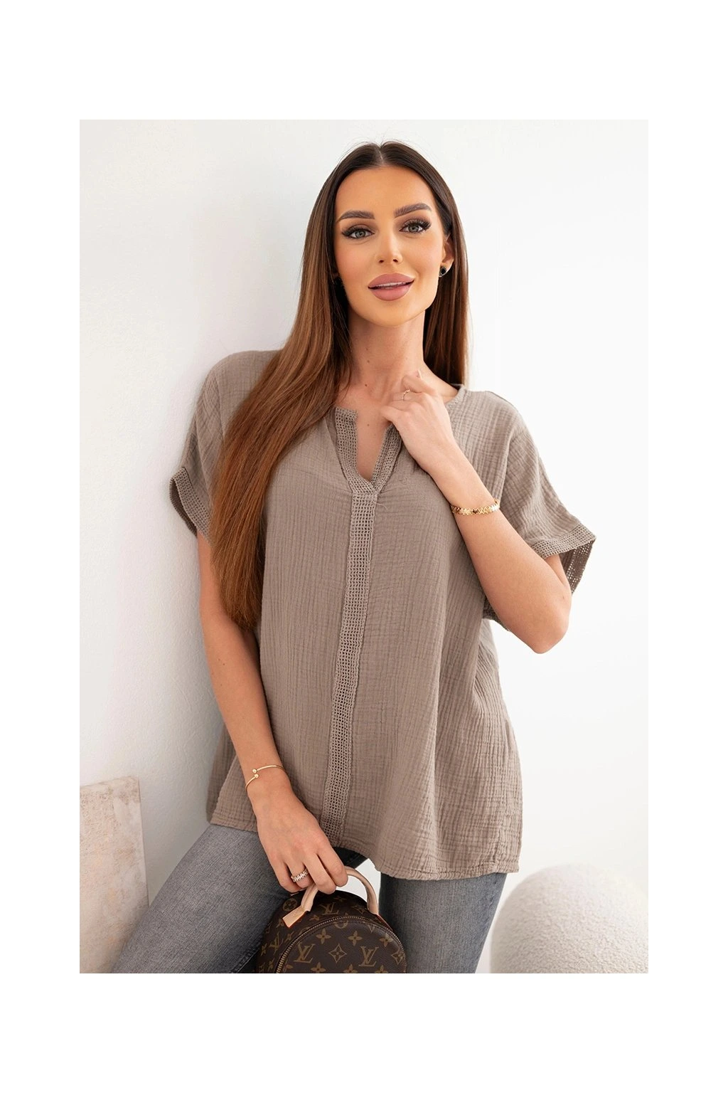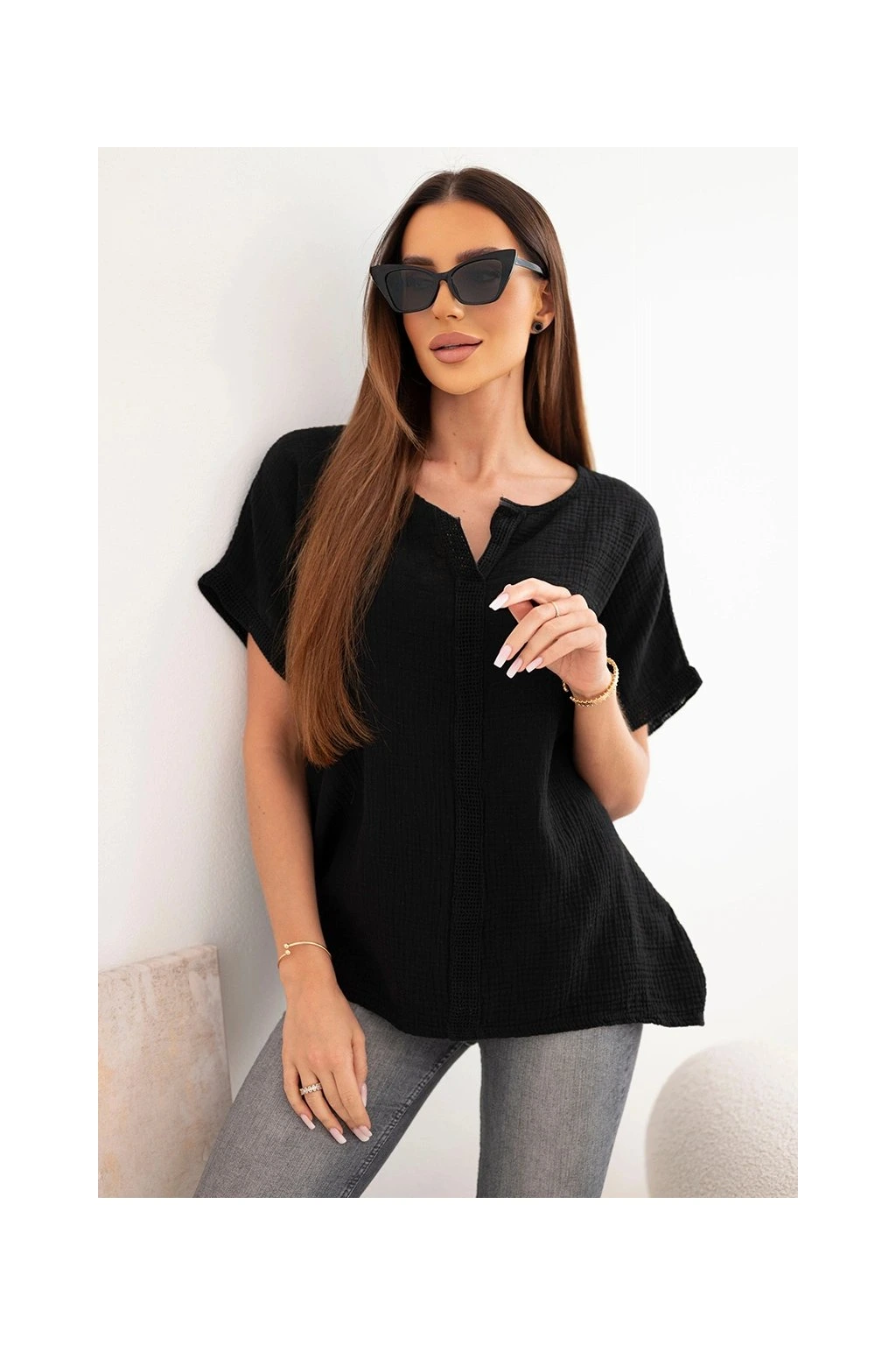Model zaujme svým minimalistickým designem a elegantním V výstřihem s ozdobnou krajkou, která dodává ženskost a jemnost. Krátké rukávy s ohrnutím a dekorativním zakončením podtrhují moderní a ležérní vzhled.
