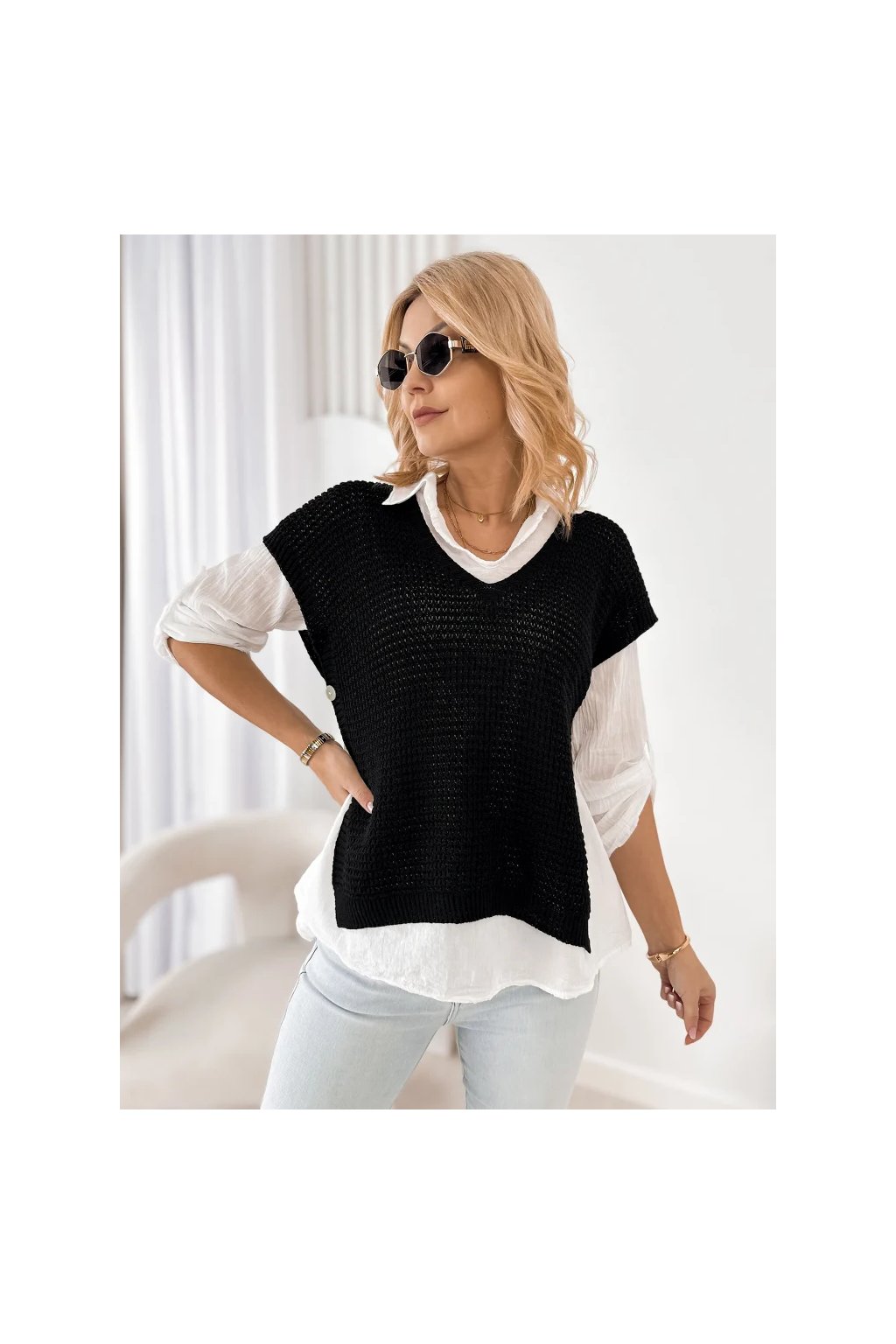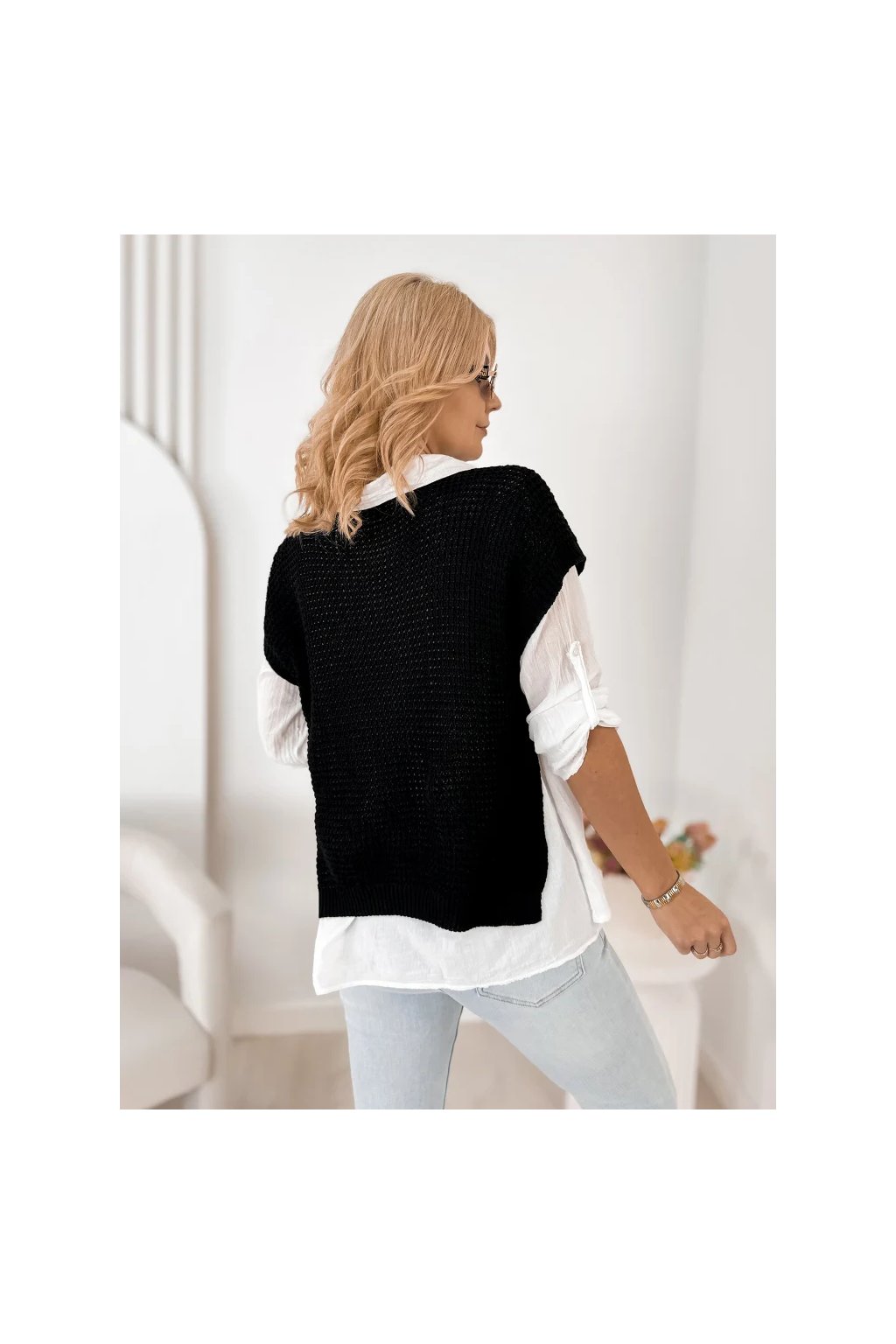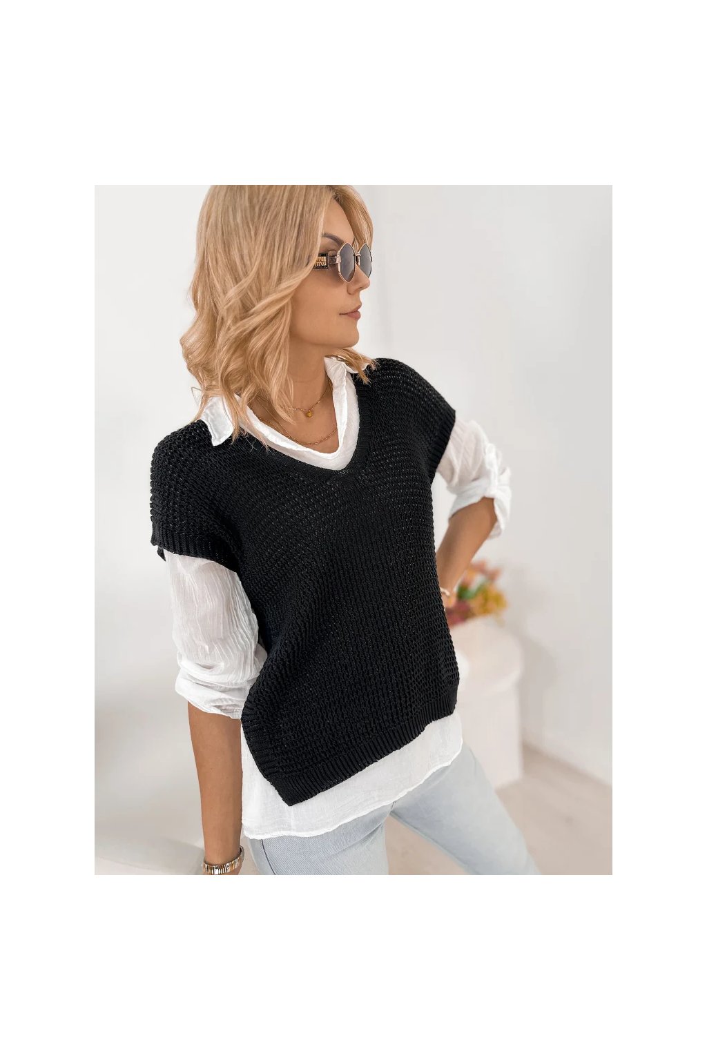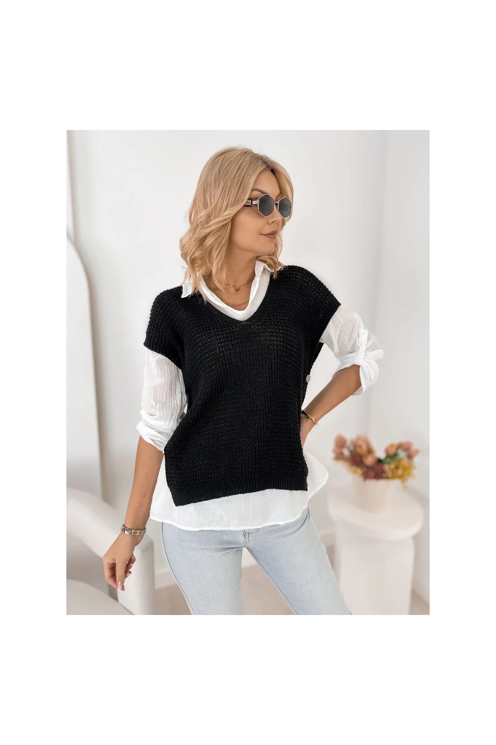 Lehká halenka s límečkem a dlouhým rukávem působí velmi ženským a elegantním dojmem. Pletená vesta s krátkým rukávem dodává outfitu moderní vrstvený vzhled, který je velmi oblíbený v současných módních kolekcích.