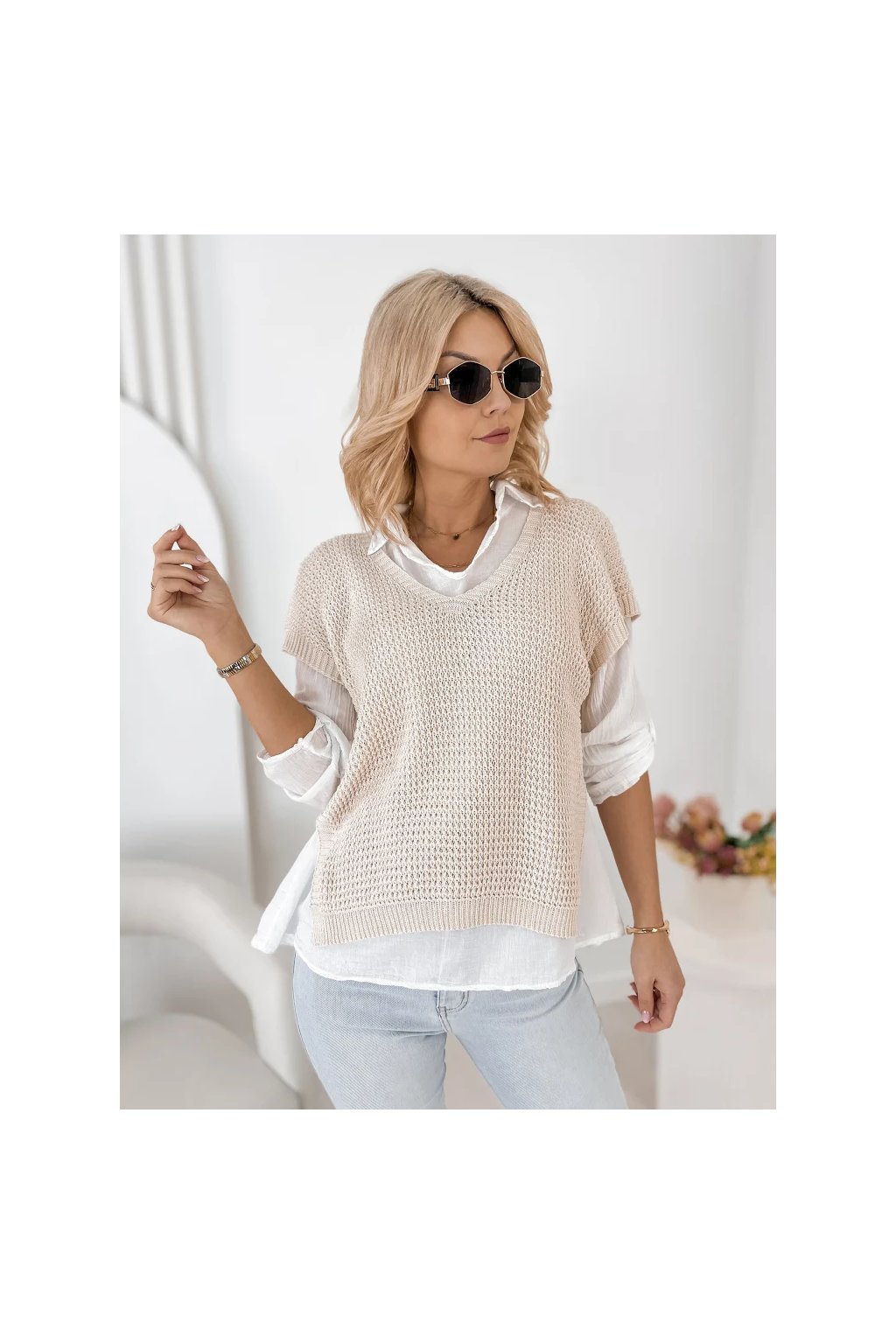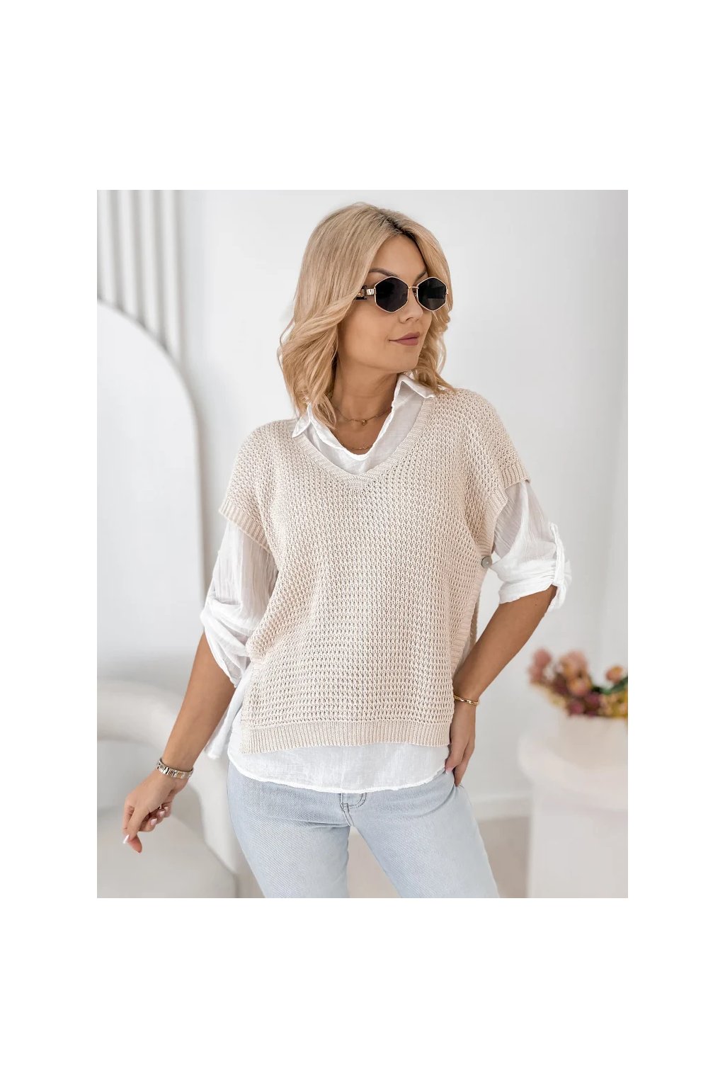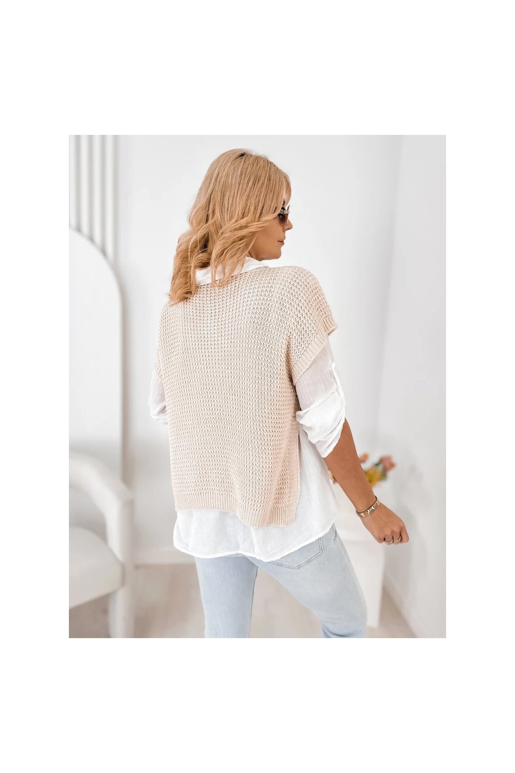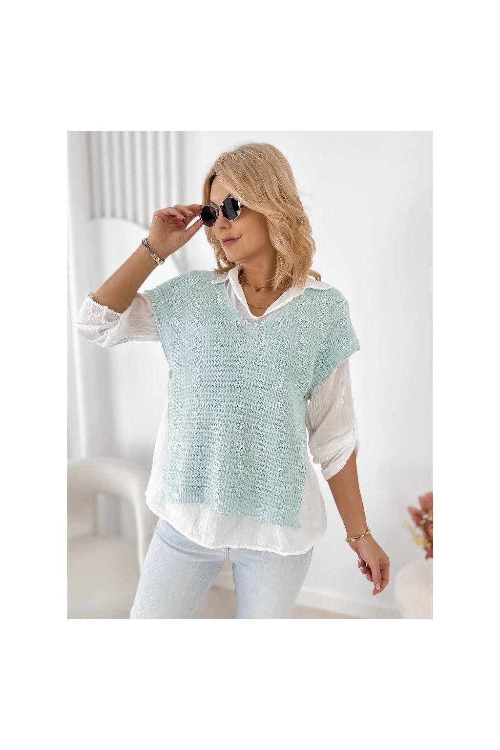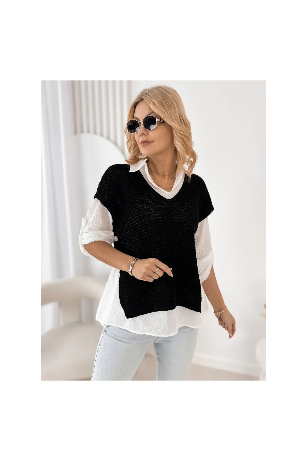Lehká halenka s límečkem a dlouhým rukávem působí velmi ženským a elegantním dojmem. Pletená vesta s krátkým rukávem dodává outfitu moderní vrstvený vzhled, který je velmi oblíbený v současných módních kolekcích.