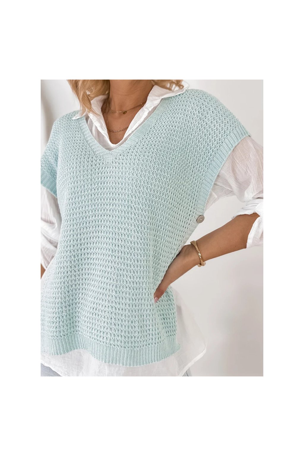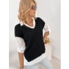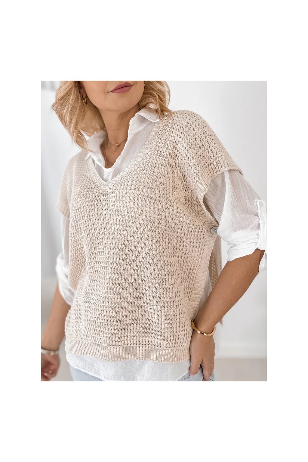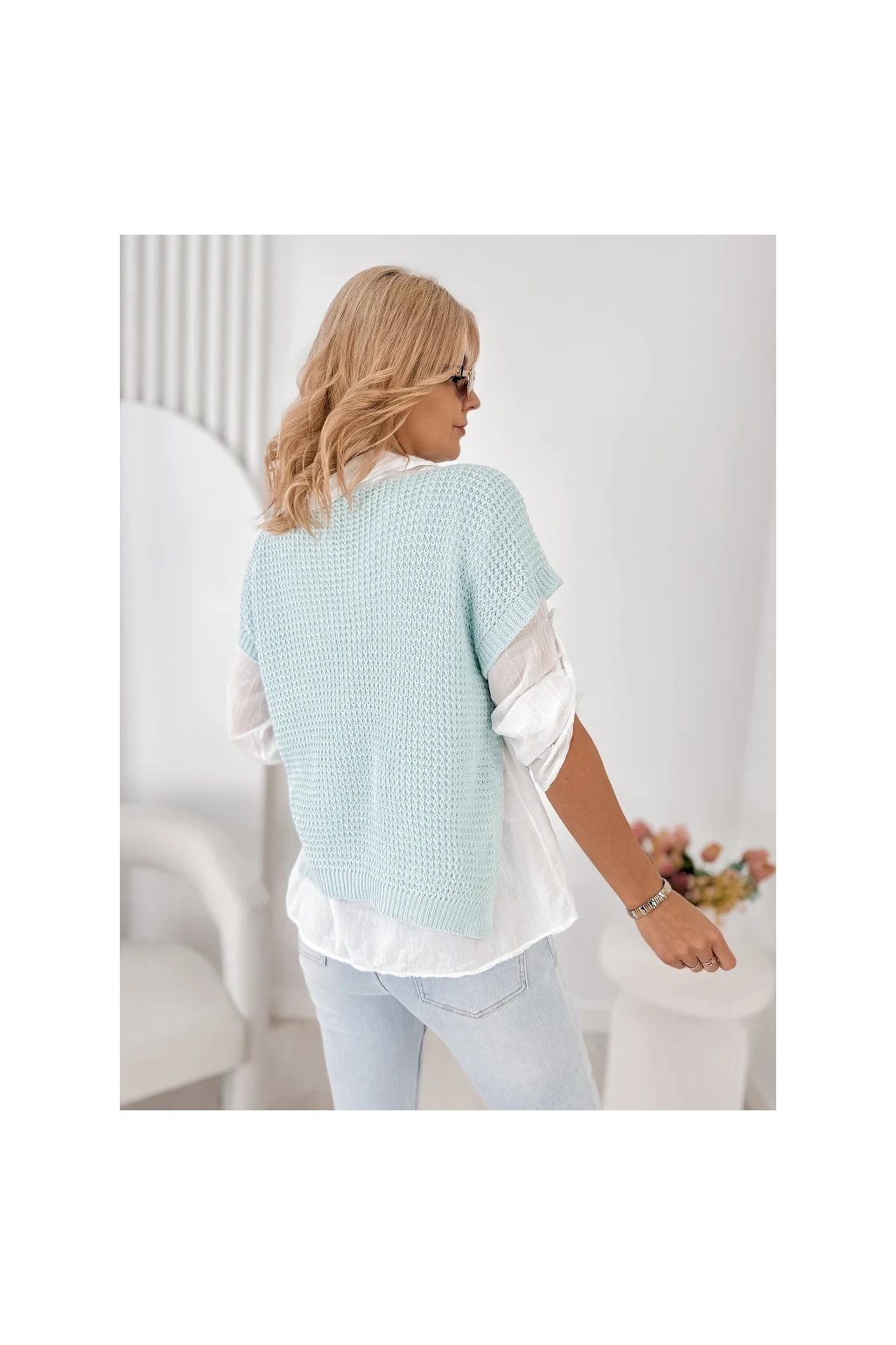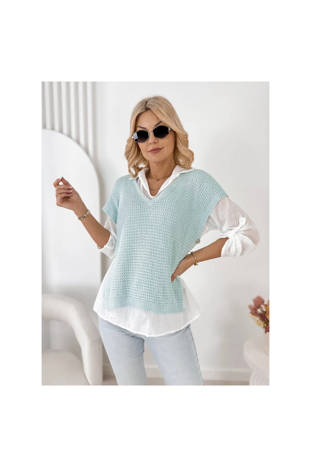 Lehká halenka s límečkem a dlouhým rukávem působí velmi ženským a elegantním dojmem. Pletená vesta s krátkým rukávem dodává outfitu moderní vrstvený vzhled, který je velmi oblíbený v současných módních kolekcích.