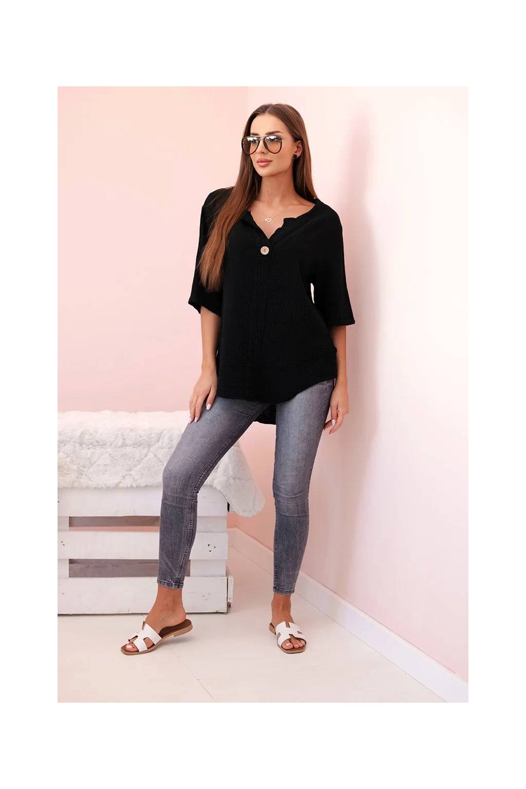 Italská Košilová halenka z lehké a příjemné bavlny.Krásná bavlněná halenka volného střihu, skvělá kvalita. Ozdobný knoflík v oblasti výstřihu dodává charakter. rukávy jsou 3/4 dlouhé. Lehká, vzdušná a extrémně pohodlná – tato dámská košile z měkkého mušelínu je perfektní volbou pro teplé dny