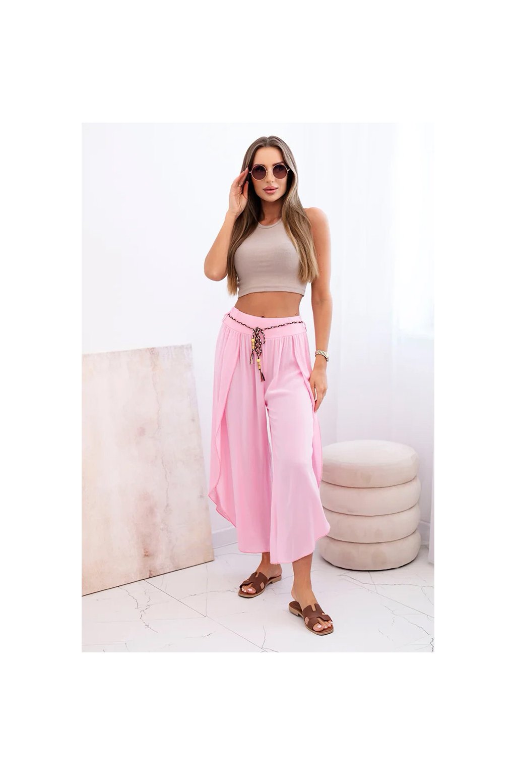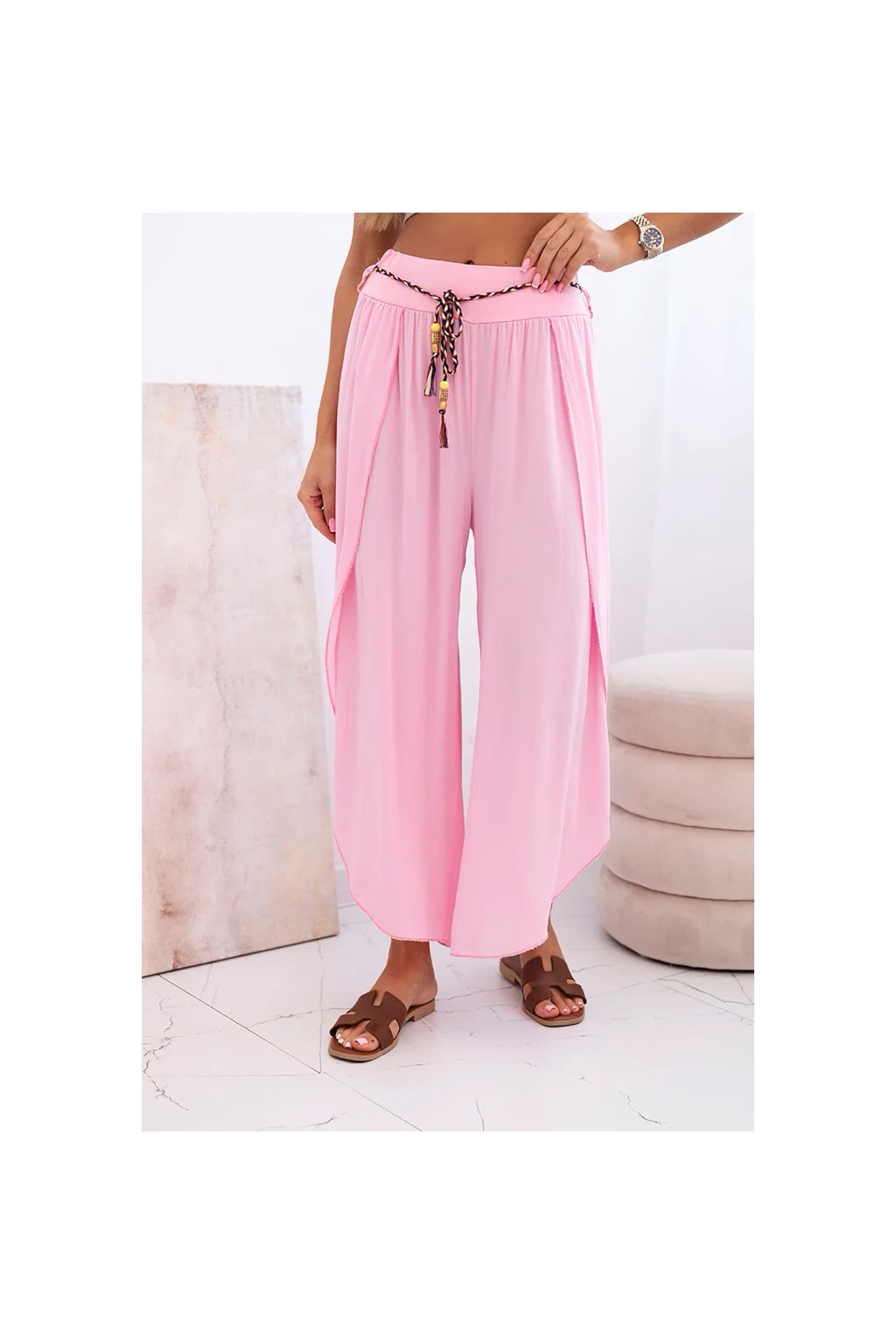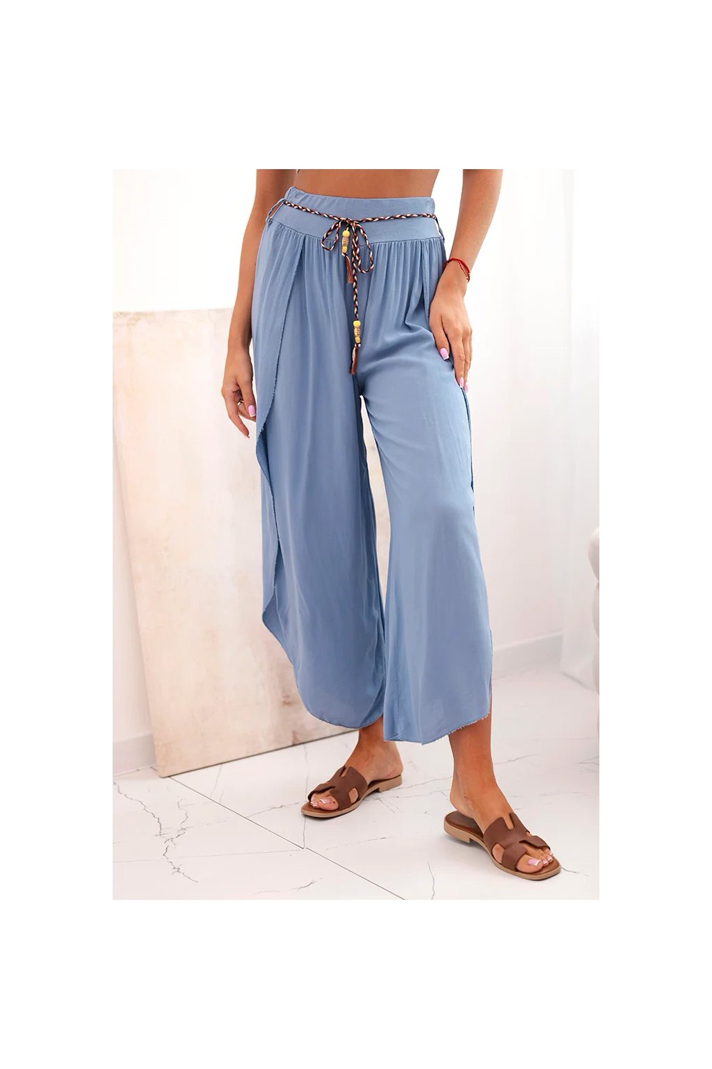 Tyto dámské kalhoty s širokými nohavicemi jsou ideální volbou na teplejší dny. Vyrobeny ze 100% vzdušné viskózy zaručují pohodlí a lehkost po celý den. Volný, splývavý střih nejen dodává styl, ale také zajišťuje volnost pohybu. Dekorativní šňůrka v pase dodává půvab a umožňuje lepší přizpůsobení pasu. Skvělý model na dovolenou, procházky po městě nebo letní setkání – můžete je kombinovat s topem, košilí nebo lehkou halenkou. Italská výroba je zárukou kvality a stylového vzhledu. Velikost je univerzální a bude vhodná pro dámy velikosti S, M nebo L.