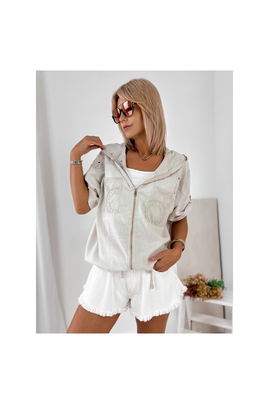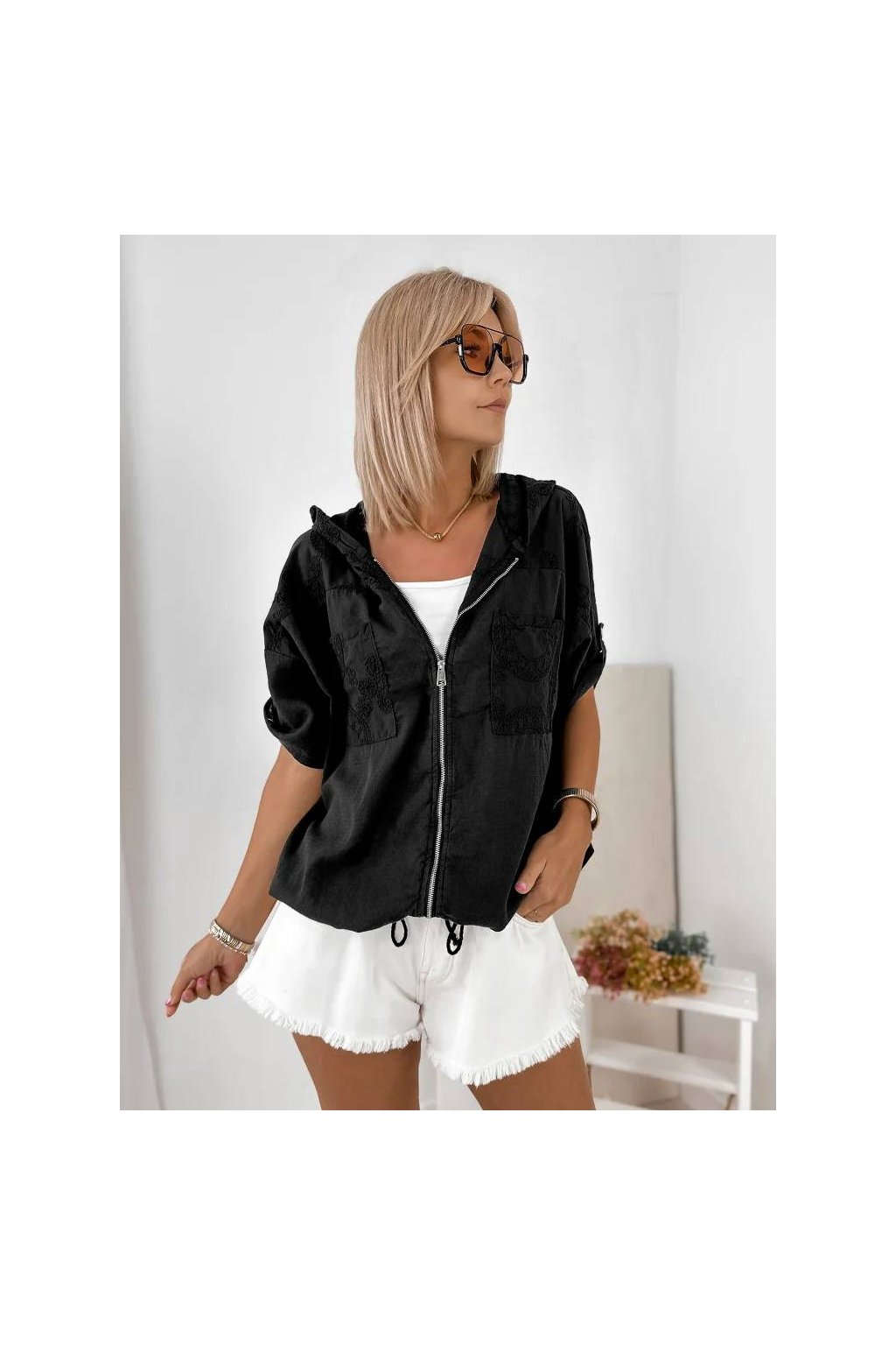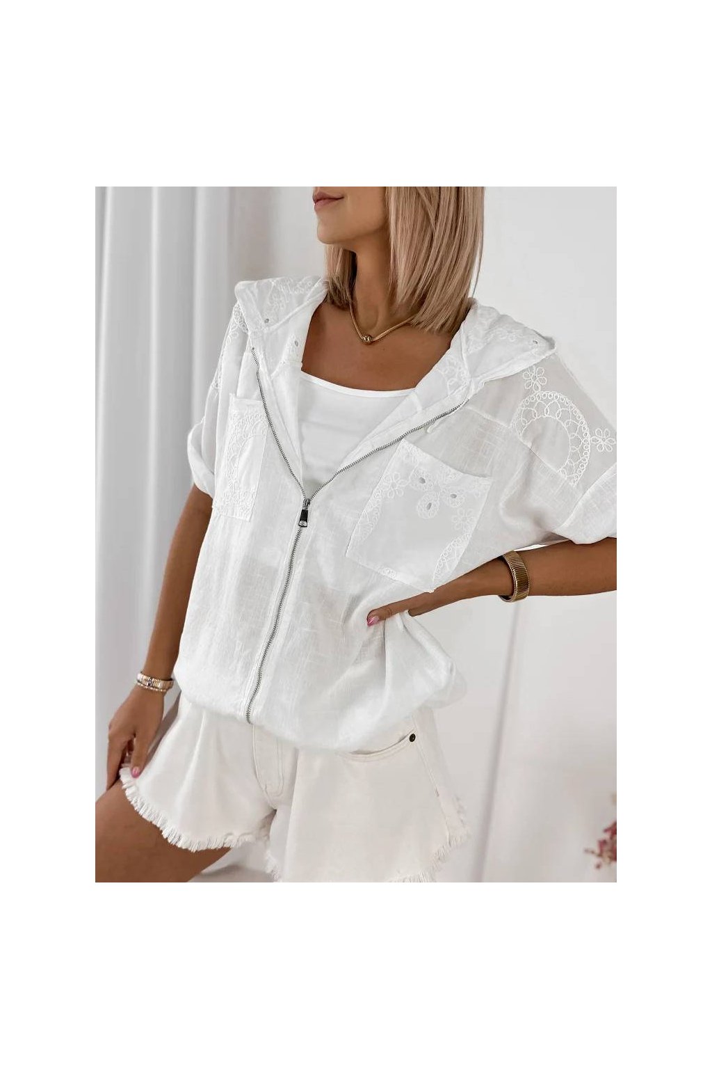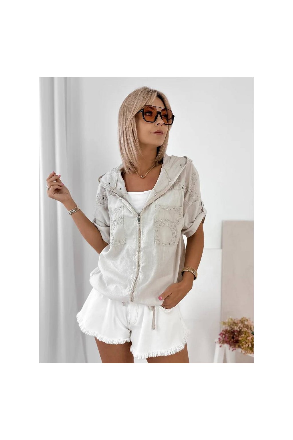 Model je vyroben z příjemné směsi bavlny, lnu a tencelu, která je prodyšná, lehká a ideální pro teplejší dny. Jemný květinový vzor dodává halence ženský detail, zatímco zapínání na zip, kapuce a stahování ve spodní části zajišťují praktičnost i moderní vzhled.