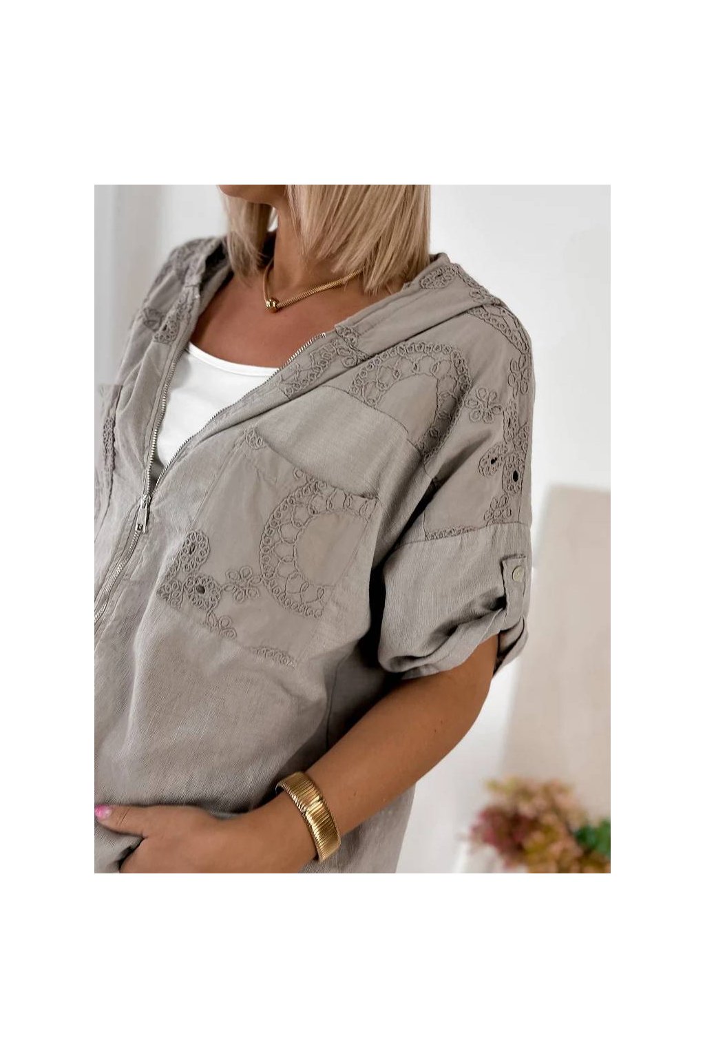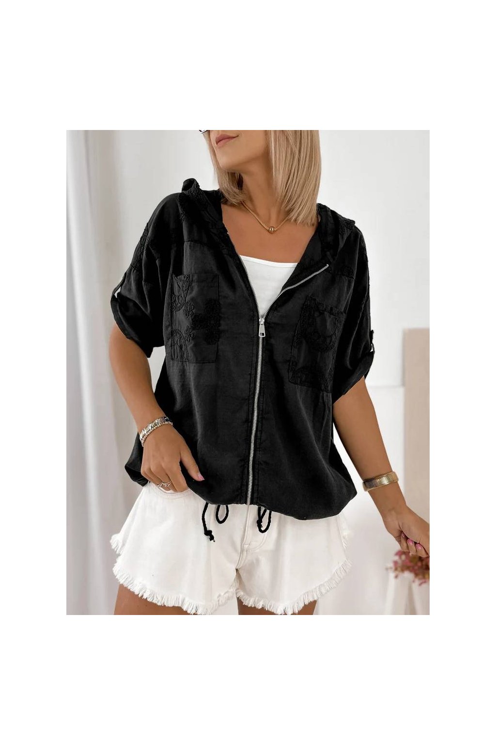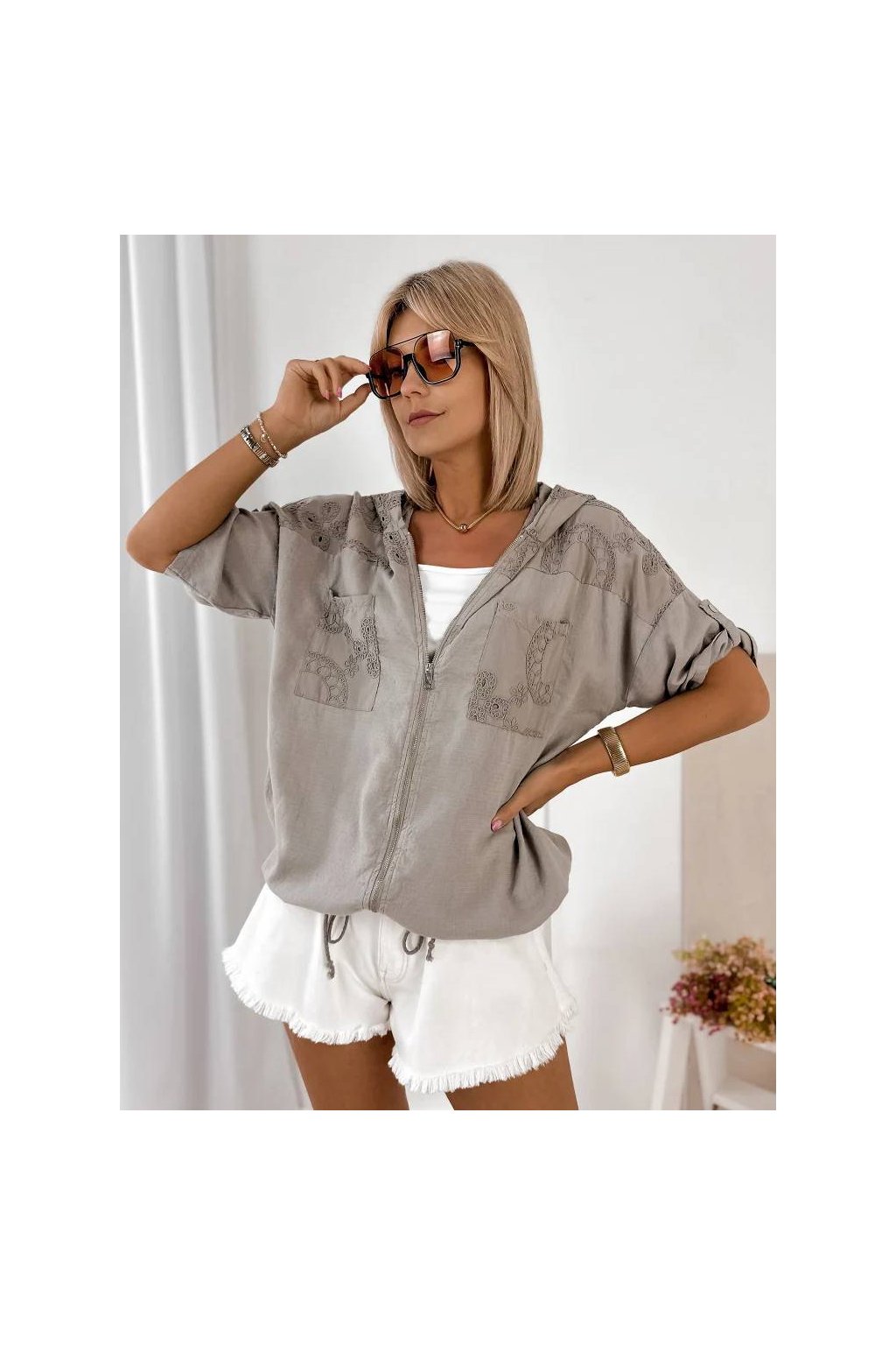 Model je vyroben z příjemné směsi bavlny, lnu a tencelu, která je prodyšná, lehká a ideální pro teplejší dny. Jemný květinový vzor dodává halence ženský detail, zatímco zapínání na zip, kapuce a stahování ve spodní části zajišťují praktičnost i moderní vzhled.