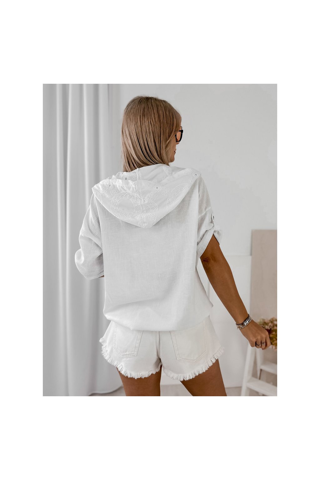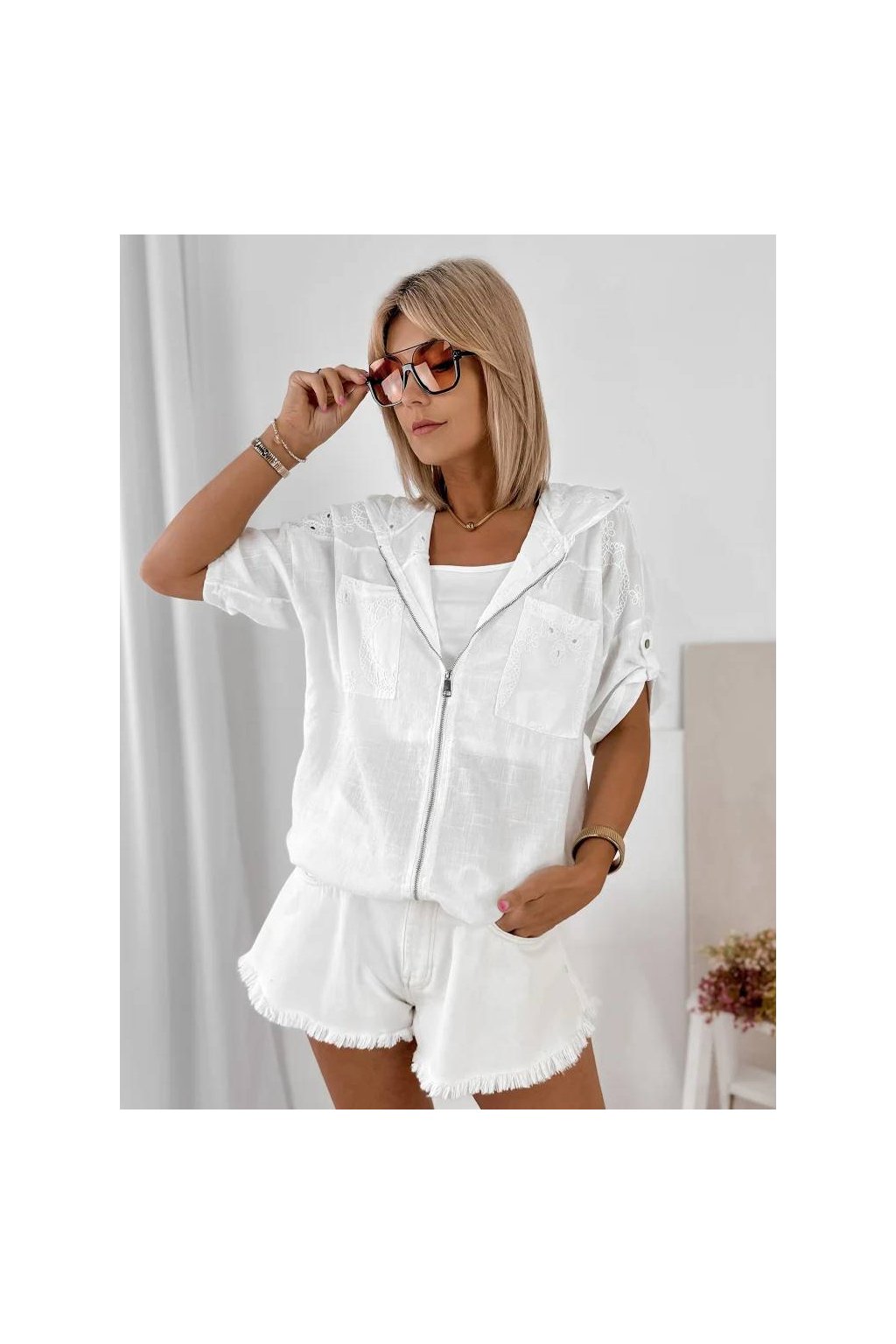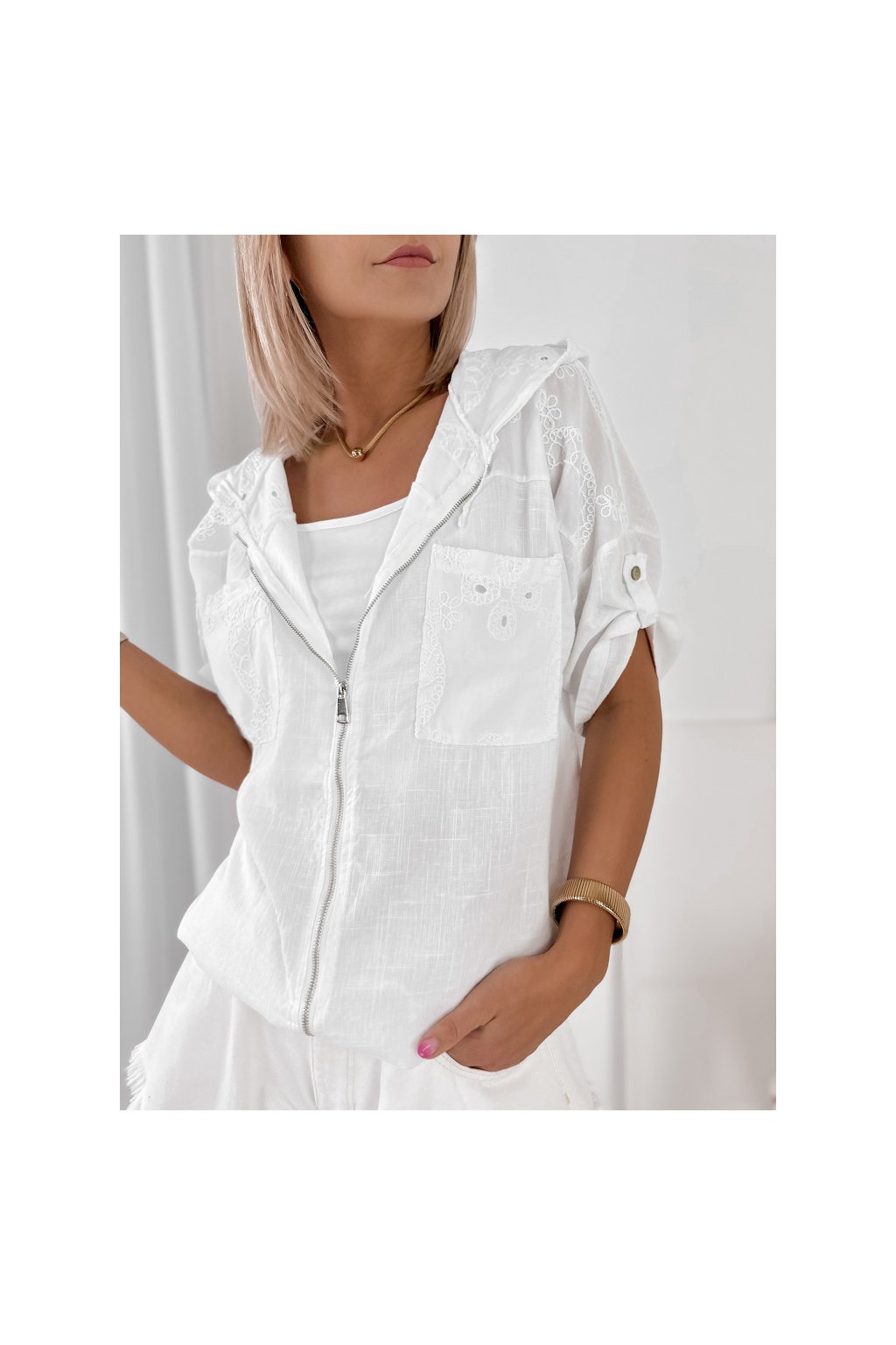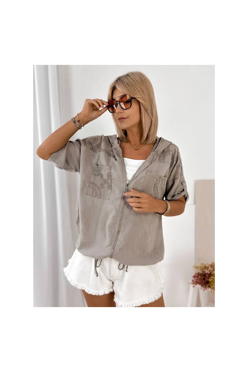 Model je vyroben z příjemné směsi bavlny, lnu a tencelu, která je prodyšná, lehká a ideální pro teplejší dny. Jemný květinový vzor dodává halence ženský detail, zatímco zapínání na zip, kapuce a stahování ve spodní části zajišťují praktičnost i moderní vzhled.