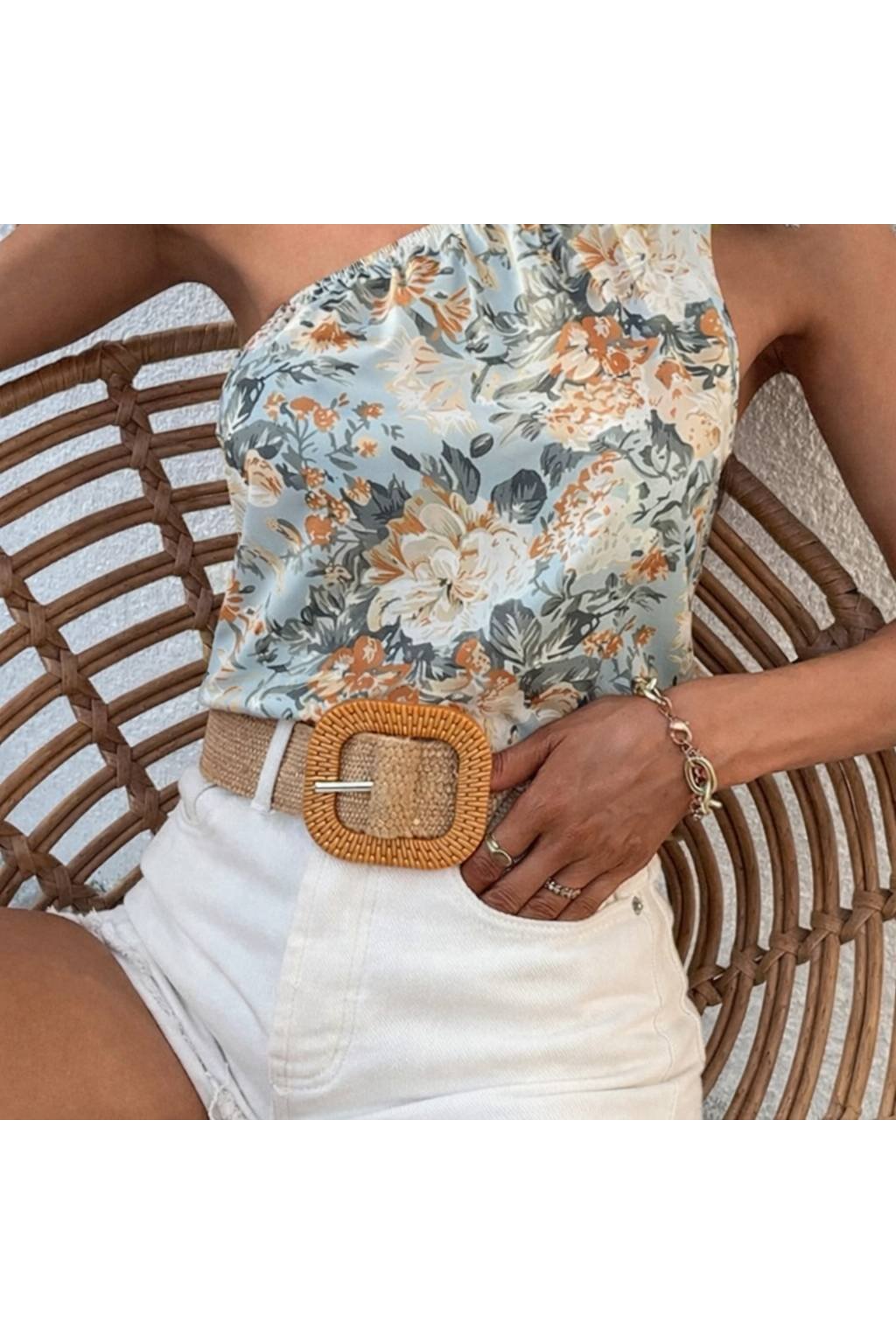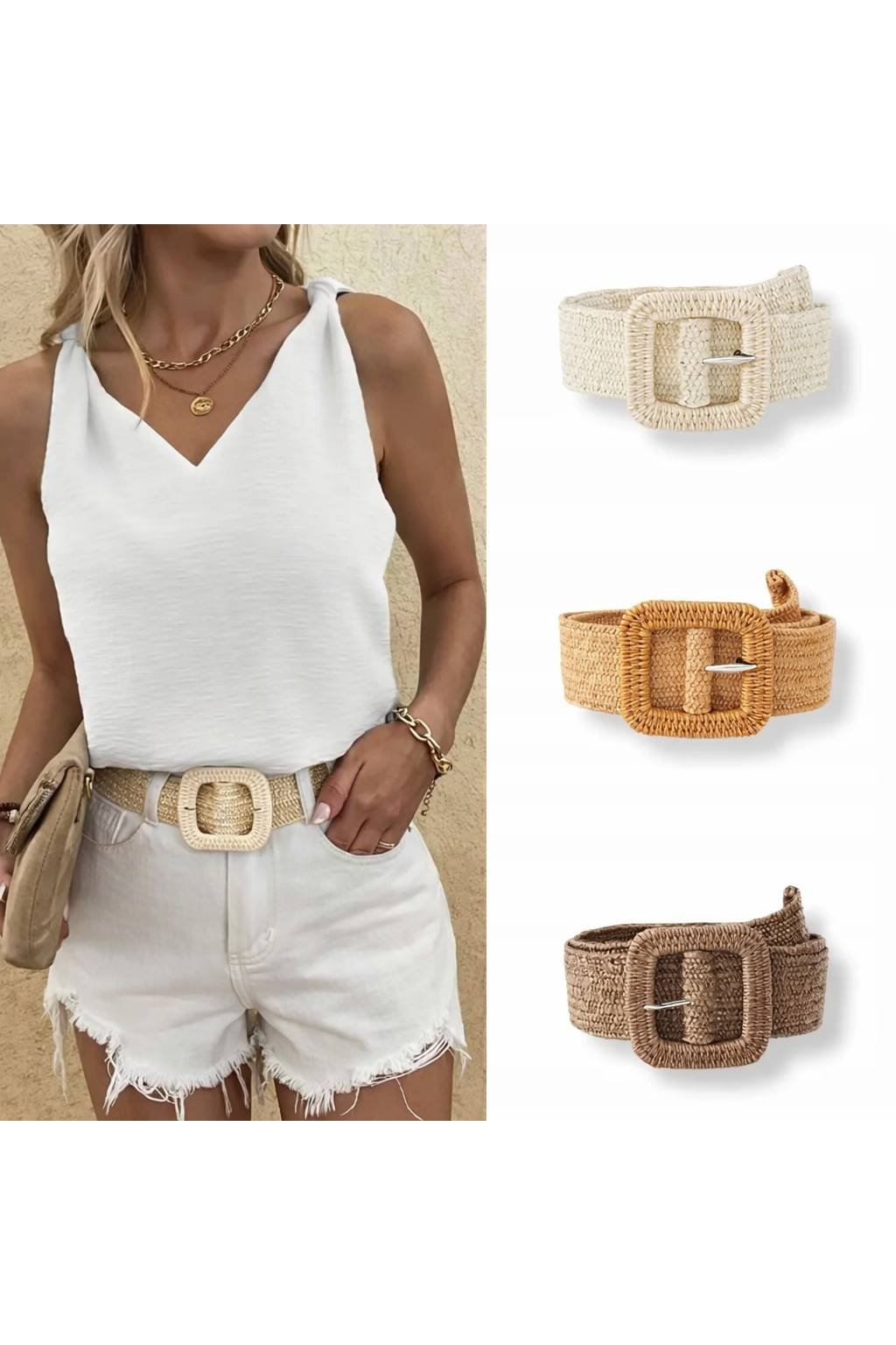 Přírodní vzhled v kombinaci s výraznou čtvercovou sponou dodává každému outfitu moderní letní nádech – ideální k šatům, tunikám i lehkým kalhotám.