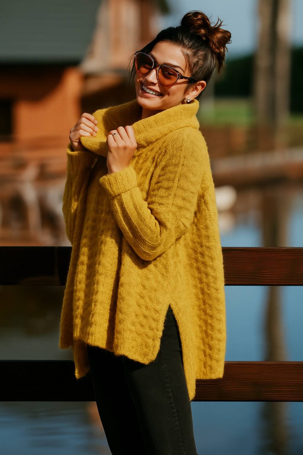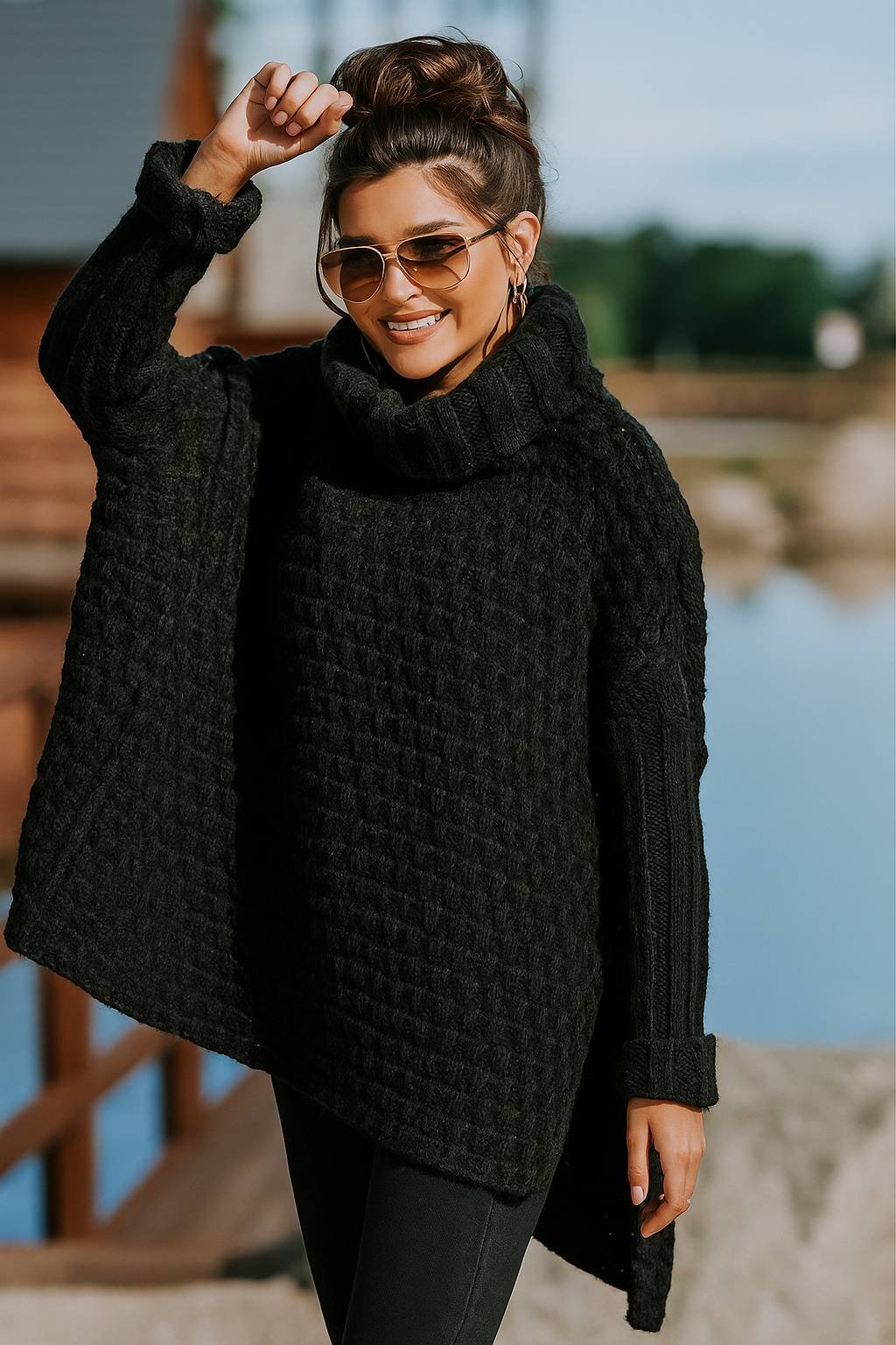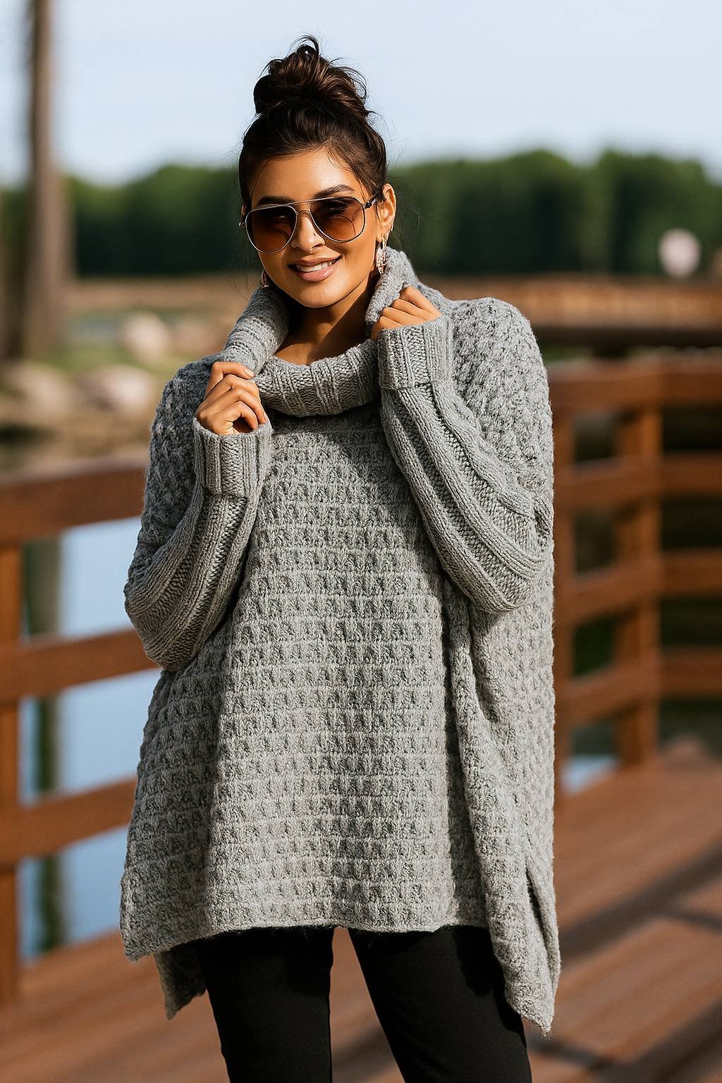 Pončo s rolákem pro chladné dny. Svetr z měkkého materiálu s nádechem vlny je jako stvořený pro chladné dny. Jedná se o oversize model prodlouženého mírně asymetrického střihu s velkým teplým rolákem. Na bocích jsou malé rozparky, dlouhé rukávy a spodní část je ukončena manžetami. .Tento look si zamilujete pro svou jednoduchost. Doporučujeme! Luxusní pletené svetříky, které si zamilujete a oblíbíte!