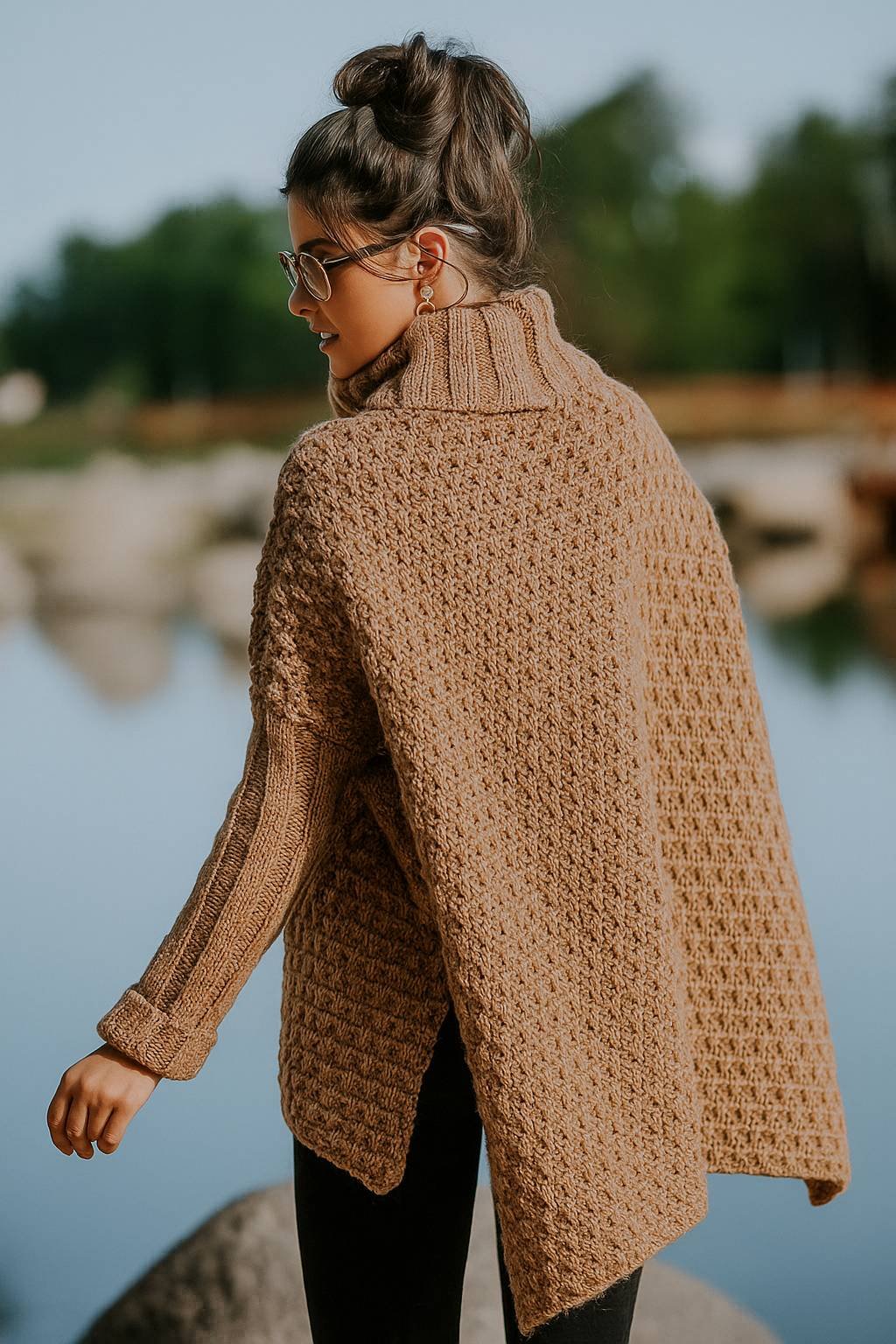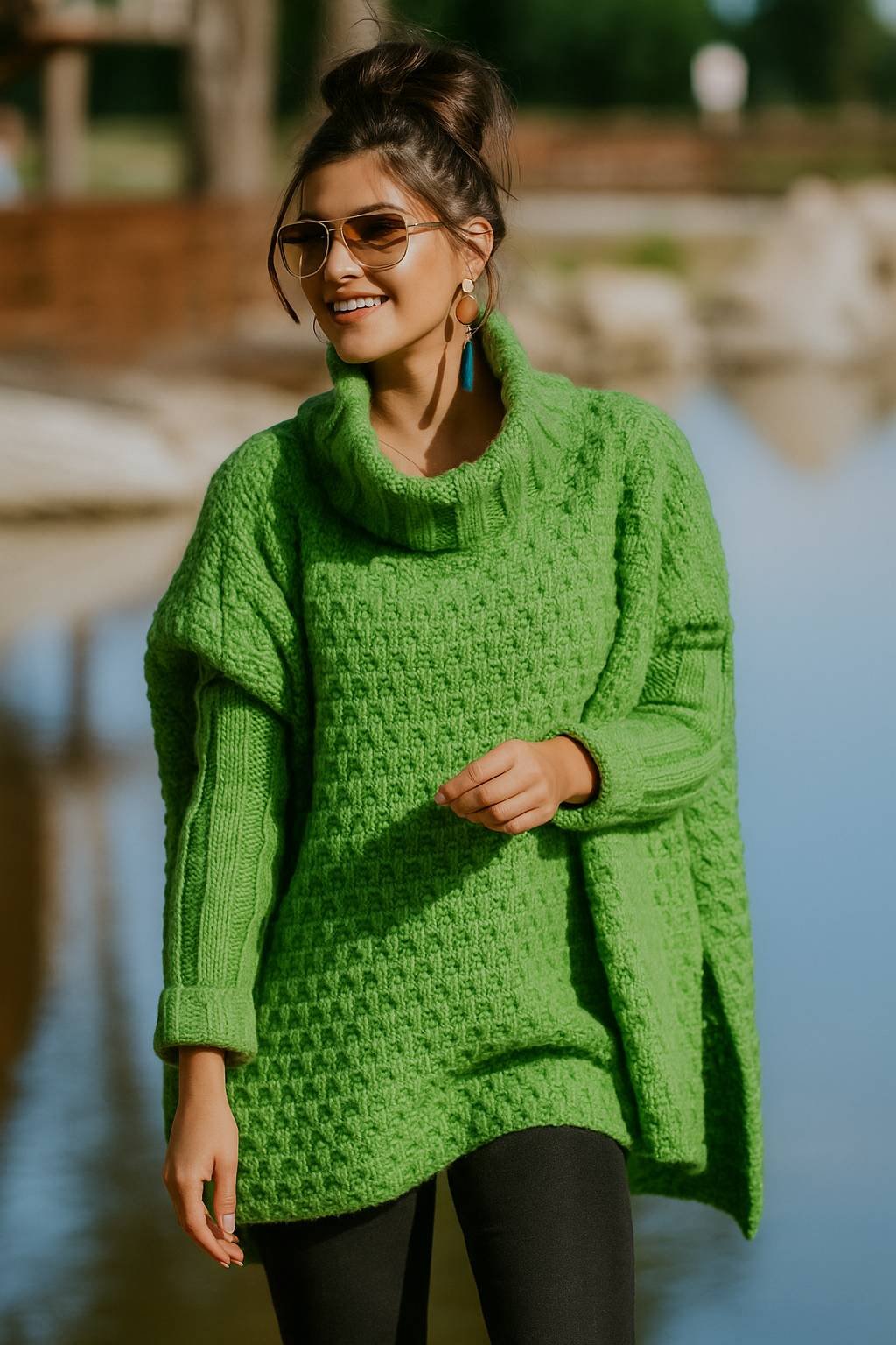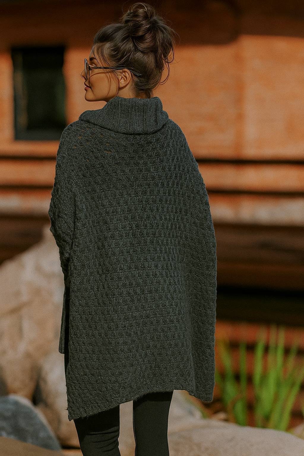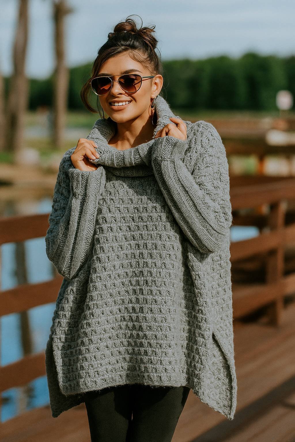 Pončo s rolákem pro chladné dny. Svetr z měkkého materiálu s nádechem vlny je jako stvořený pro chladné dny. Jedná se o oversize model prodlouženého mírně asymetrického střihu s velkým teplým rolákem. Na bocích jsou malé rozparky, dlouhé rukávy a spodní část je ukončena manžetami. .Tento look si zamilujete pro svou jednoduchost. Doporučujeme! Luxusní pletené svetříky, které si zamilujete a oblíbíte!