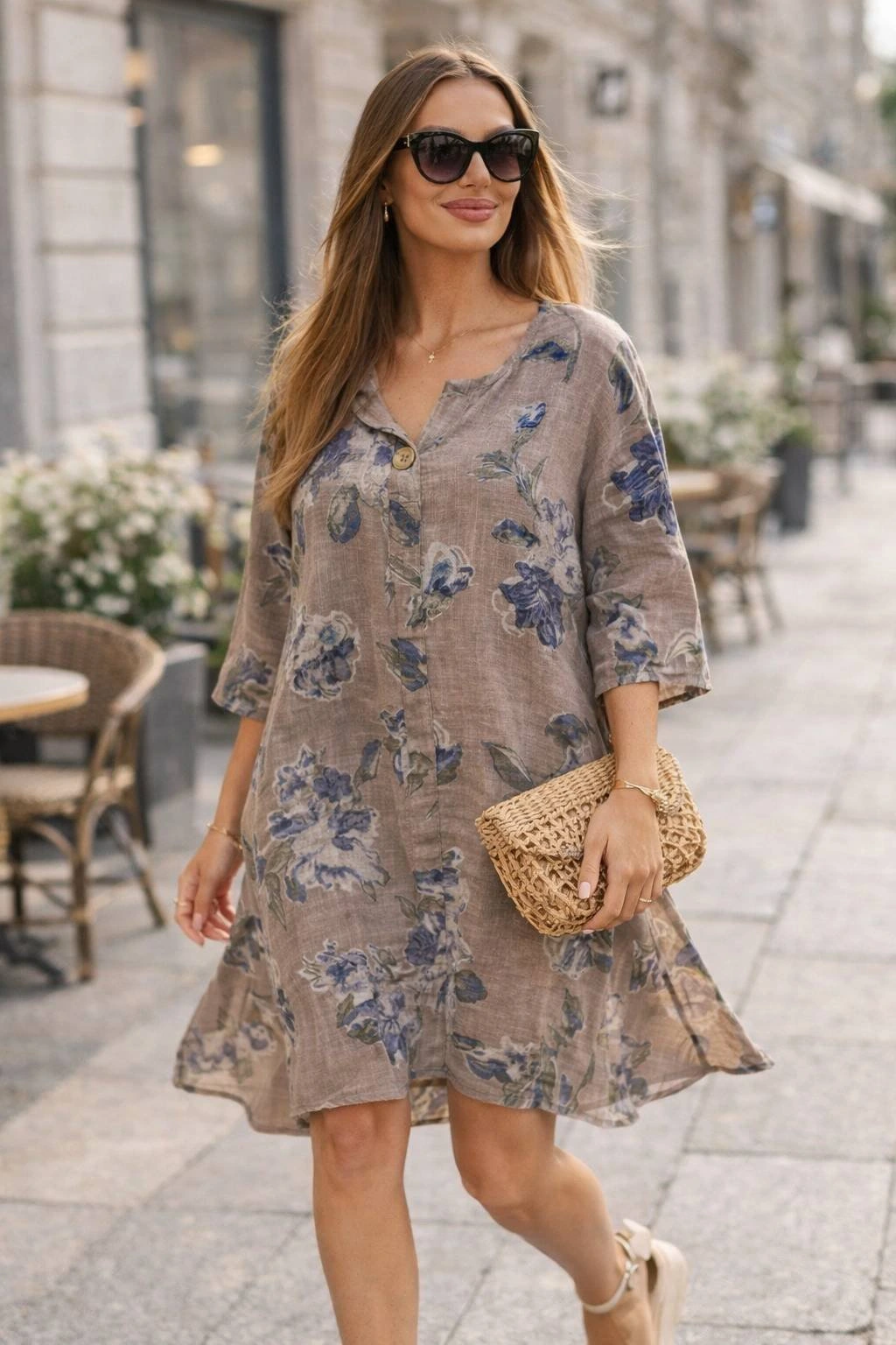 Hledáte pohodlné, lehké a ženské šaty na denní nošení? Tyto dámské šaty z příjemné bavlny jsou skvělou volbou na jaro a léto. Jemný květinový vzor a tlumená barevnost jí dodávají subtilní, přirozený charakter. Volný střih s lehce spadlým rukávem do lokte zajišťuje volnost pohybu a komfort nošení po celý den. Ideální na procházku, do práce i na setkání s přáteli. Výstřih s ozdobným knoflíkem a lehce asymetrický konec jí dodávají výjimečný půvab. Velikost je univerzální a bude vhodná pro dámy ve velikosti S, M nebo L.