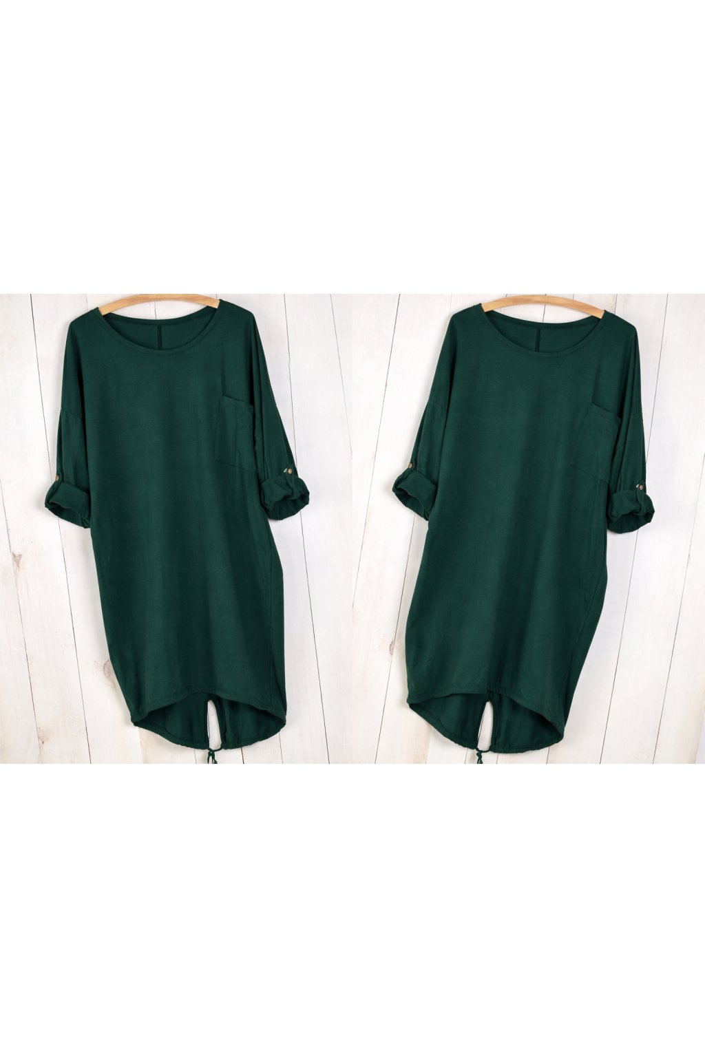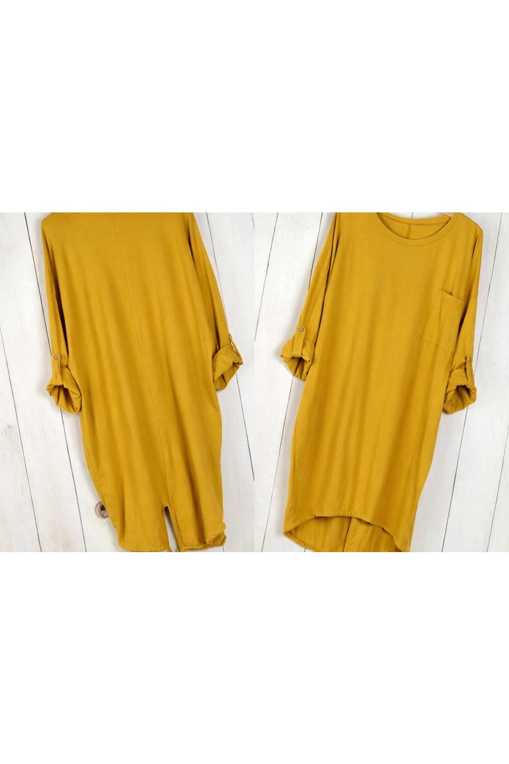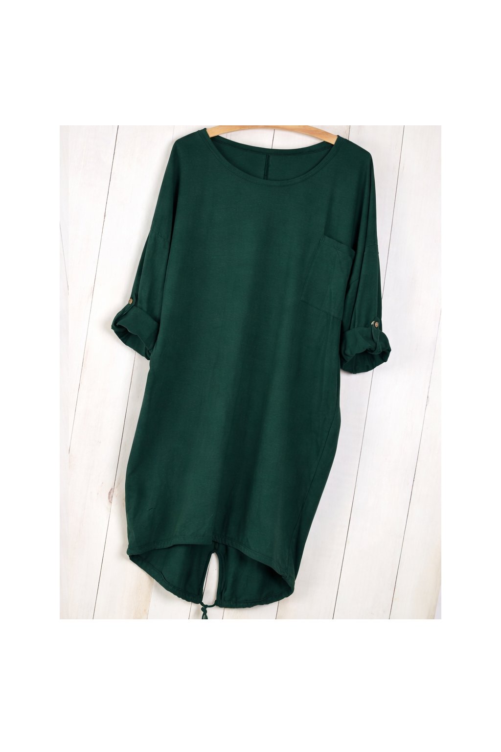 Tunika je vyrobena ze 100% kvalitní bavlny, která je měkká, prodyšná a příjemná na dotek. Praktická kapsa na hrudi dodává modelu ležérní charakter, zatímco rukávy s možností ohrnutí a zapnutí umožňují přizpůsobit styl podle příležitosti.