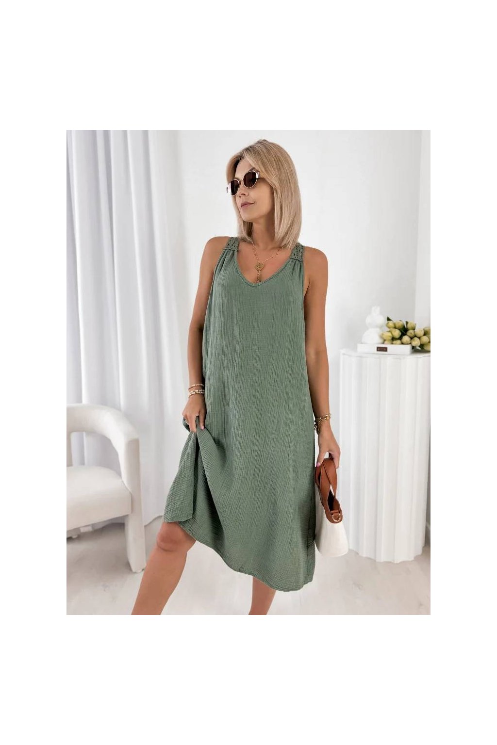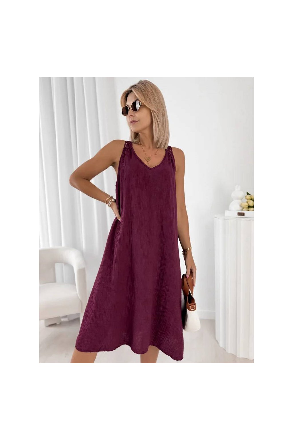 Lehký a prodyšný materiál zajišťuje maximální pohodlí při nošení. Volný střih krásně splývá na postavě a dodává šatům moderní a ženský vzhled.