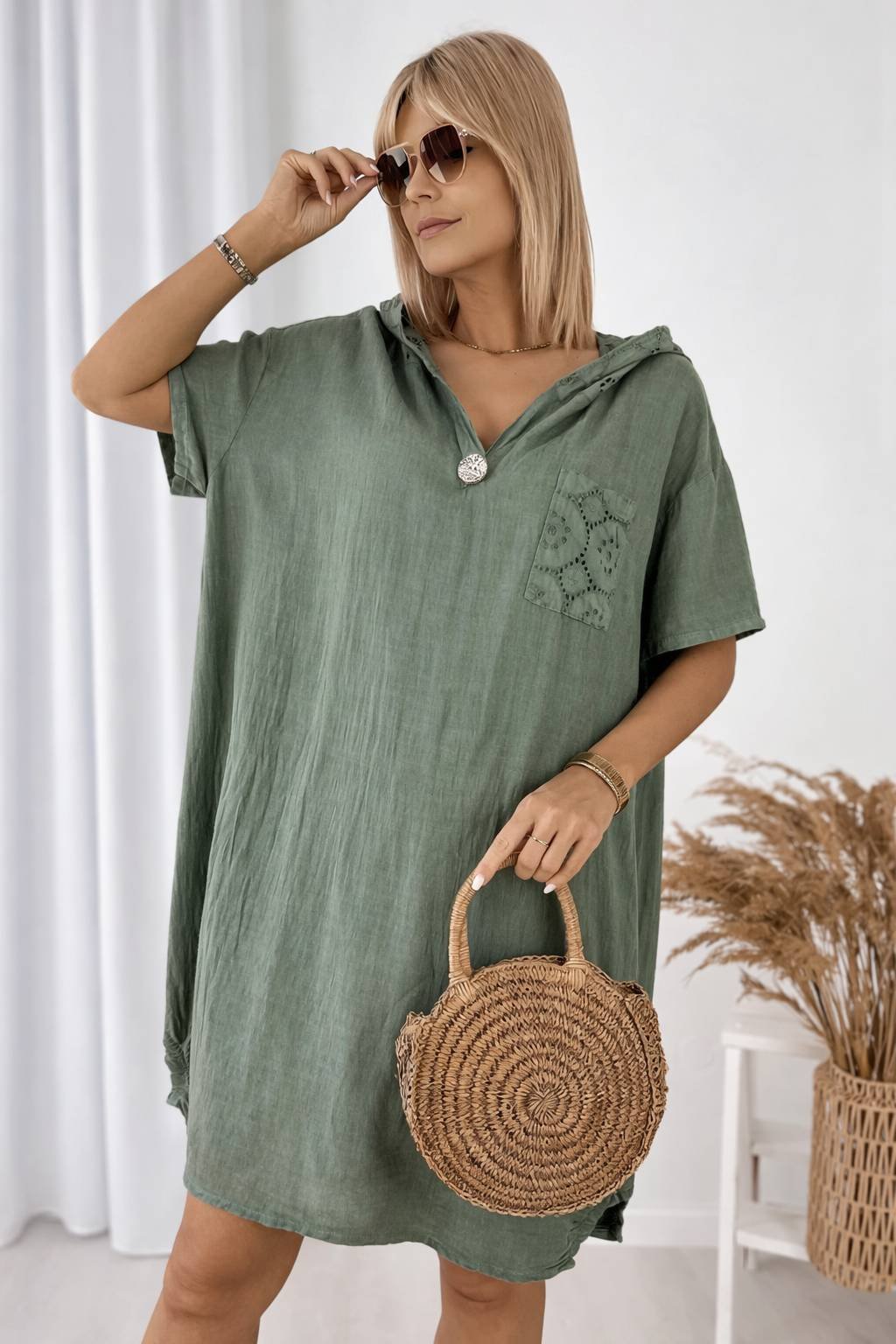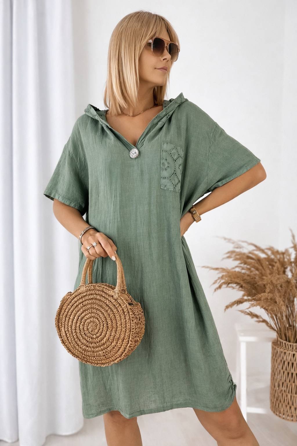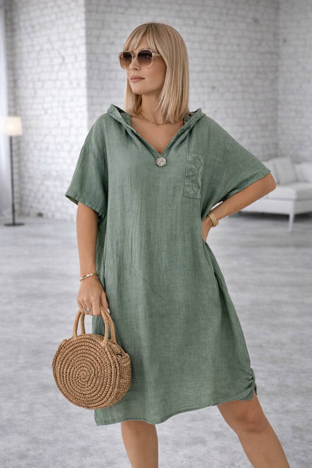 Vzdušné dámské šaty ideální na jarní a letní dny. Lehký lněno-bavlněný materiál zajišťuje maximální pohodlí i při vyšších teplotách. Volný, lehce áčkový střih krásně splývá na postavě a hodí se pro velikosti S–L.