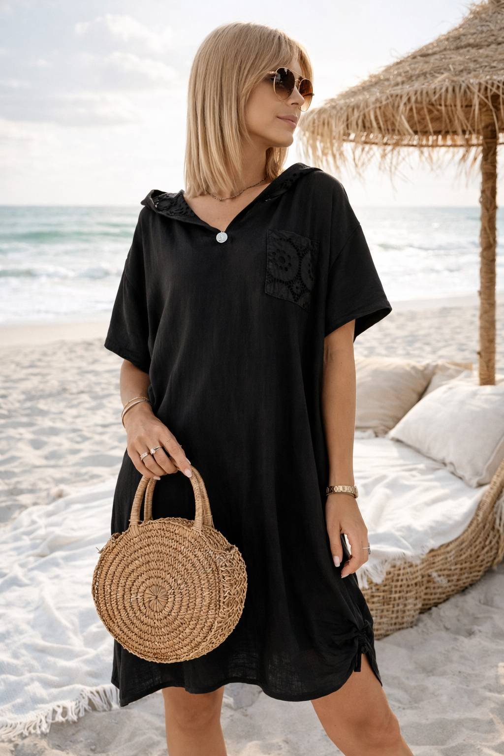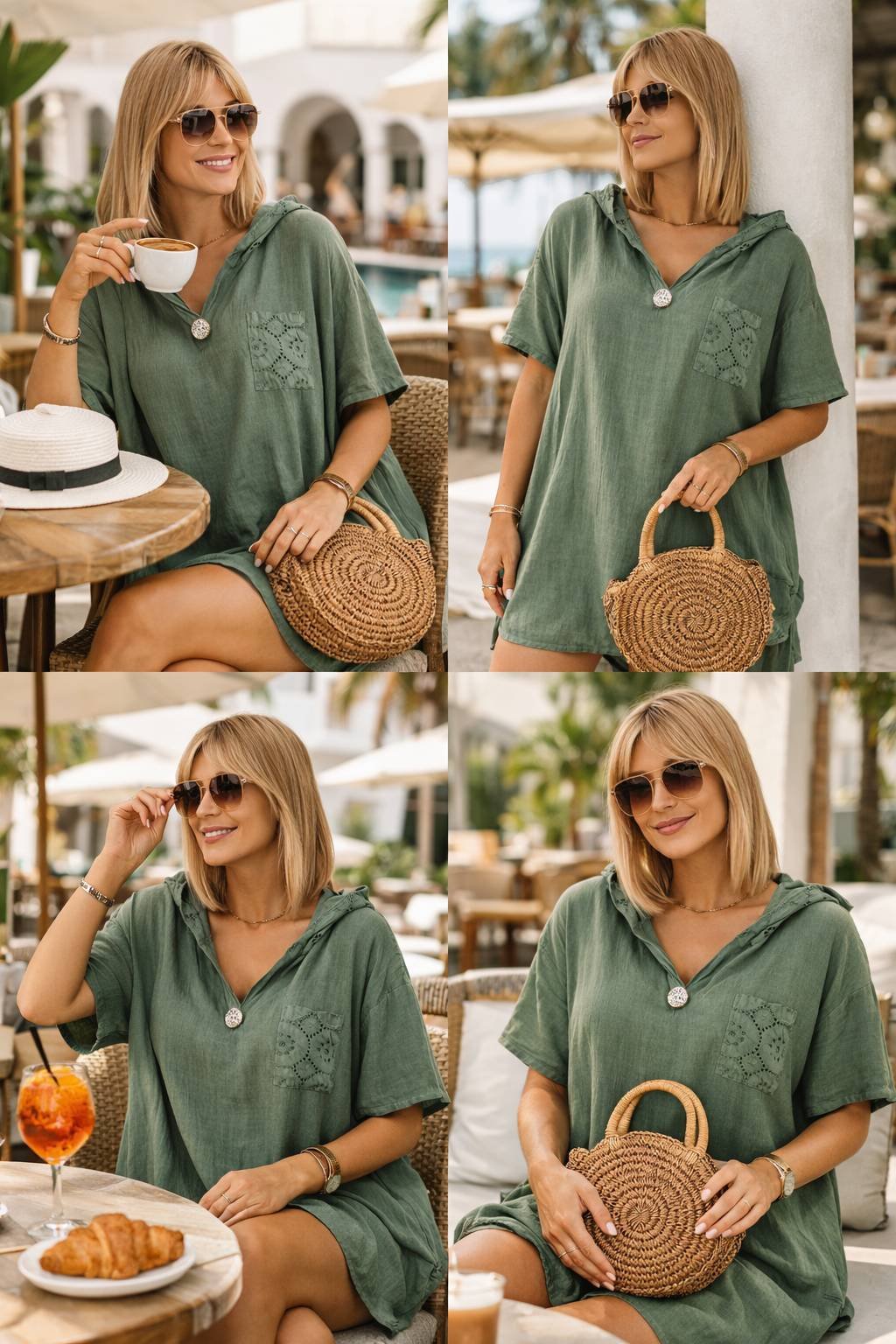 Model je bez rukávů, s jemným V výstřihem (serek) a praktickými kapsami, které dodávají šatům ležérní, ale zároveň stylový charakter. Skvěle se hodí na běžné nošení, dovolenou, procházky městem i letní posezení.