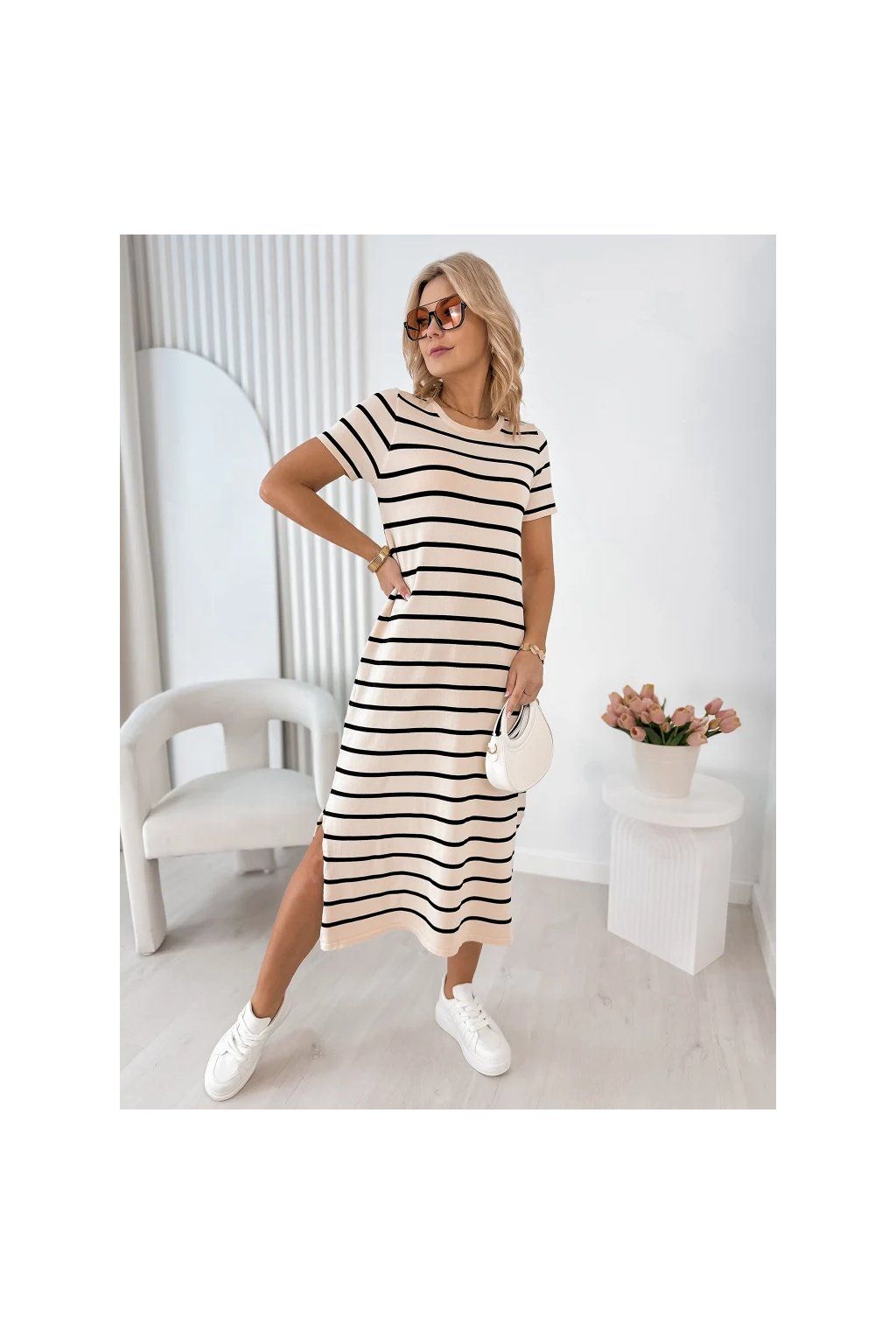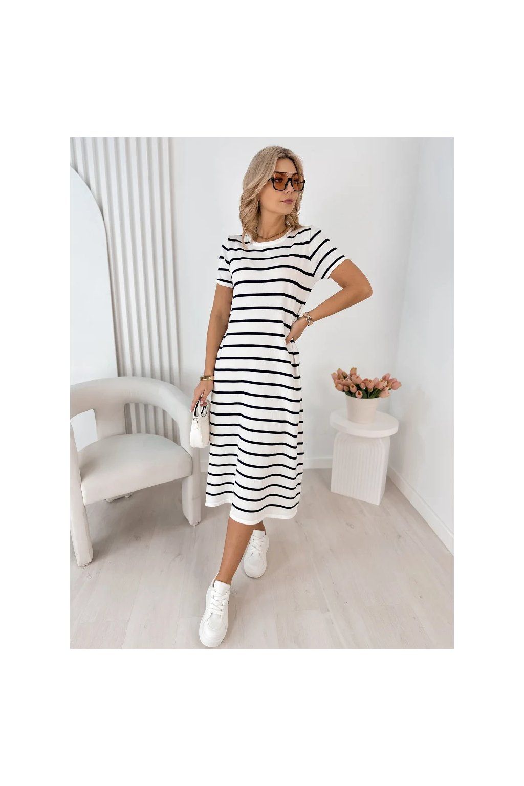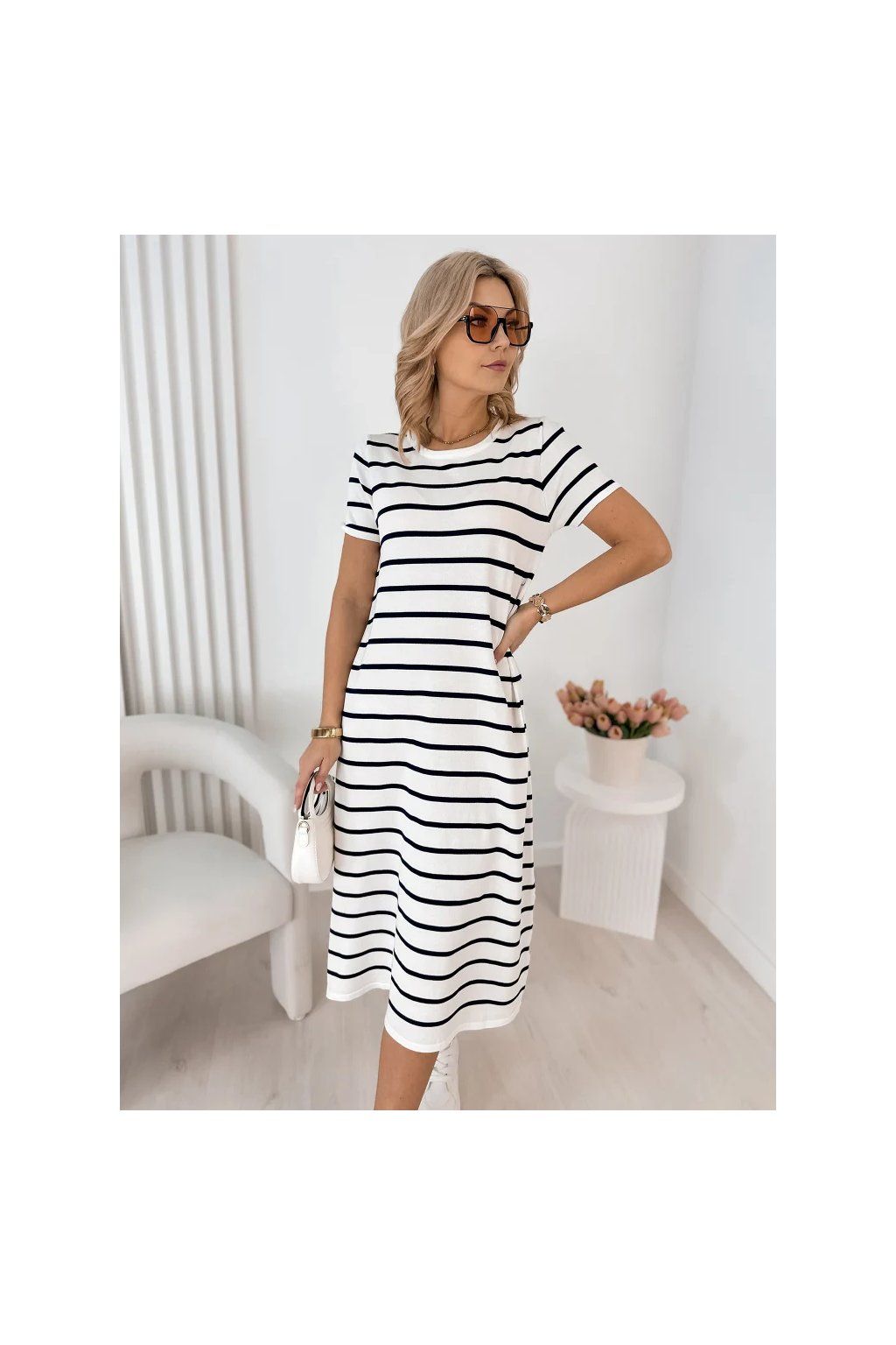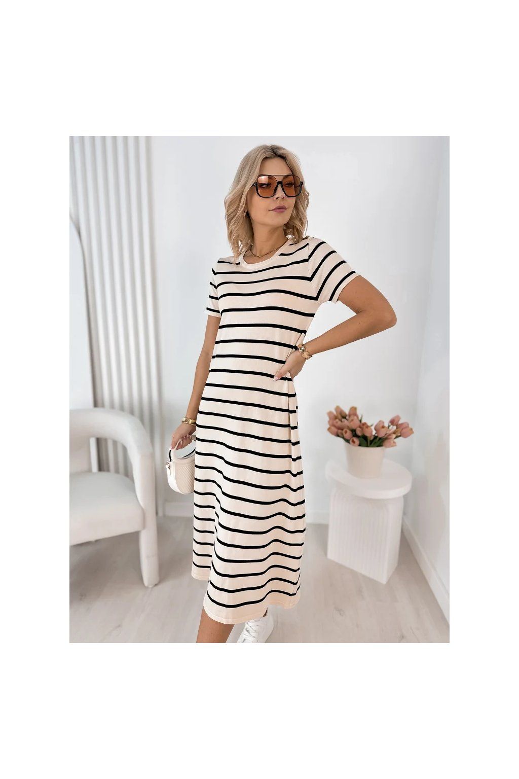 Lehké, vzdušné a maximálně pohodlné – tyto dámské midi šaty s jemným pruhovaným vzorem jsou ideální volbou pro každodenní nošení i letní procházky městem.