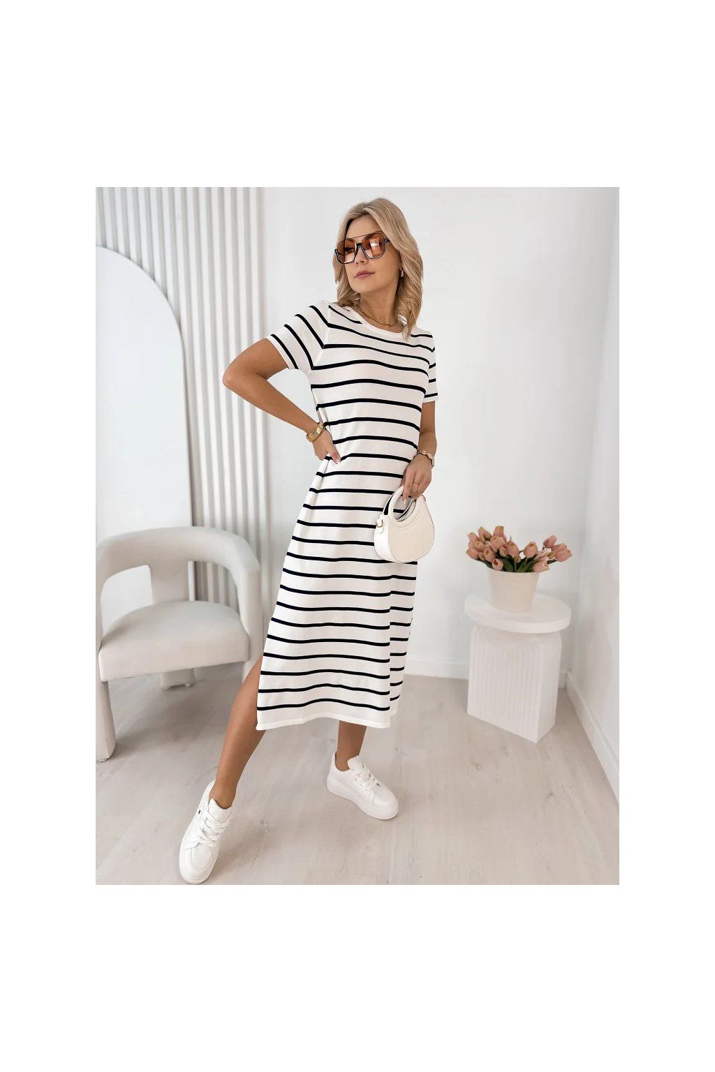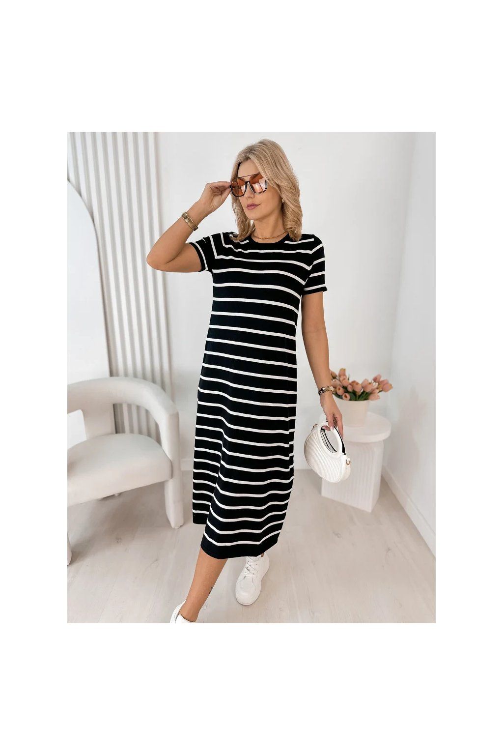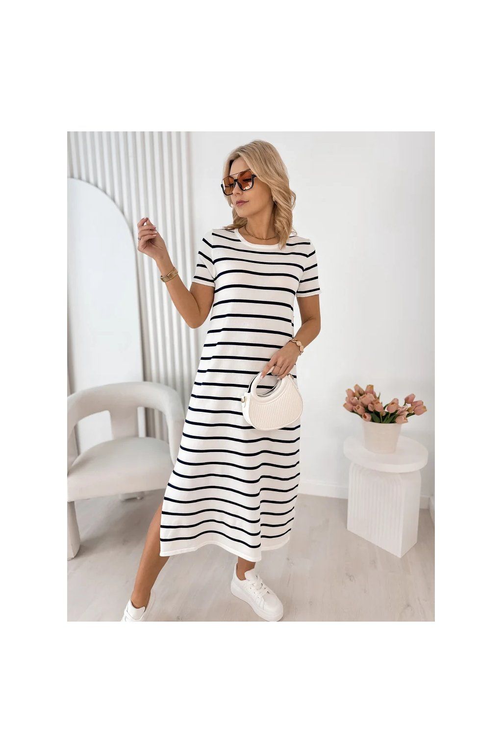 Lehké, vzdušné a maximálně pohodlné – tyto dámské midi šaty s jemným pruhovaným vzorem jsou ideální volbou pro každodenní nošení i letní procházky městem.