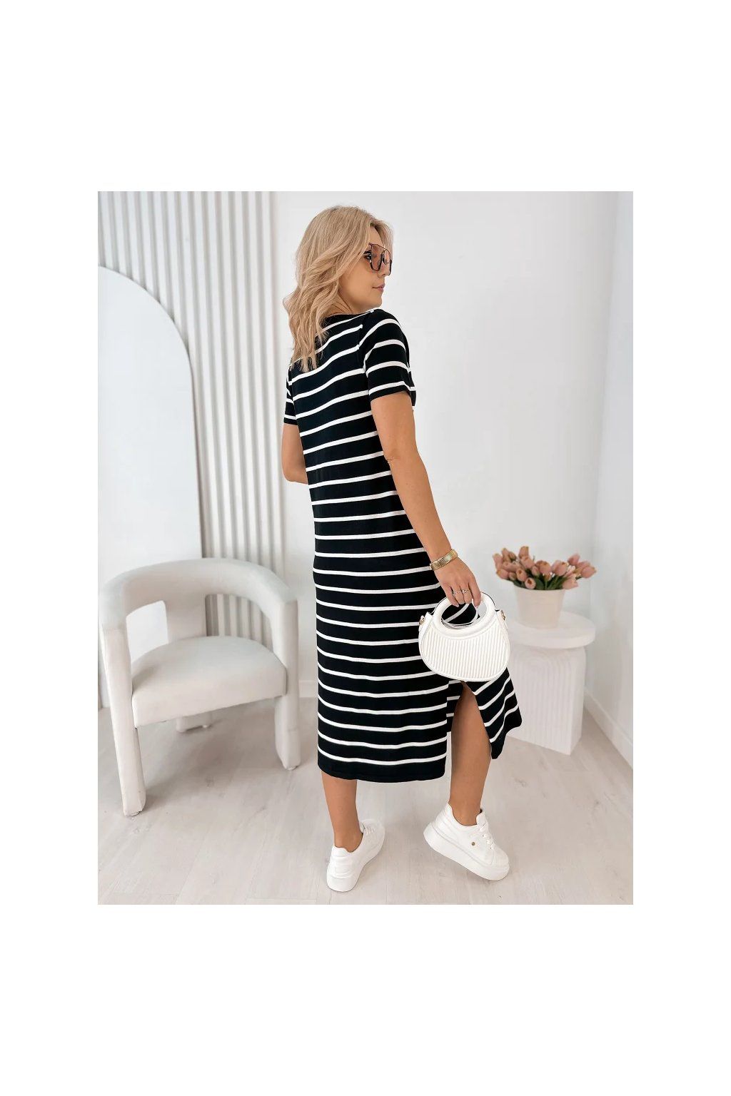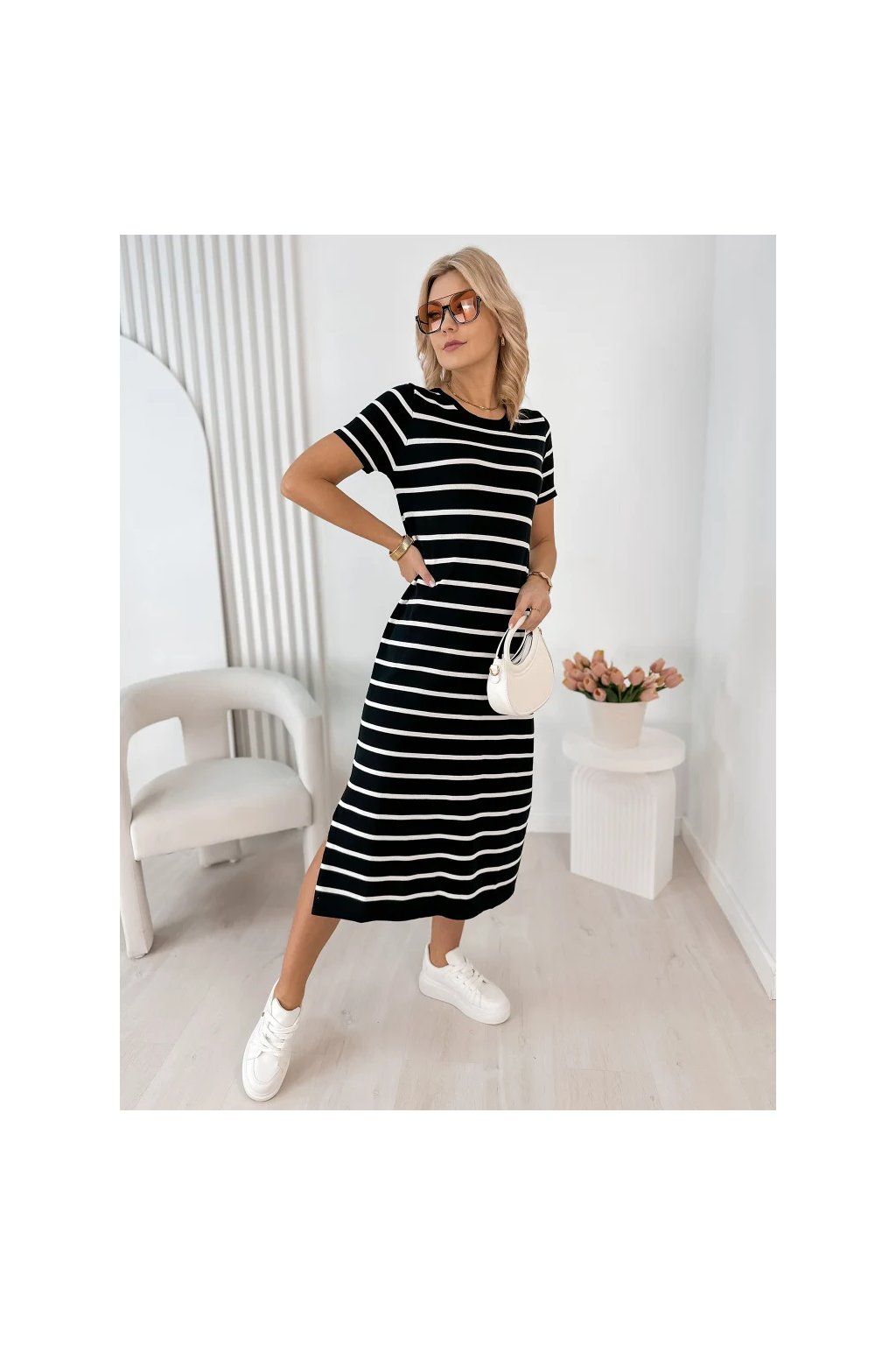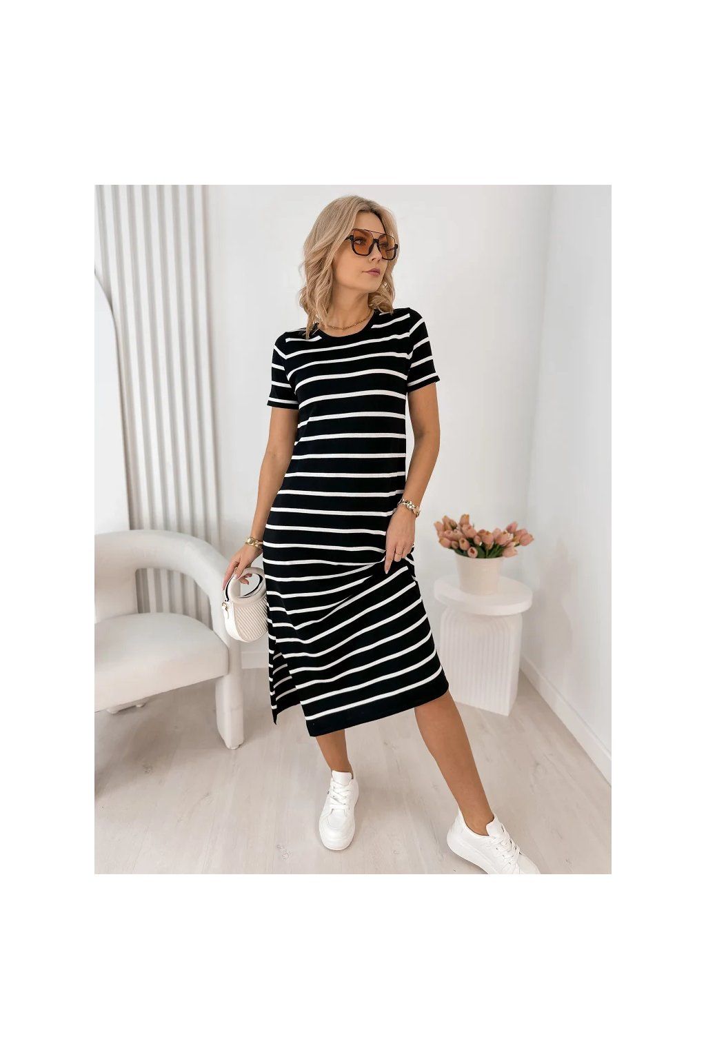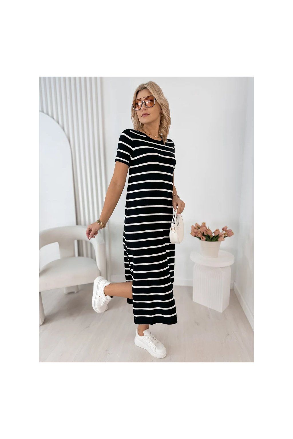 Lehké, vzdušné a maximálně pohodlné – tyto dámské midi šaty s jemným pruhovaným vzorem jsou ideální volbou pro každodenní nošení i letní procházky městem.