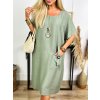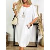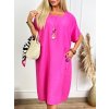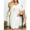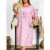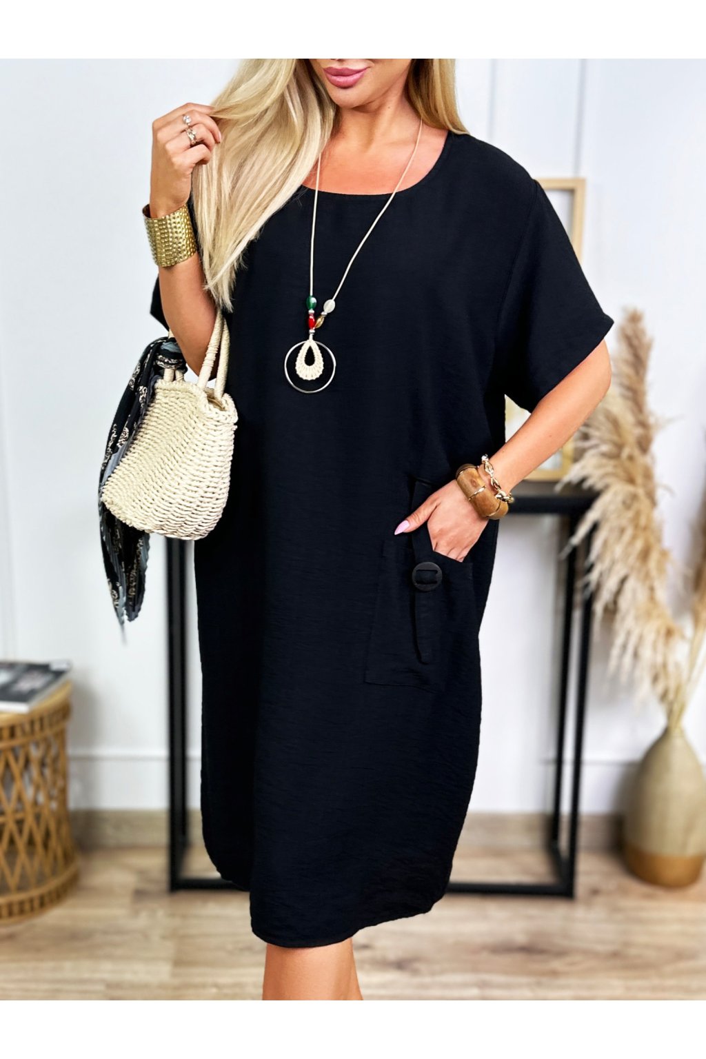 Viskózové šaty s krátkým rukávem a kulatým výstřihem. Vyrobeny z lehkého, vzdušného materiálu - budou perfektní pro teplé dny. Volný, oversized střih zajišťuje pohodlí a praktičnost. Šaty mají vpředu kapsu s ozdobnou sponou. Další výhodou je stylový náhrdelník, který je součástí sady.Přívěsek je součástí setu (jeho vzor se může lišit). Střih volný, rozšířený-skvěle umožňuje skrýt nedostatky postavy.