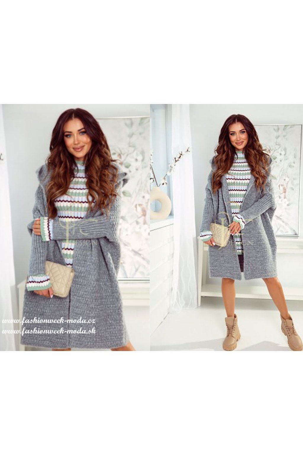 Teplý cardigan s příměsí vlny by měl být nepostradatelným prvkem každého šatníku. Jedná se o dlouhý, oversize model s kapucí. Model s padlými rameny a žebrovanými rukávy má vpředu kapsy. Dostupný v mnoha barvách.