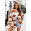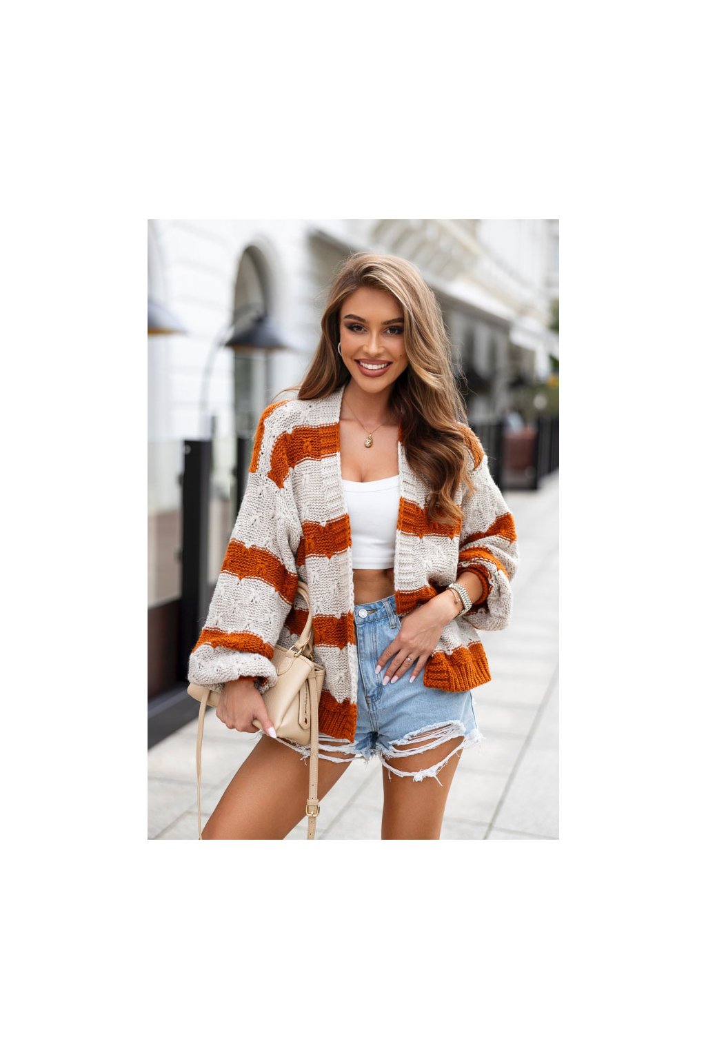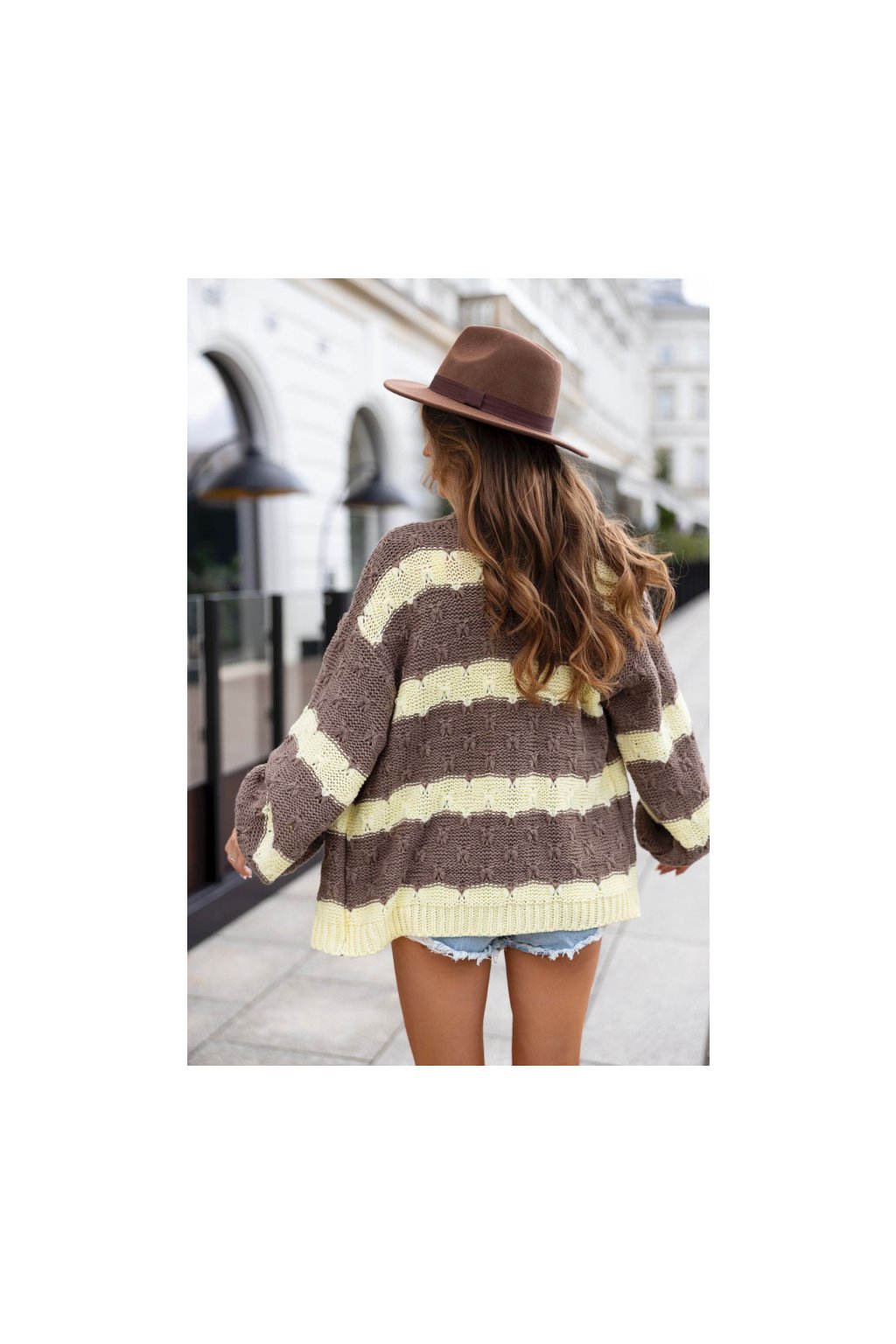 Kardigan s příměsí vlny je skvělou volbou pro outfity do chladnějších dnů. Vyniká skvělou barevnou kombinací a širokými rukávy zakončenými lemy. Tento oversize svetr má krátký střih a není zapínací.