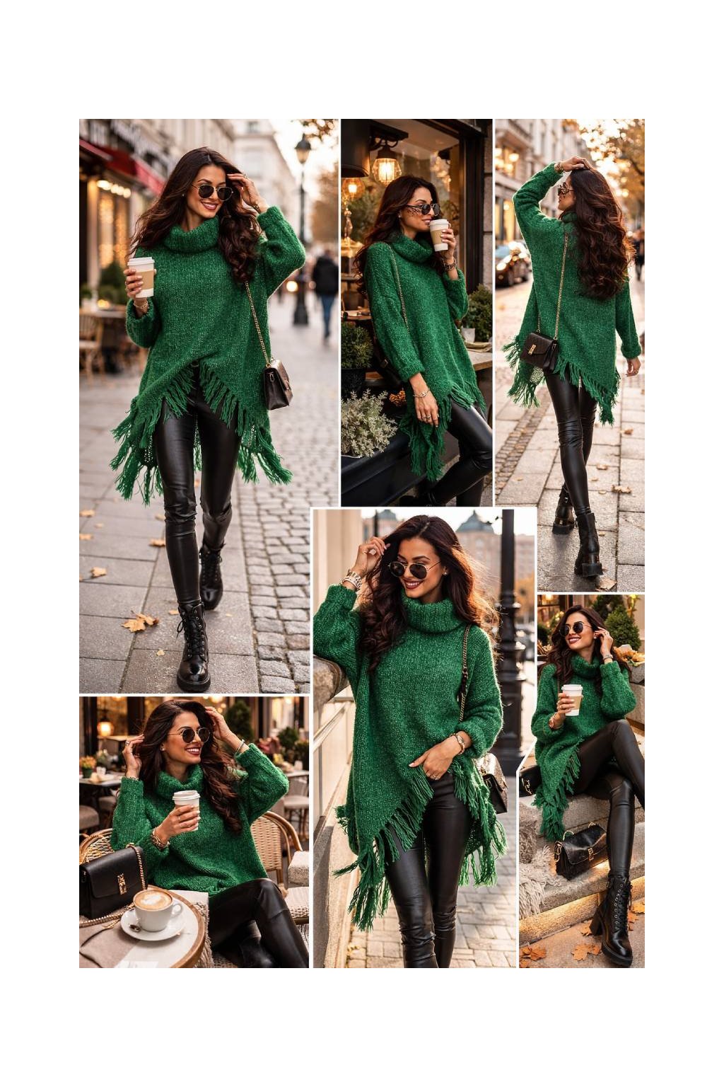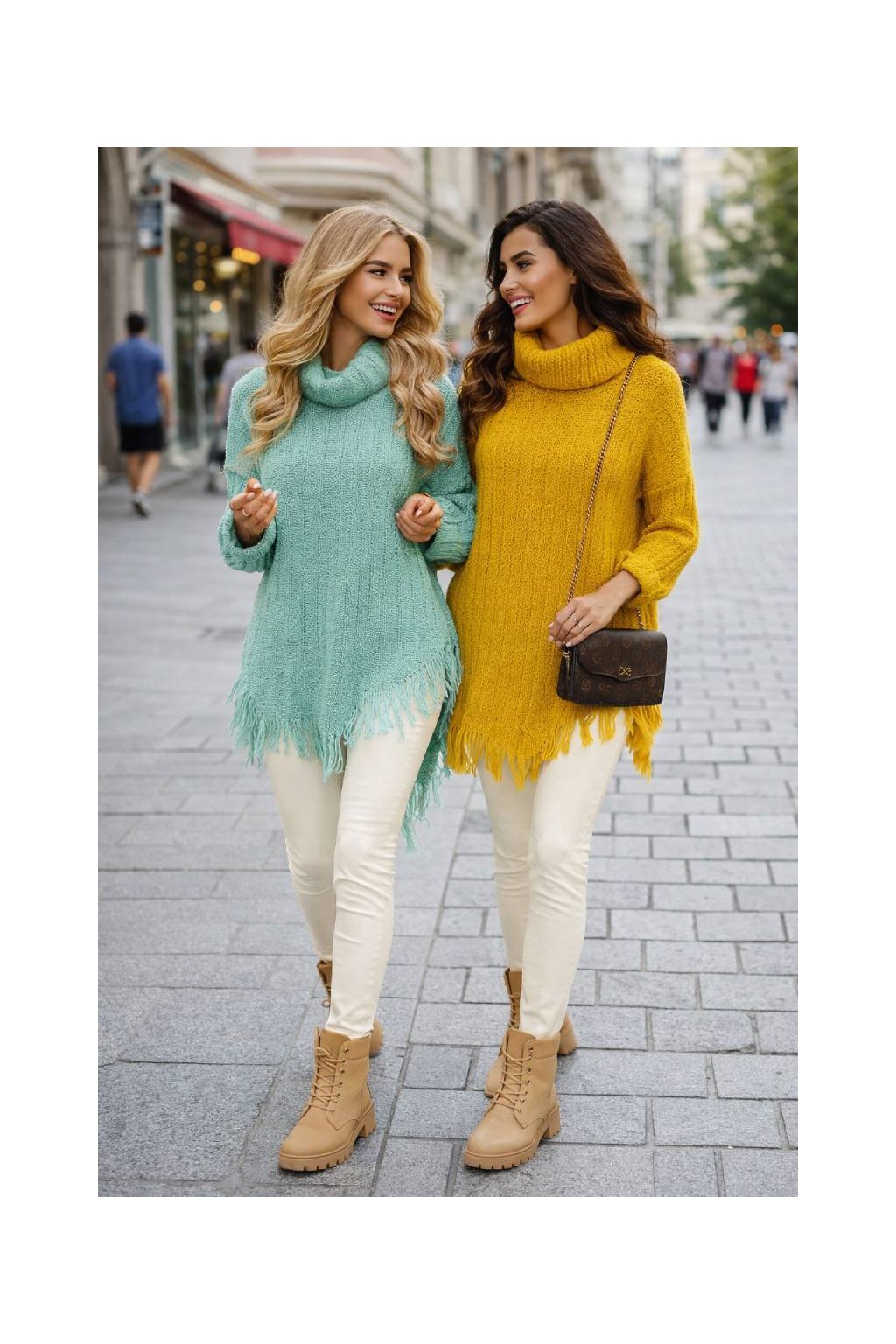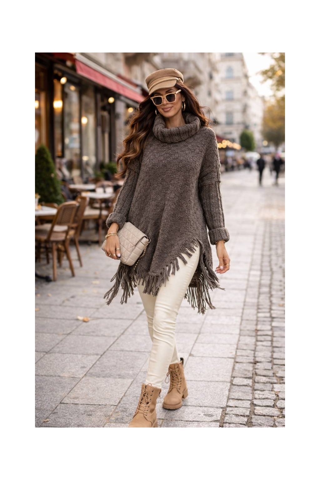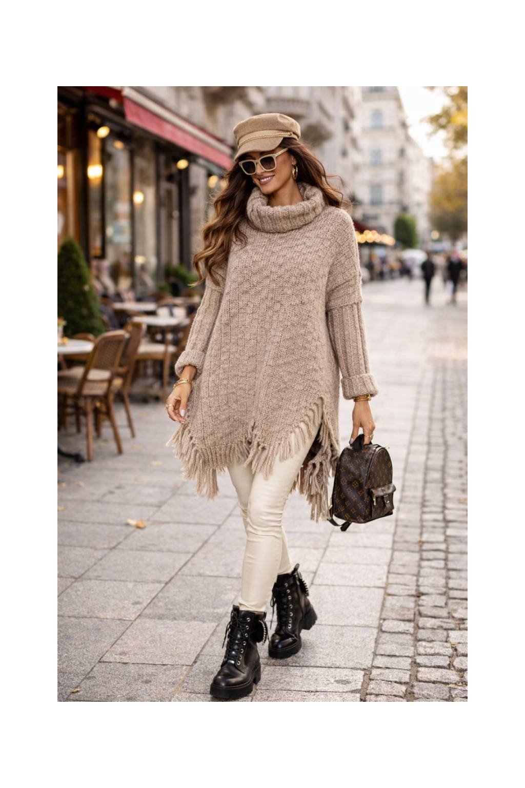 Svetr oversize s vysokým rolákem je ideální pro chladnější dny. Model s hlubokým výstřihem má asymetrický lem s krátkými třásněmi ve spodní části. K dostání ve dvou barevných provedeních. Stylové jarní pončo v latte odstínu – pohodlné, moderní a ideální na každodenní nošení. Skvělá volba pro městský lifestyle.