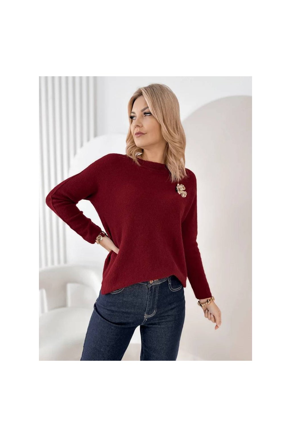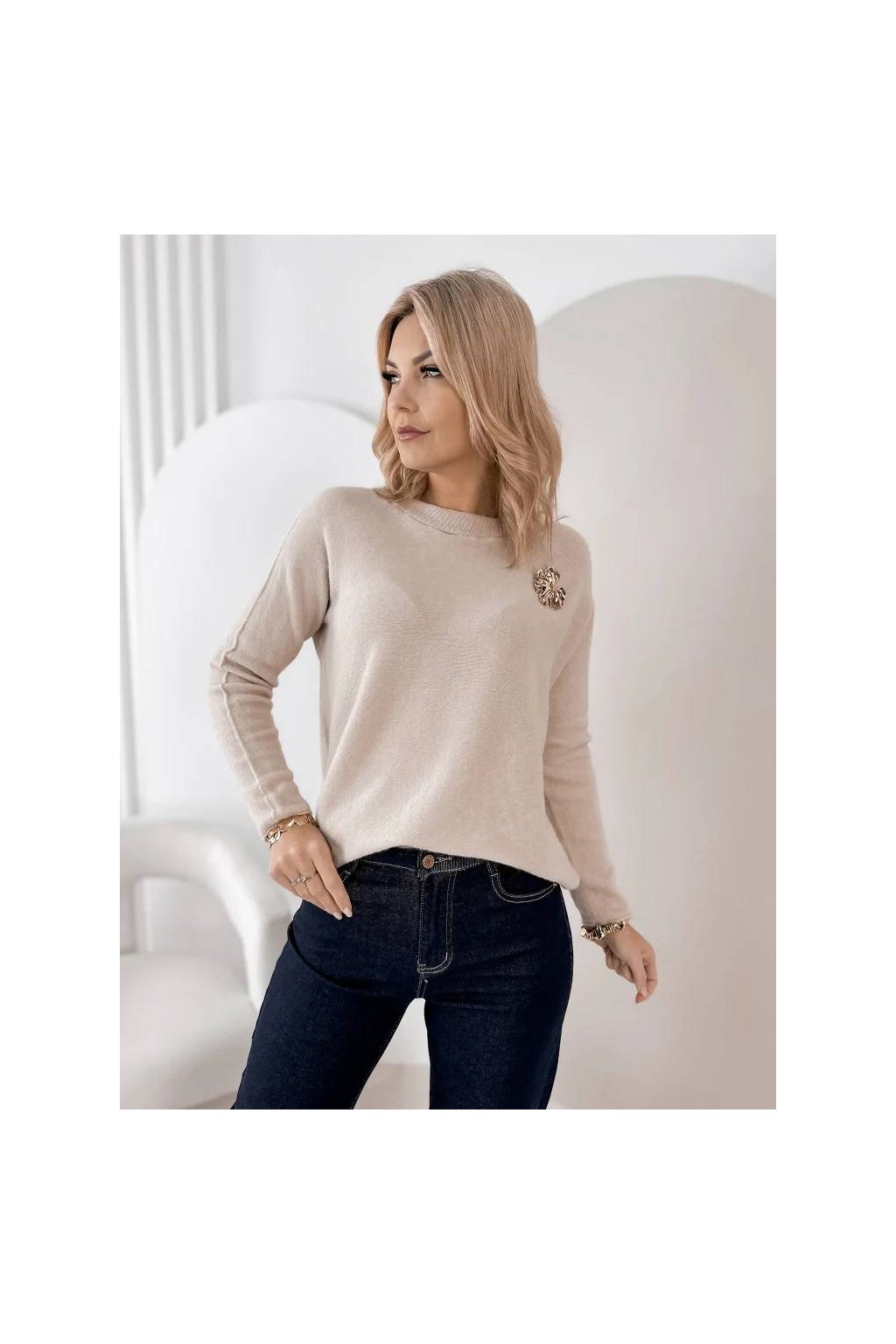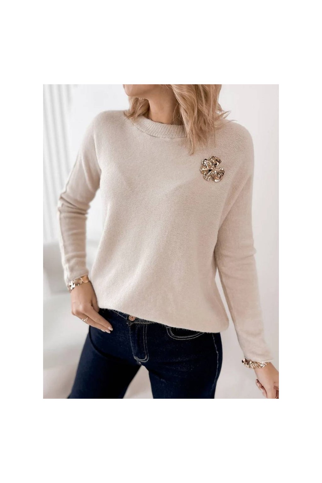 Elegantní dámský svetr s jemnou strukturou je ideální volbou pro každodenní nošení i elegantnější příležitosti. Volný střih krásně splývá na postavě a poskytuje maximální pohodlí. Ozdobná brož dodává svetru ženský a luxusní charakter, díky kterému se stane výrazným prvkem outfitu.