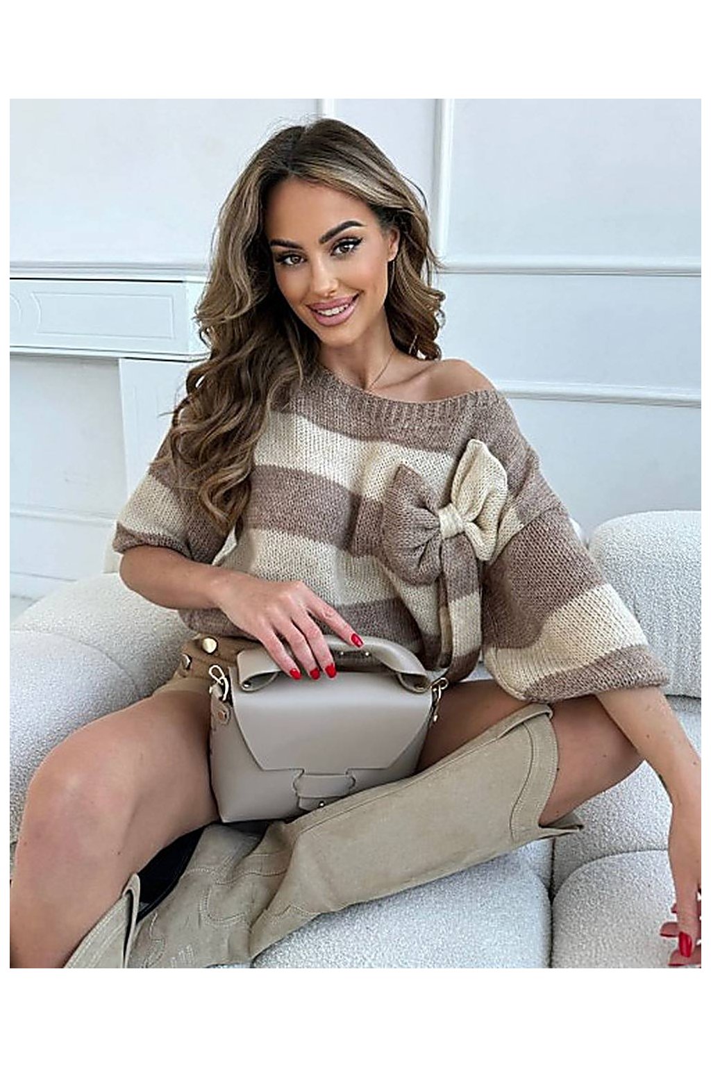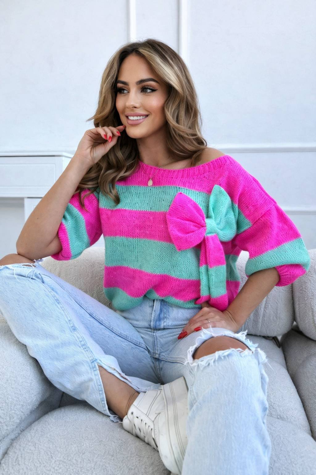 Jedinečný pruhovaný svetr je skvělým základem pro každodenní stylizaci. Svetr s lodičkovým výstřihem a kratšími rukávy má stahovací gumu v rukávech na koncích rukávů i na spodním lemu. Svetr se vyznačuje ozdobnou mašlí na látce.